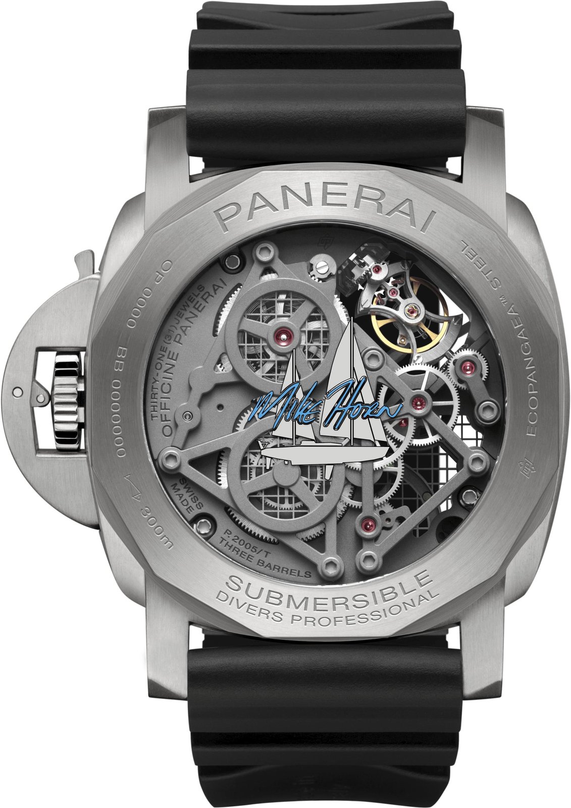 - Dodecagonal screwed case back in brushed EcoPangaeaTM steel, sapphire glass caseback with signature engraved boat silhouette.