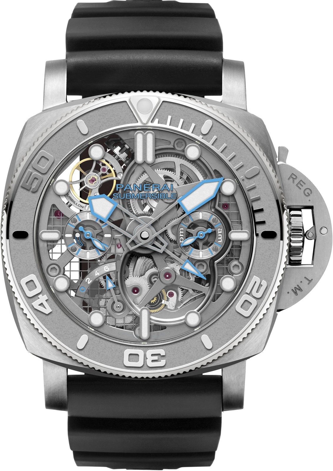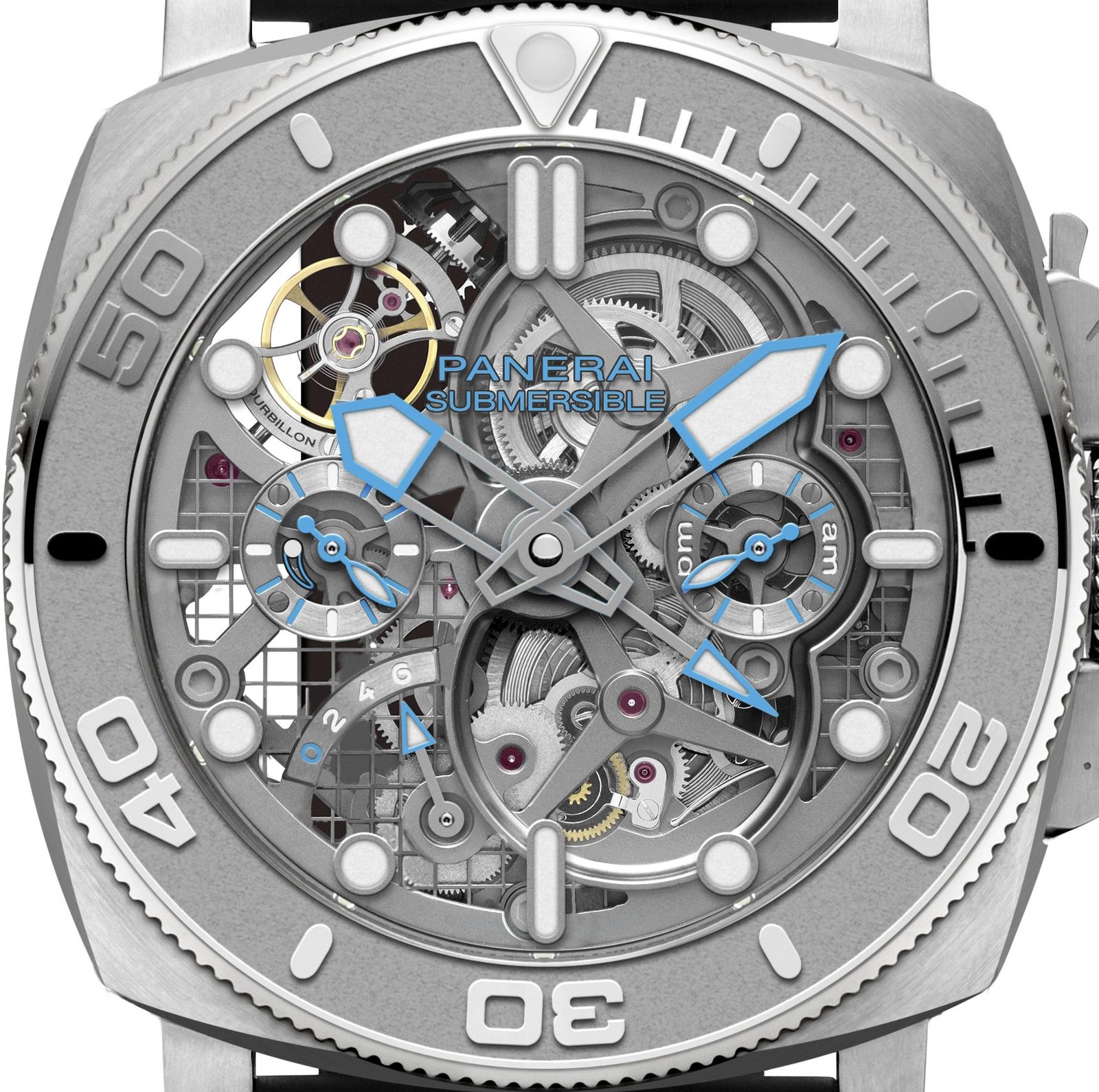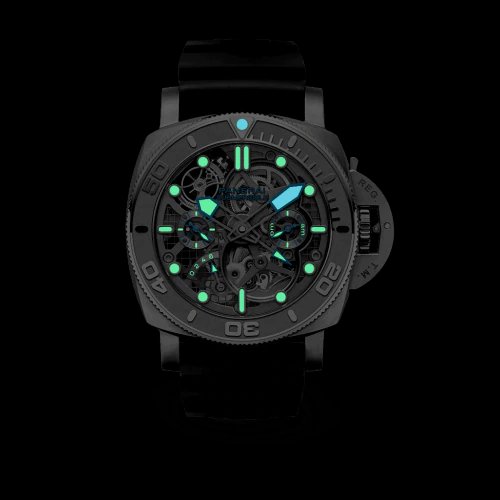 Pioneering down to its mechanics, the watch finds its ideal engine in the advanced hand-wound calibre P.2005/T, which was designed and developed entirely by the Panerai Manufacture in Neuchâtel. A skeletonized titanium movement is rooted in advanced geometries with a series of three barrels responsible for a 6-day power reserve and a 30-second tourbillon that rotates along a perpendicular axis.
