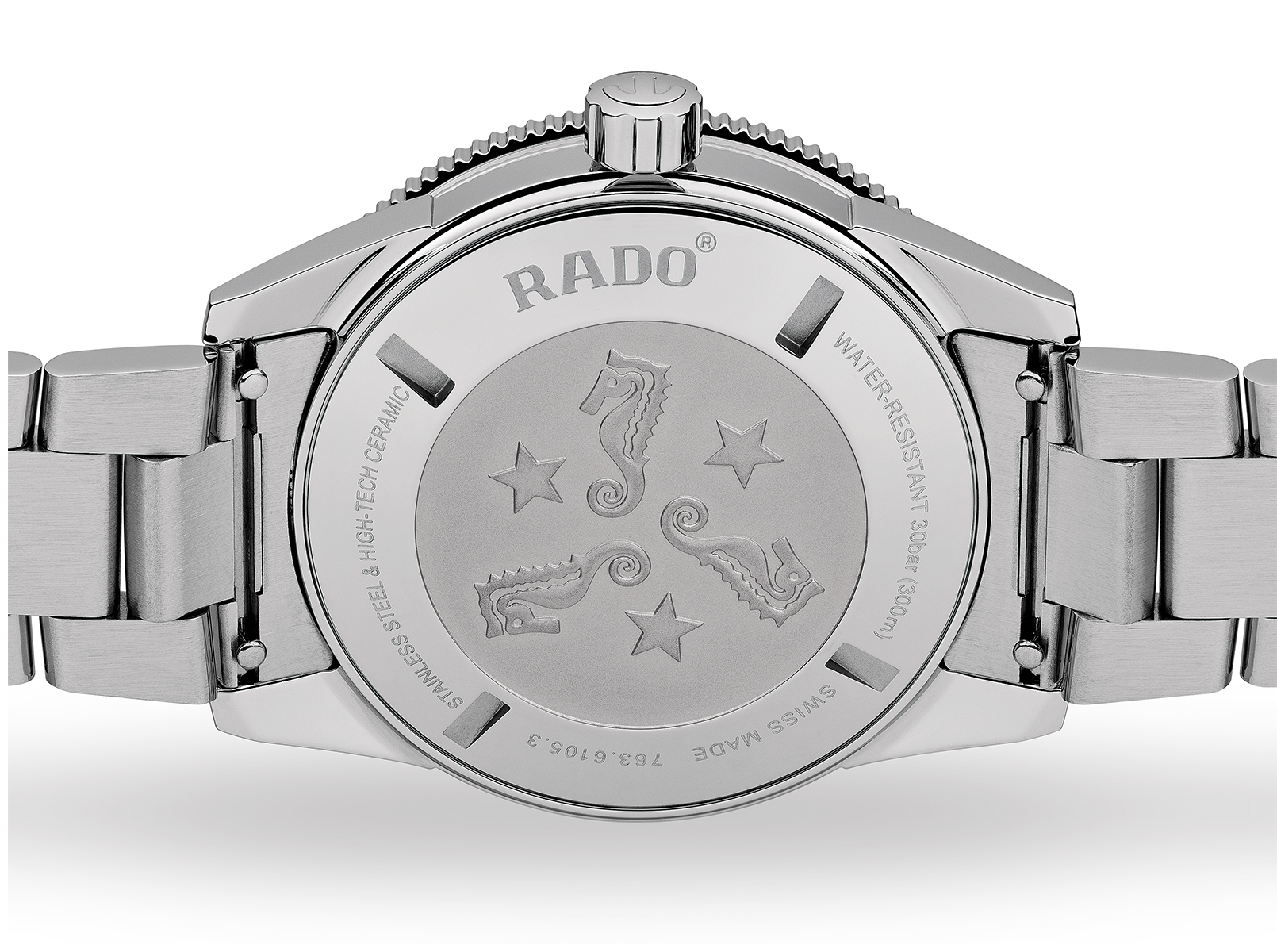 - polished stainless steel screw-down case back with 3 stamped seahorses