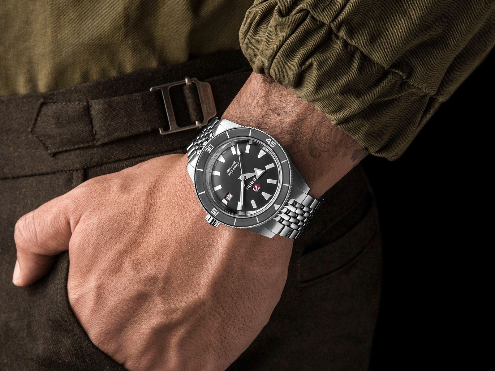 This Captain Cook is a bigger, bolder reinterpretation of an original model from the 1962 Rado archive. Distinctive, design-led and with a modern materials update, the new 42 mm Captain Cook is water-resistant to 30 bar (300m) and has already proved a hit with contemporary watch wearers and modern explorers.