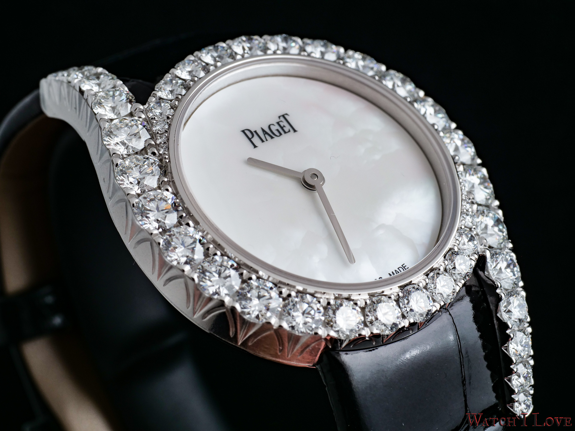 - A mother of pearl dial surrounded by 42 brilliant-cut diamonds set in a white gold case: