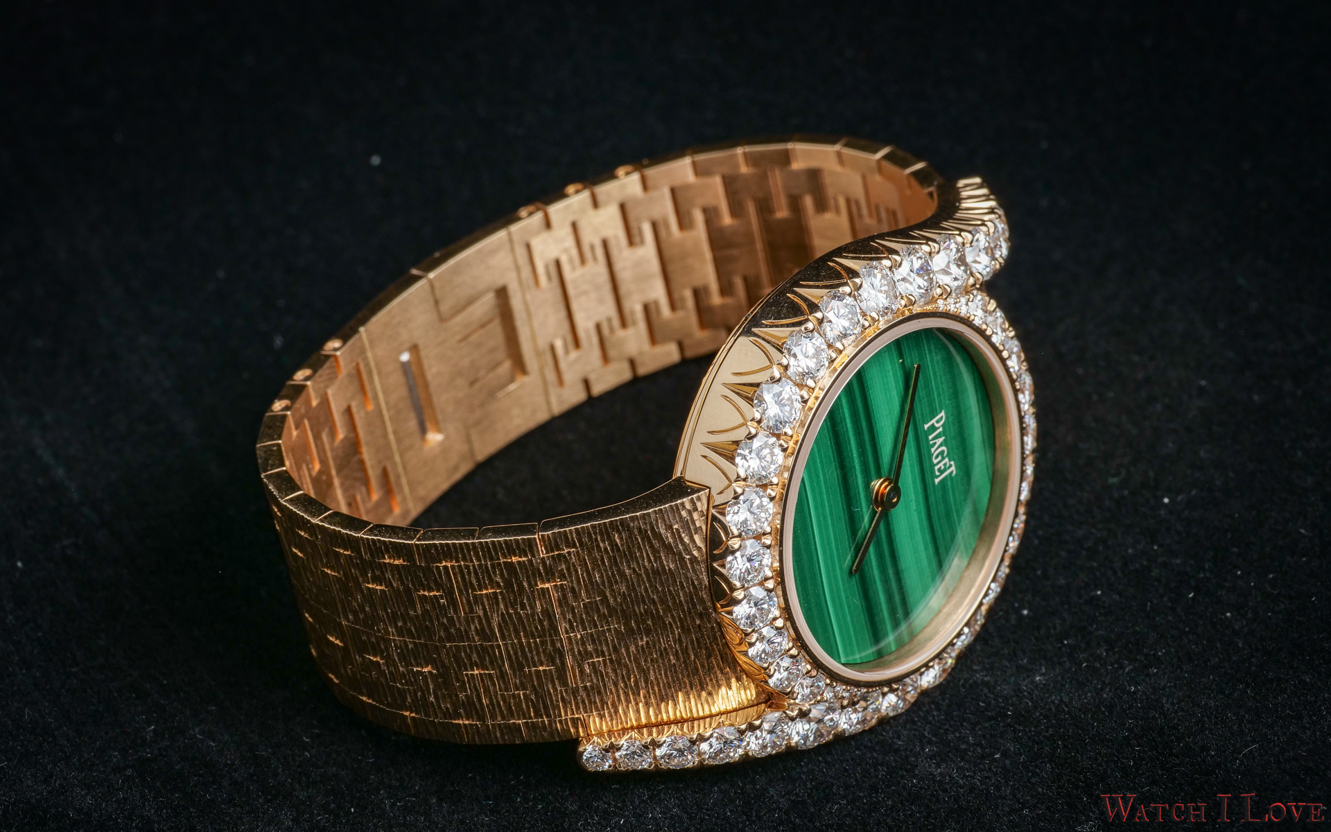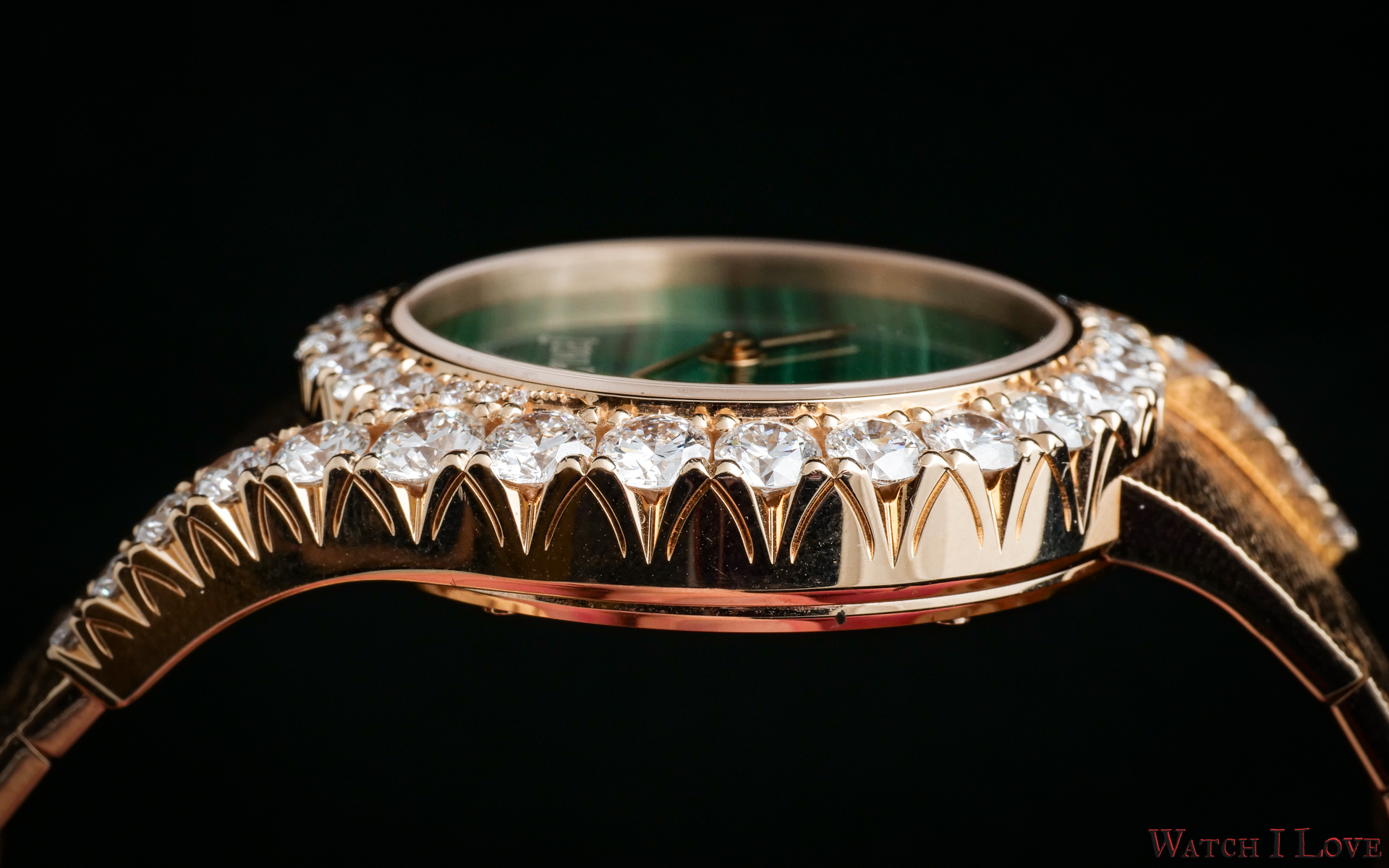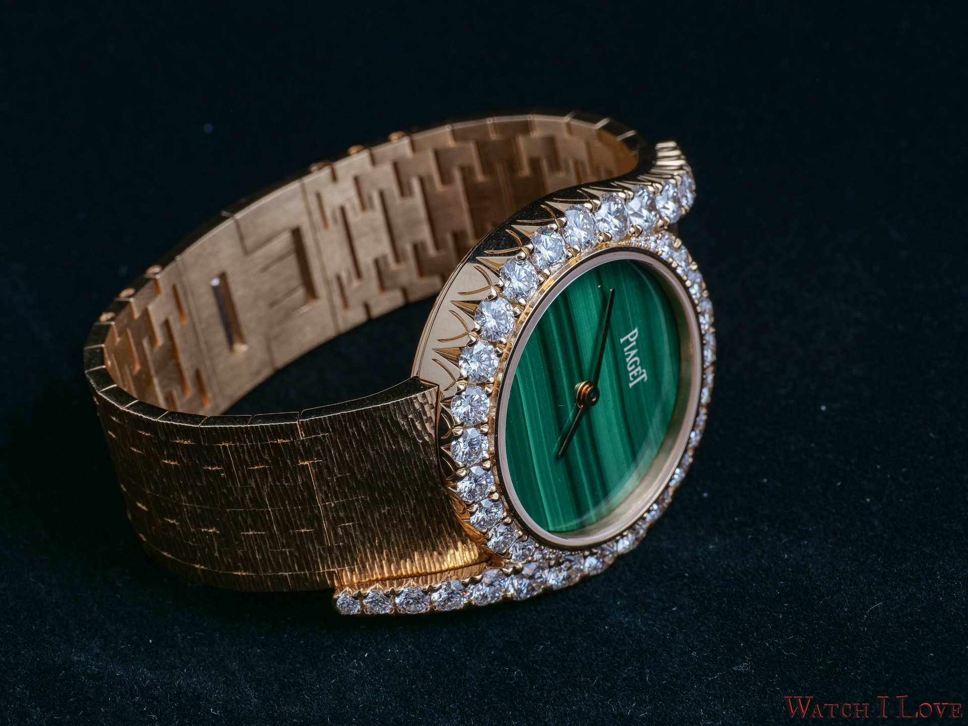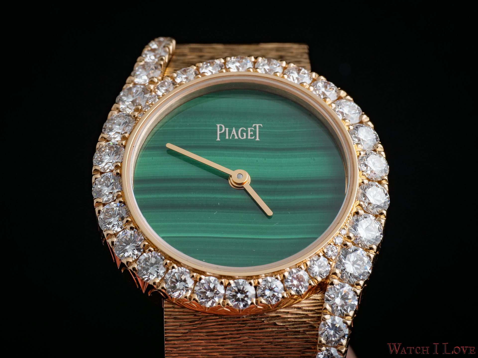 - A malachite dial (historically used by Piaget) and pink gold case set with 42 brilliant-cut diamonds and engraved bracelet: