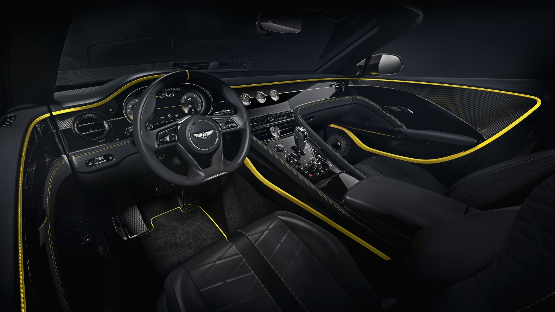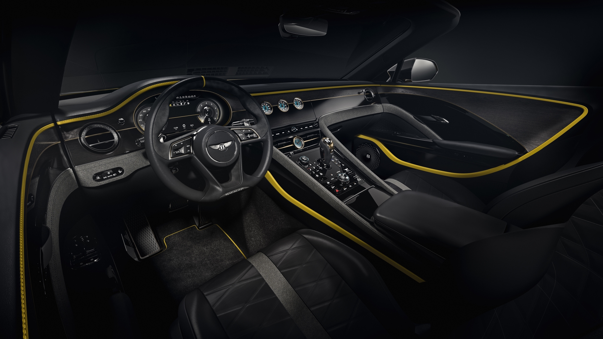Yellow Flame paint enlightens the car’s exterior, exemplified by Gloss Black highlights, showing off the Bacalar’s exterior in even greater detail. This theme continues through to the interior, where Beluga hide and Grey Tweed textile is contrasted by bright Khamun accents. Dark Bronze decorates bright ware with an exquisite and unique finish, never before seen on a Bentley. The classic combination of Open Pore Riverwood and Piano Black veneers complete the interior.
