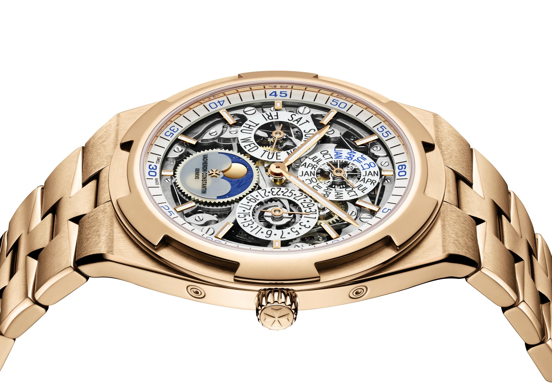 In this new gold-clad version, Vacheron Constantin highlights the expression of Haute Horlogerie values. While retaining its dynamic design, the aesthetic of the timepiece is transfigured by a sapphire dial inviting observers on a journey to the heart of the extremely thin 4.05 mm openworked perpetual calendar movement.