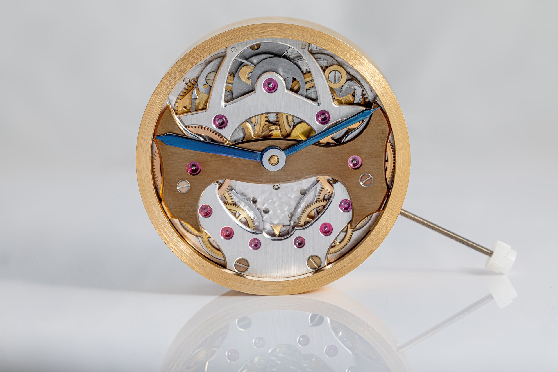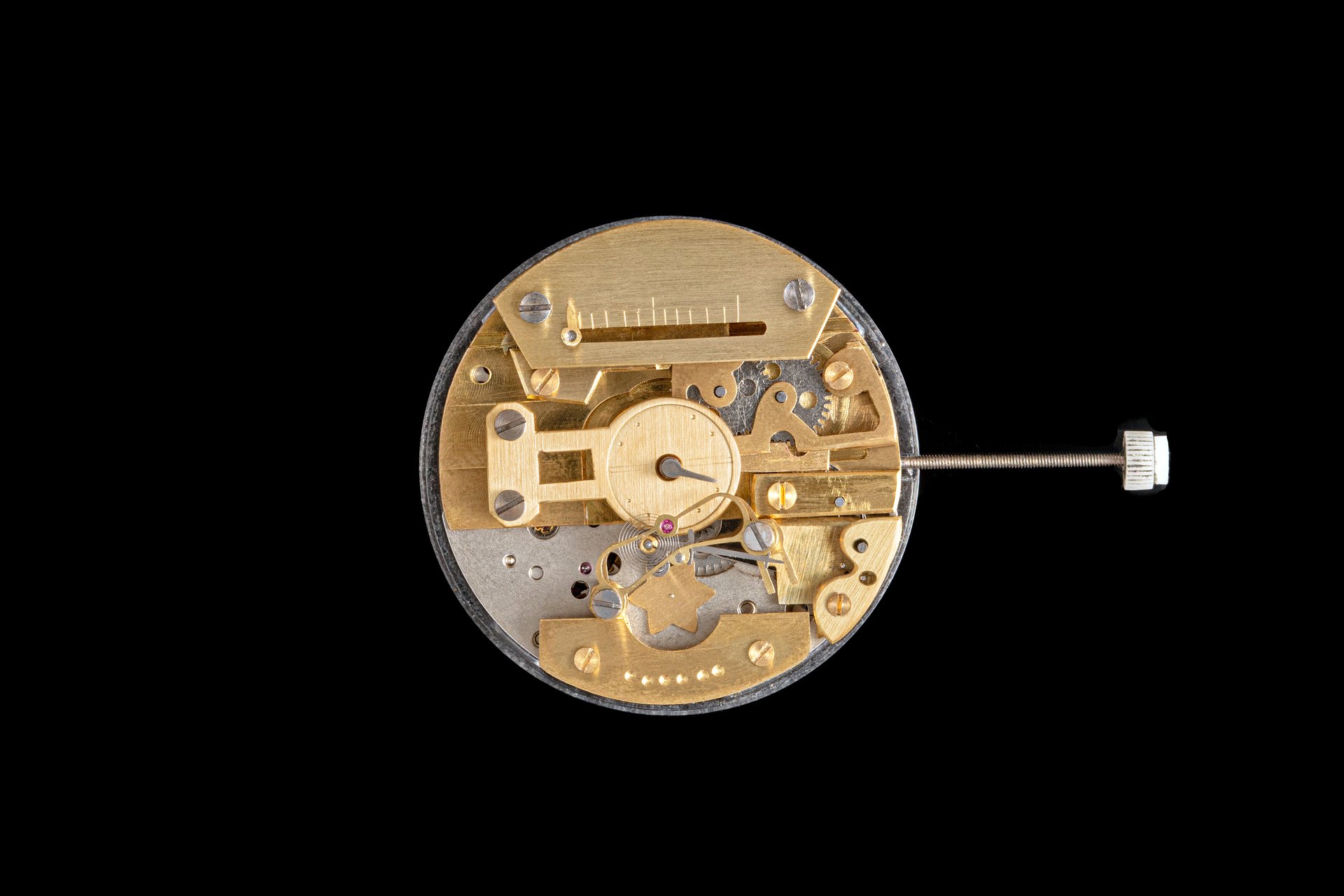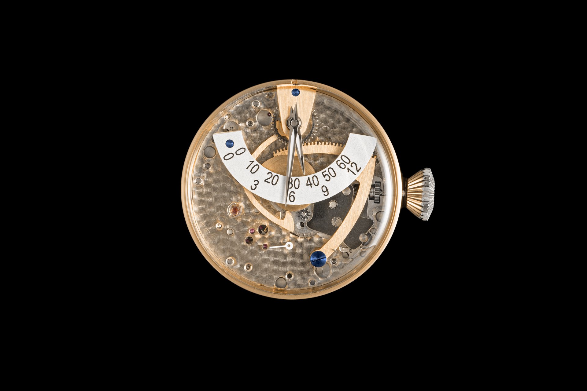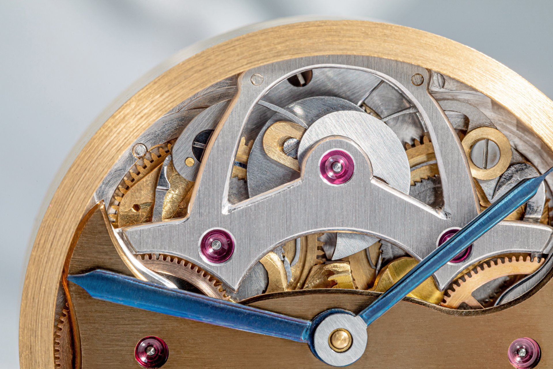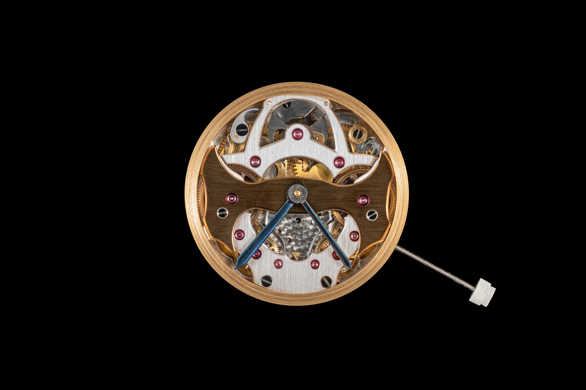His starting point was a Unitas calibre 6498-1 which he totally rebuilt and endowed with two-wheel-trains featuring centrifugal governor control for the return phase.