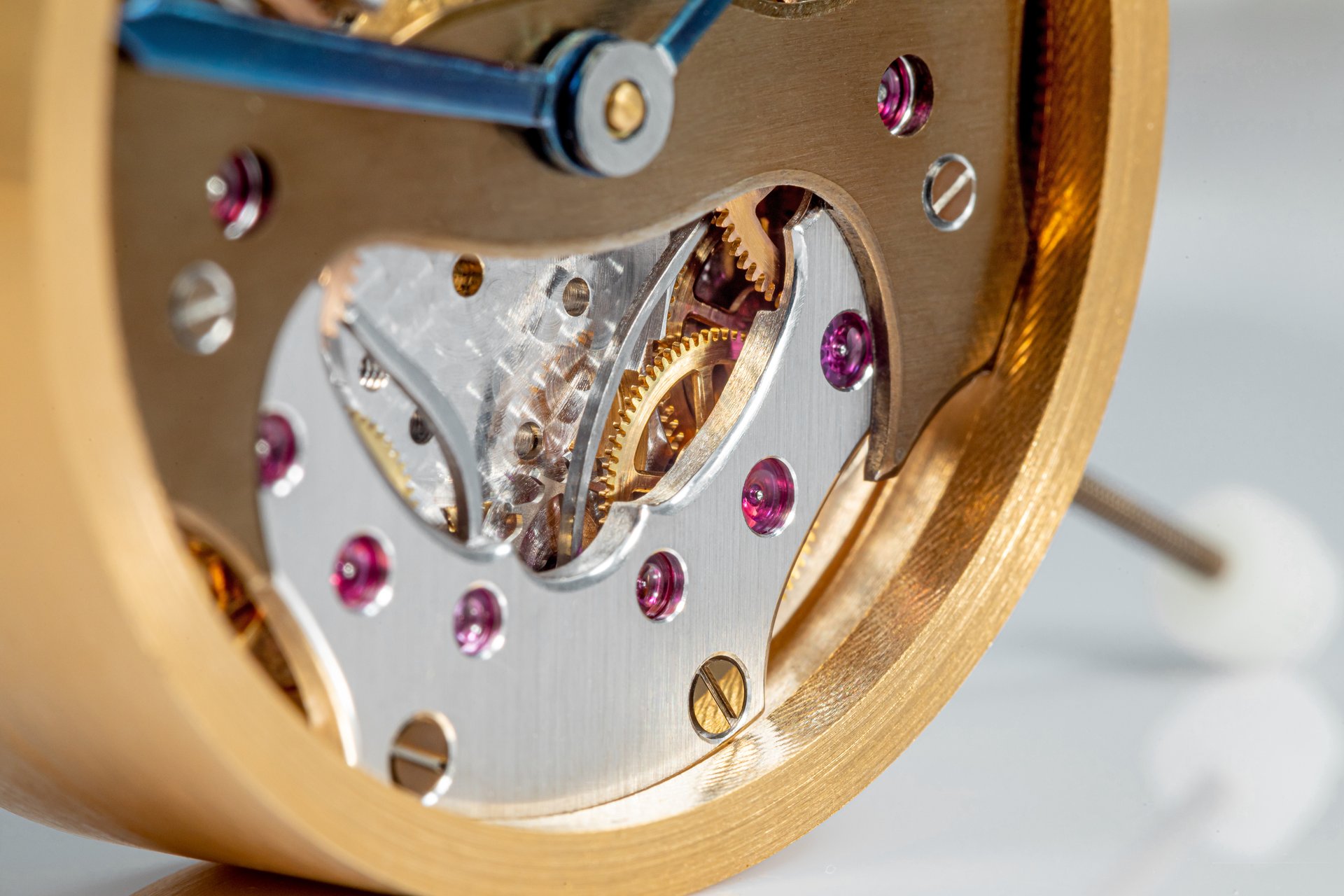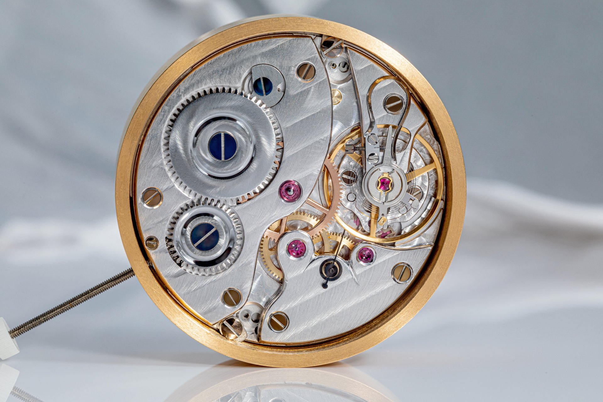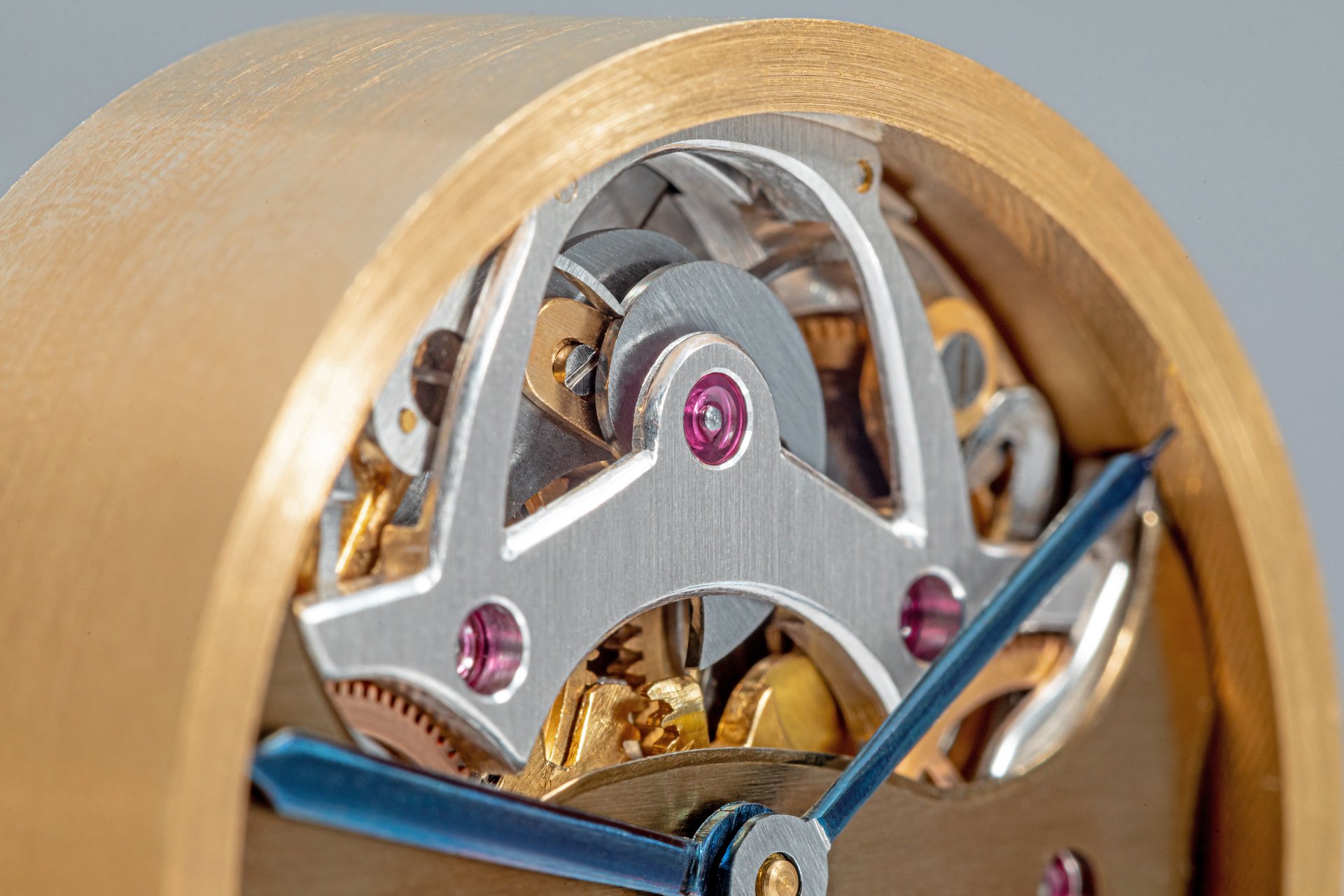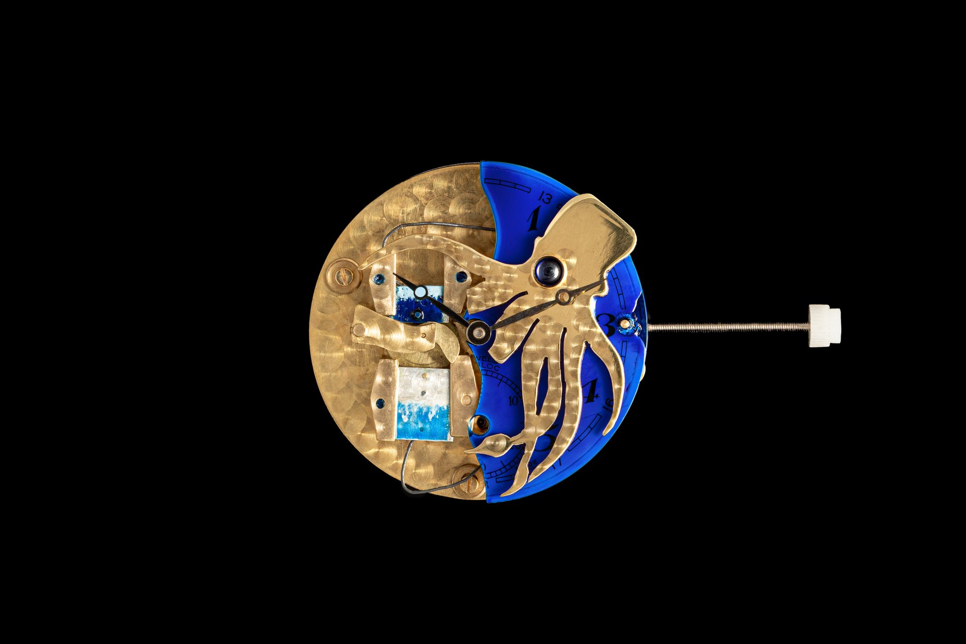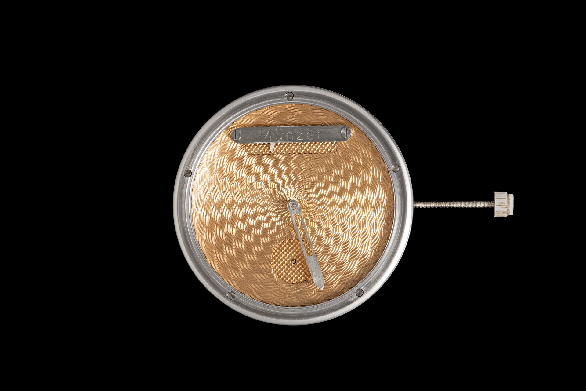 His starting point was a Unitas calibre 6498-1 which he totally rebuilt and endowed with two-wheel-trains featuring centrifugal governor control for the return phase.
