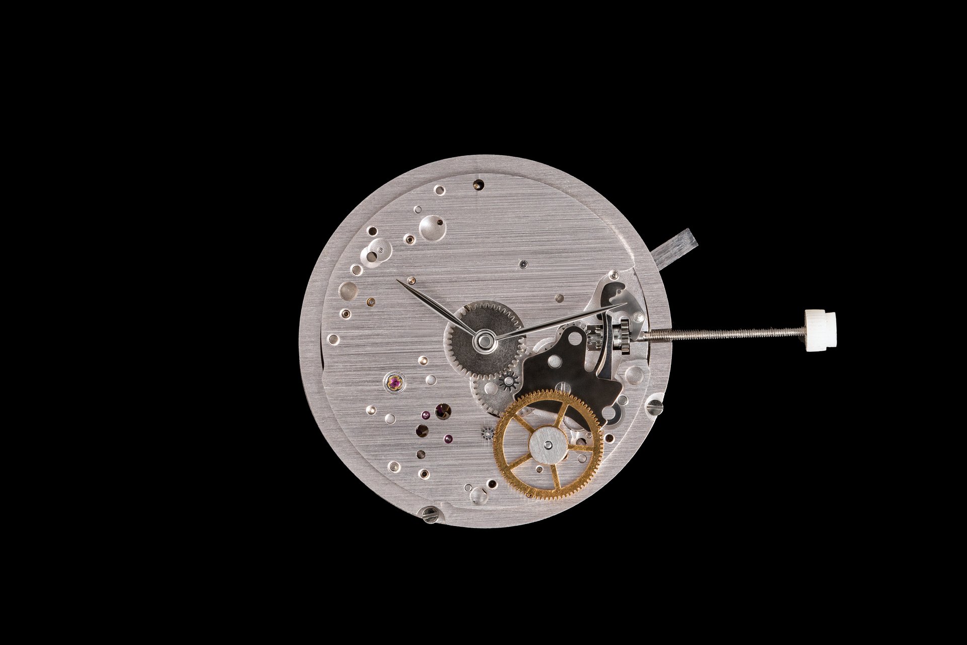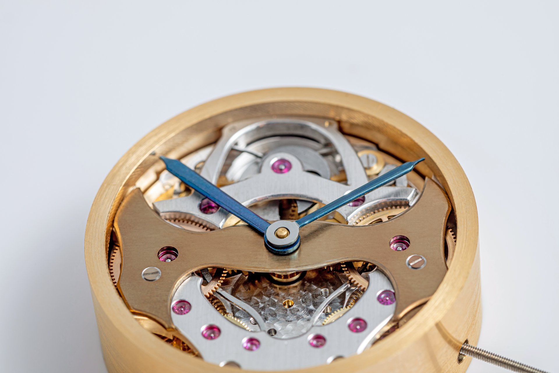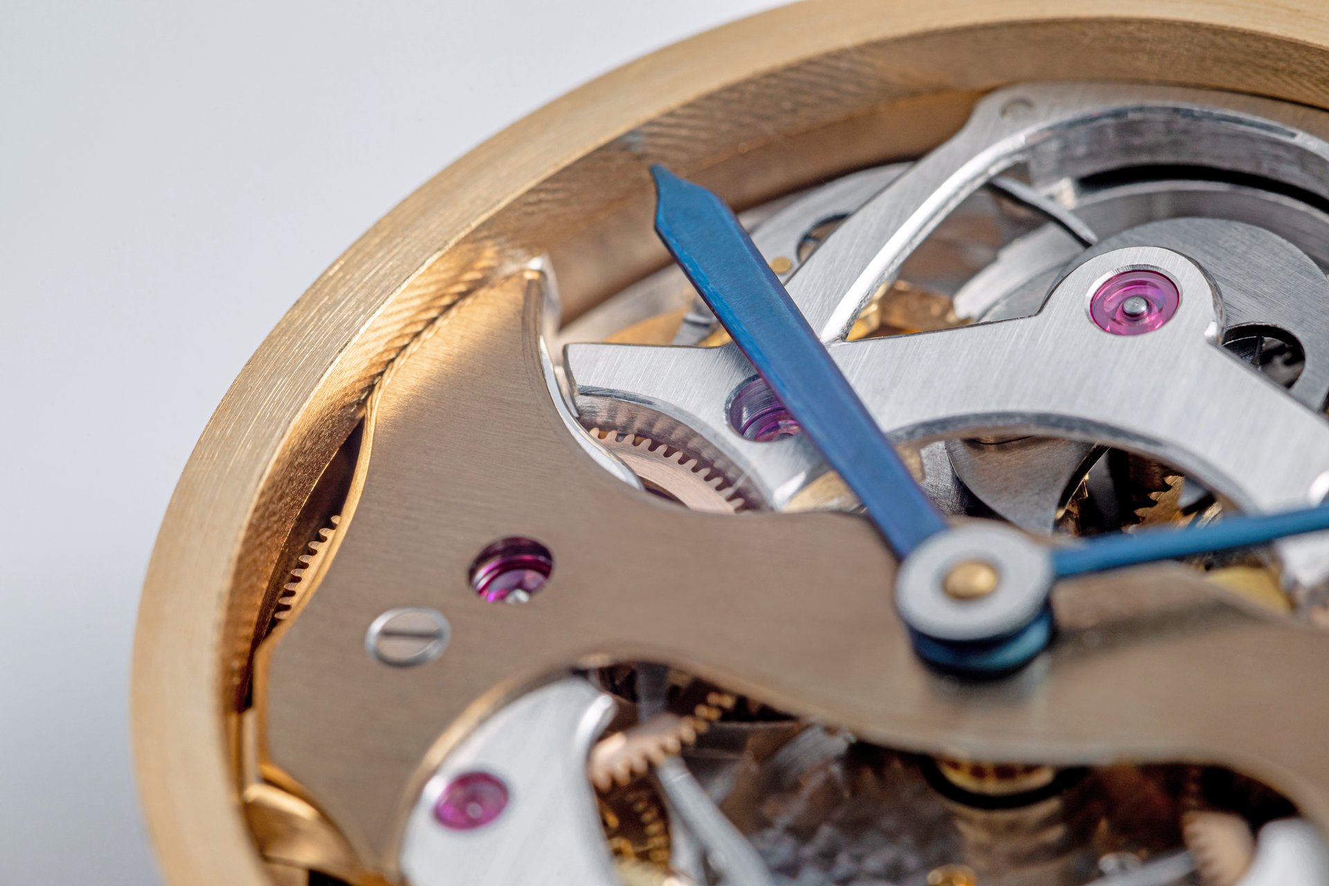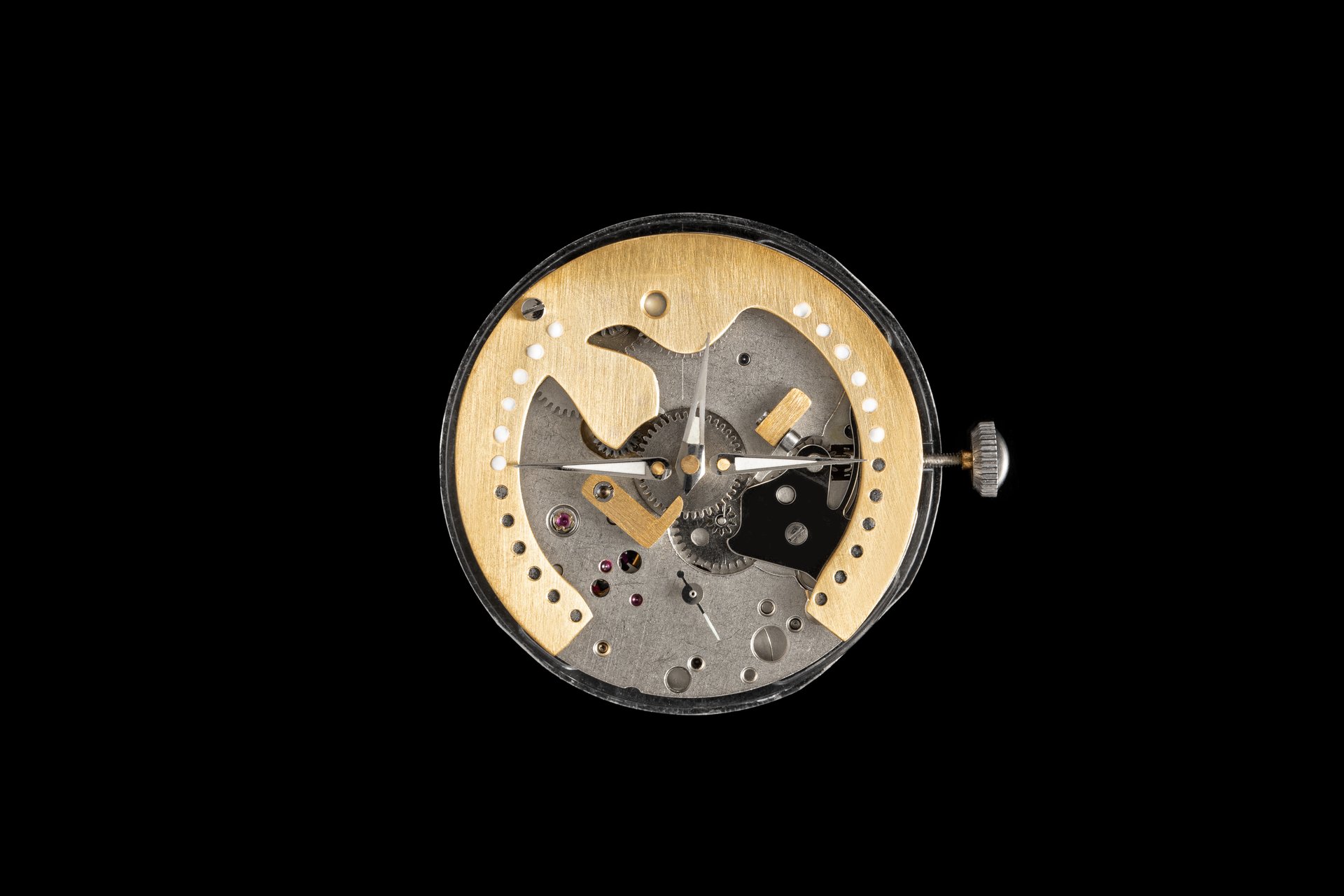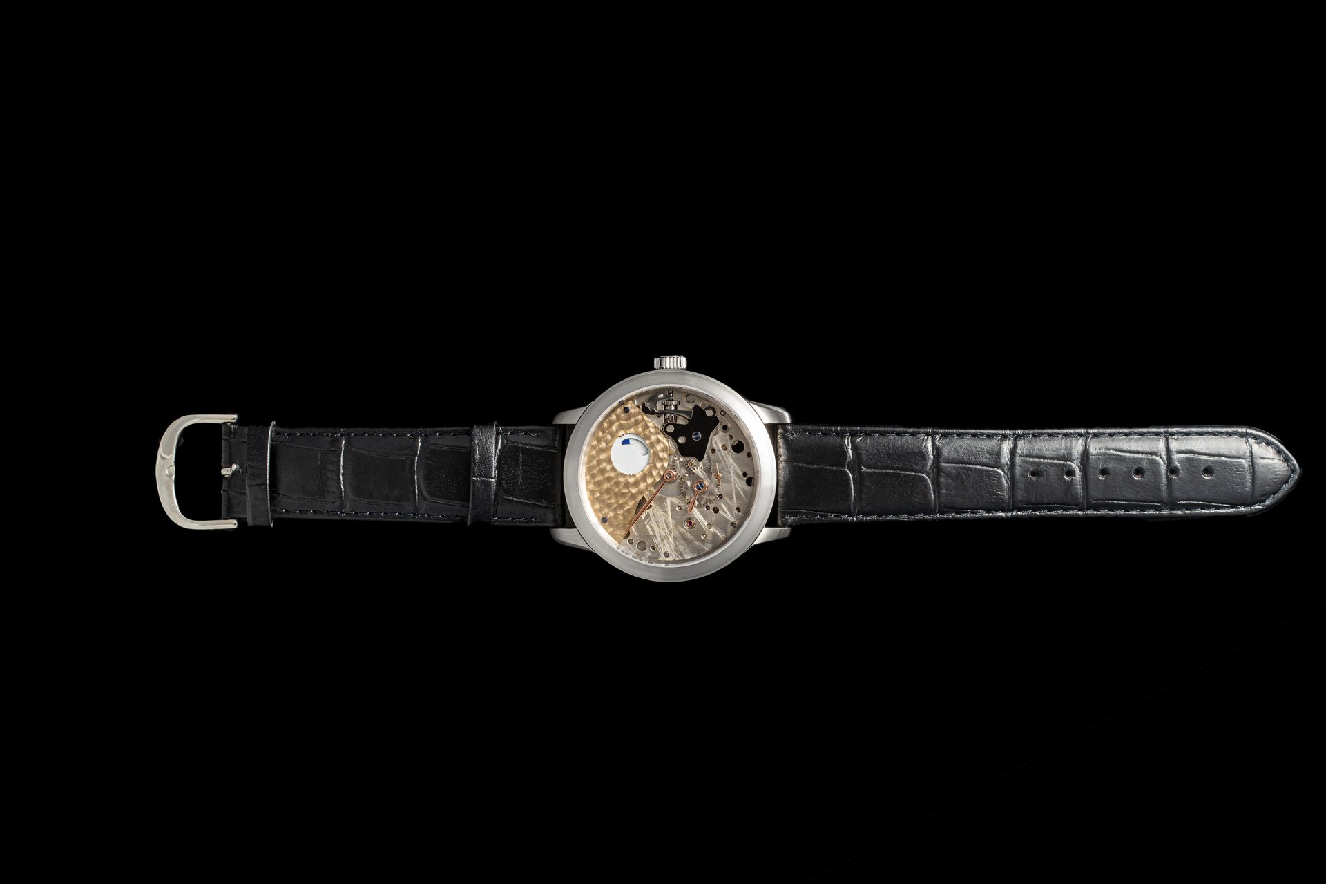 His starting point was a Unitas calibre 6498-1 which he totally rebuilt and endowed with two-wheel-trains featuring centrifugal governor control for the return phase.