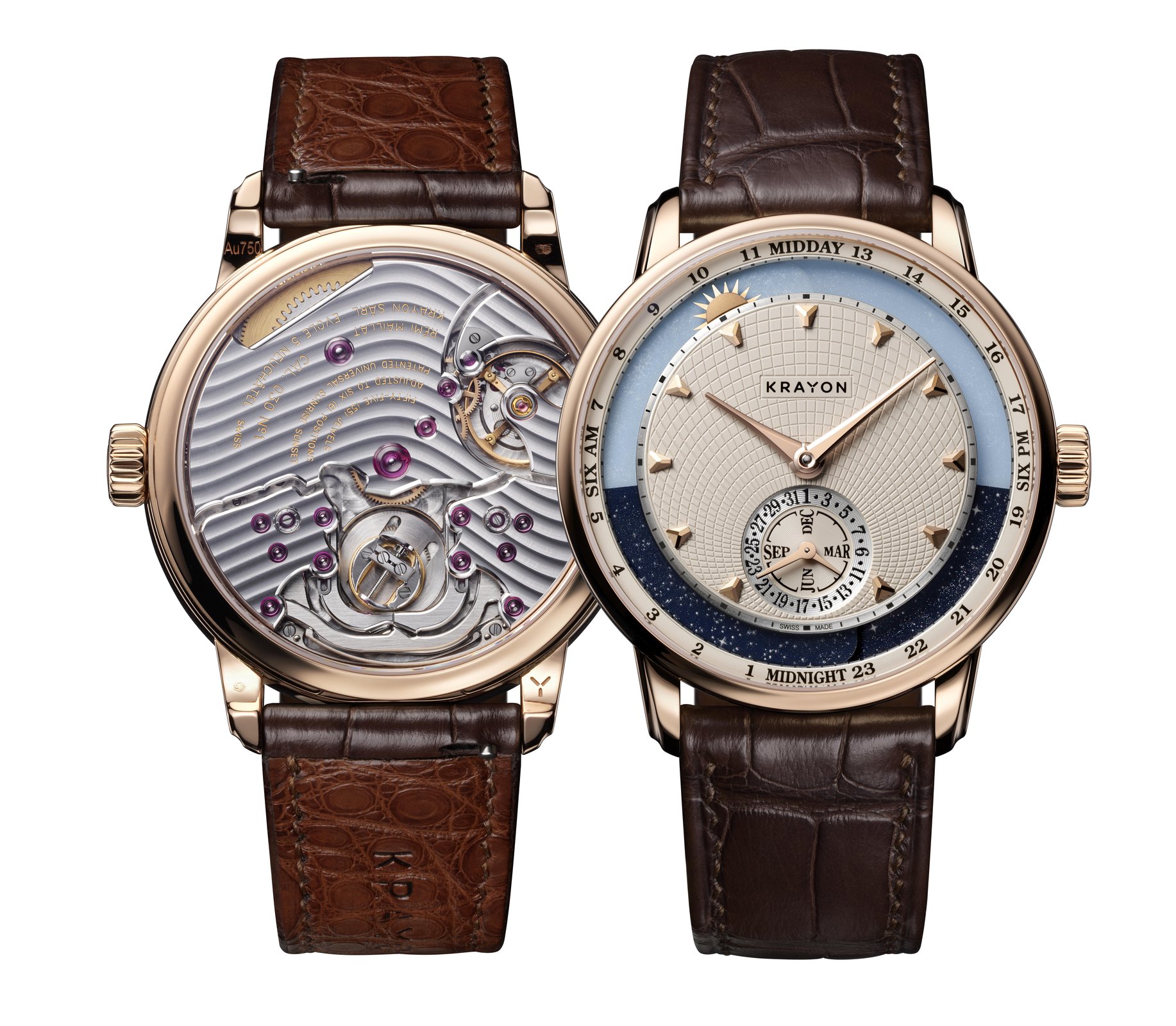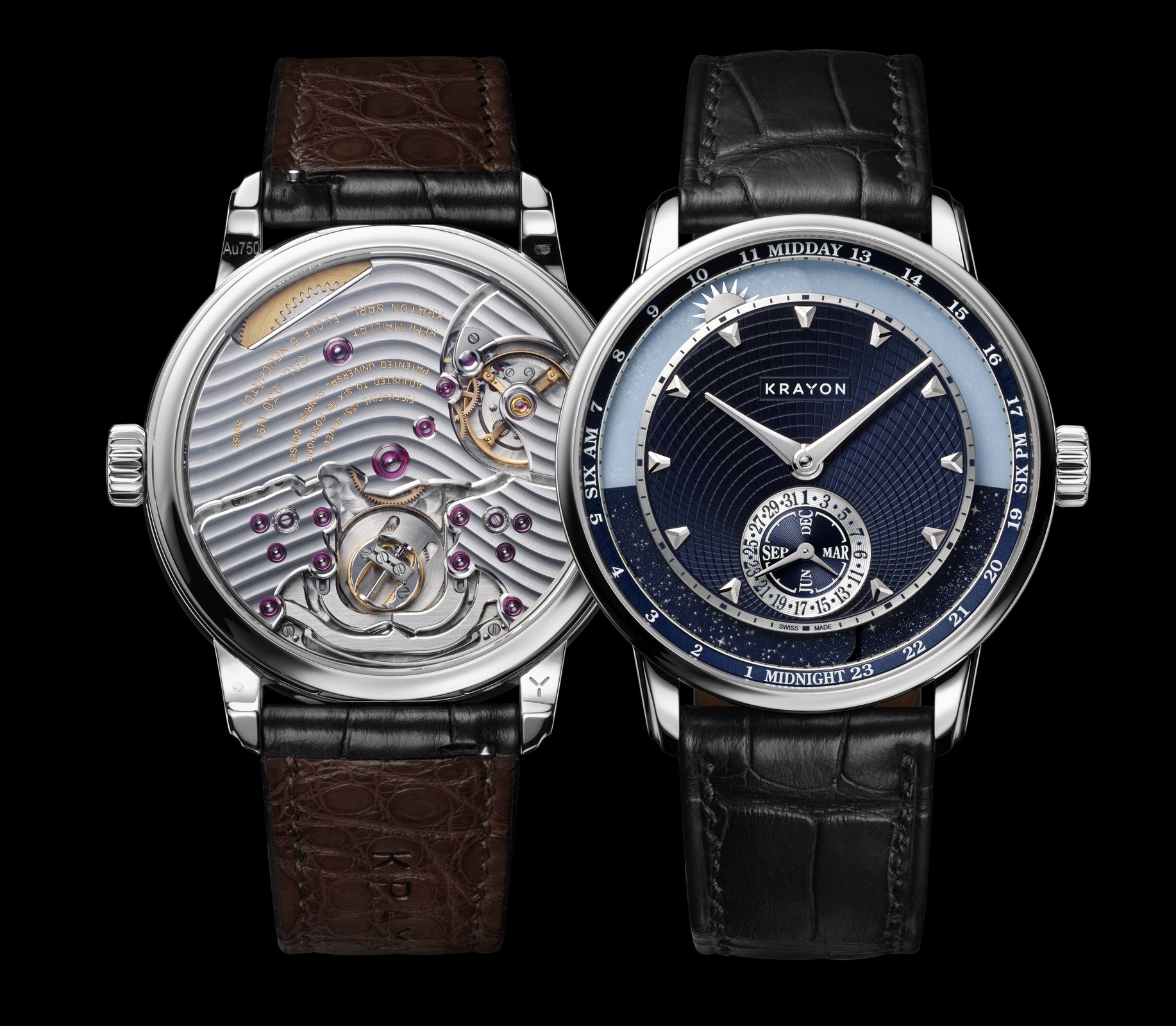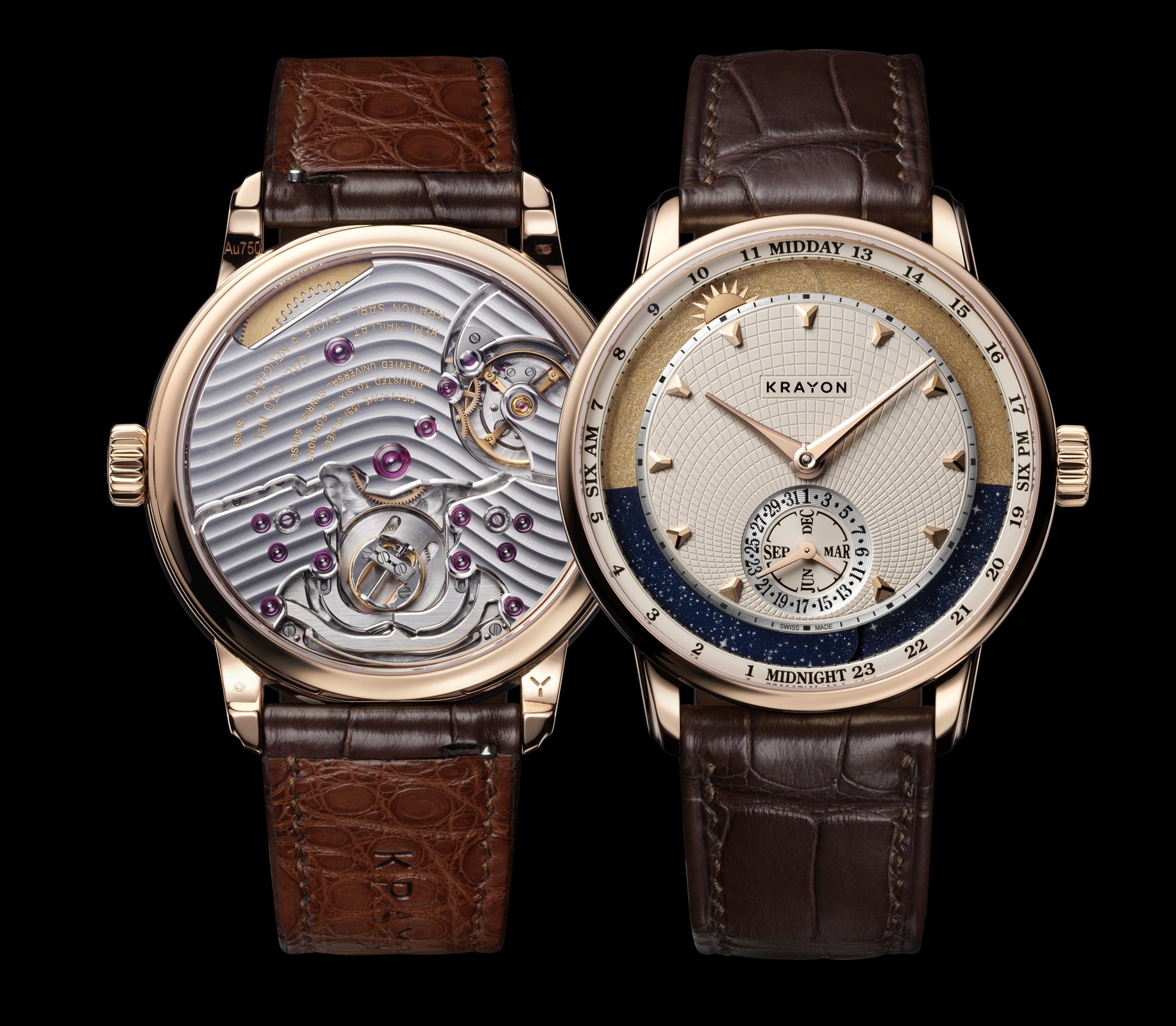 Time is something intrinsically personal. For watchmakers, however, it is above all a dimension of space that can be measured objectively. Krayon Anywhere unites these two aspects through the complication that is its raison d’être: the moment when day and night transition from one to the other, the time of sunrise and the time of sunset.