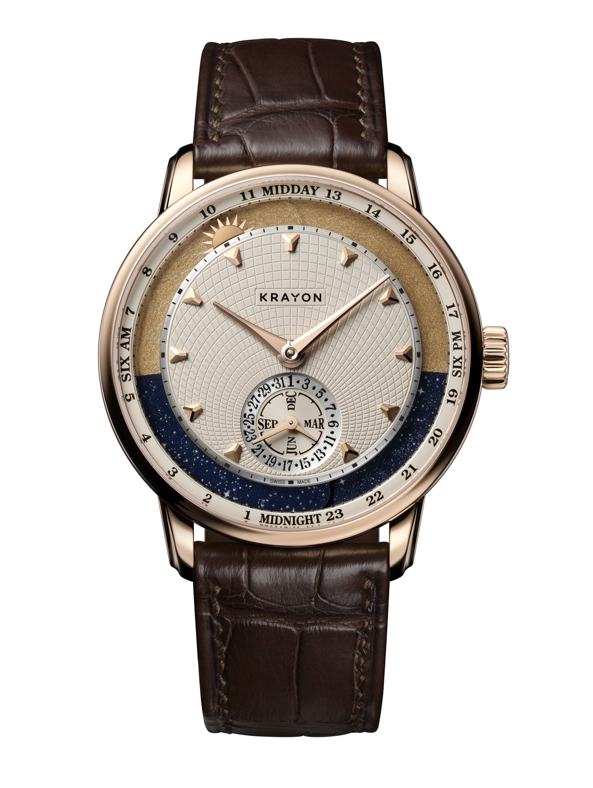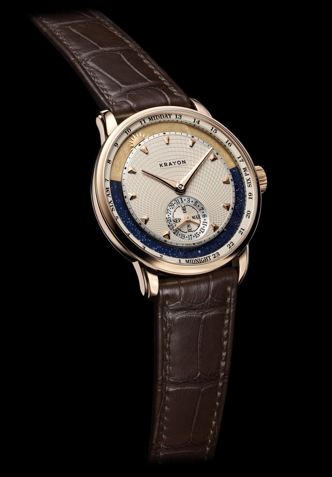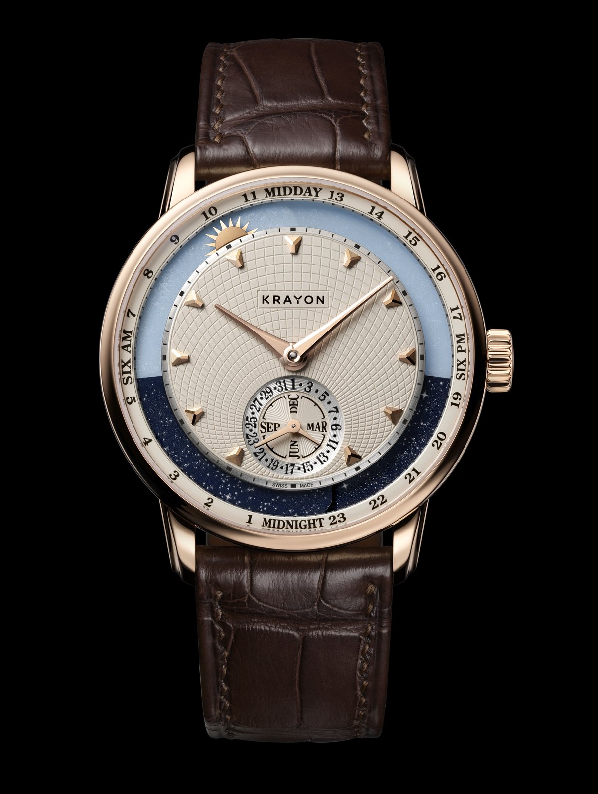 Time is something intrinsically personal. For watchmakers, however, it is above all a dimension of space that can be measured objectively. Krayon Anywhere unites these two aspects through the complication that is its raison d’être: the moment when day and night transition from one to the other, the time of sunrise and the time of sunset.