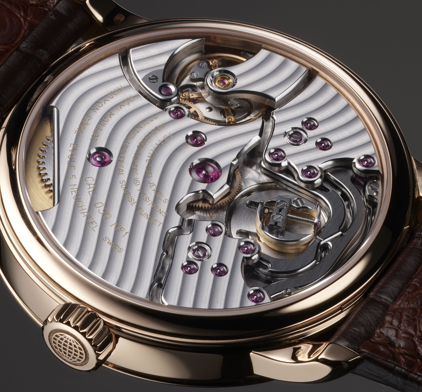 As with Everywhere, the Anywhere calibre was also meticulously conceived and constructed by Rémi Maillat, watchmaker and founder of Krayon. It is a new movement, dedicated and designed for Anywhere, offering a power reserve of 86 hours. Of a certain width to accommodate both day and night discs, it is very thin in view of its complexity: At only 5 mm, it allows a case thickness of just 9 mm.