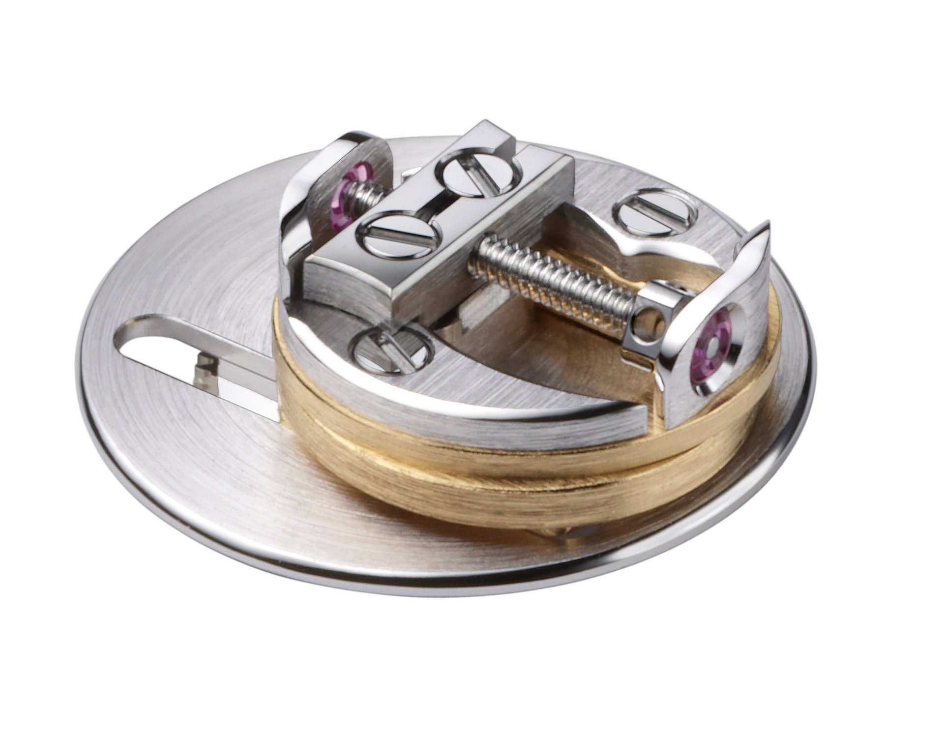 The regulating mechanism for the day and night discs is located at 6 o’clock. Immediately setting the Anywhere movement apart from all others, it shows the intricacy of racks and yokes, with a distinctive screw system in the centre. On either side, two discreet screws facilitate adjustment by the watchmaker.