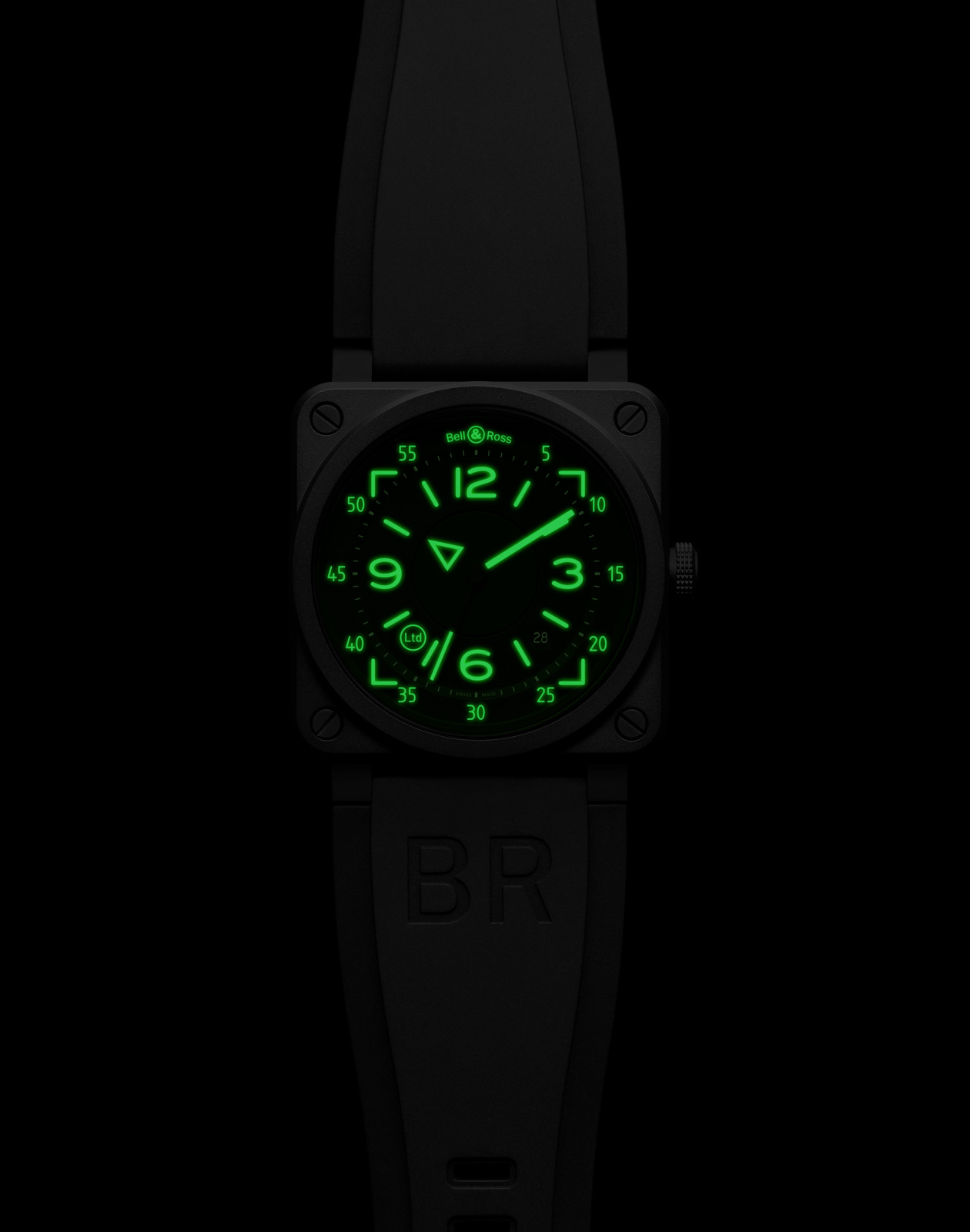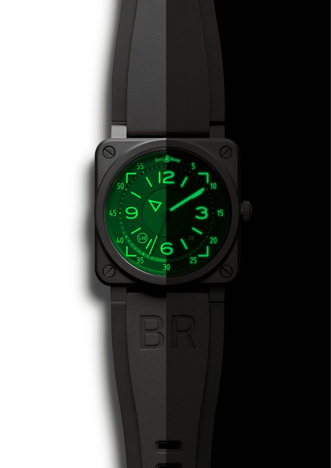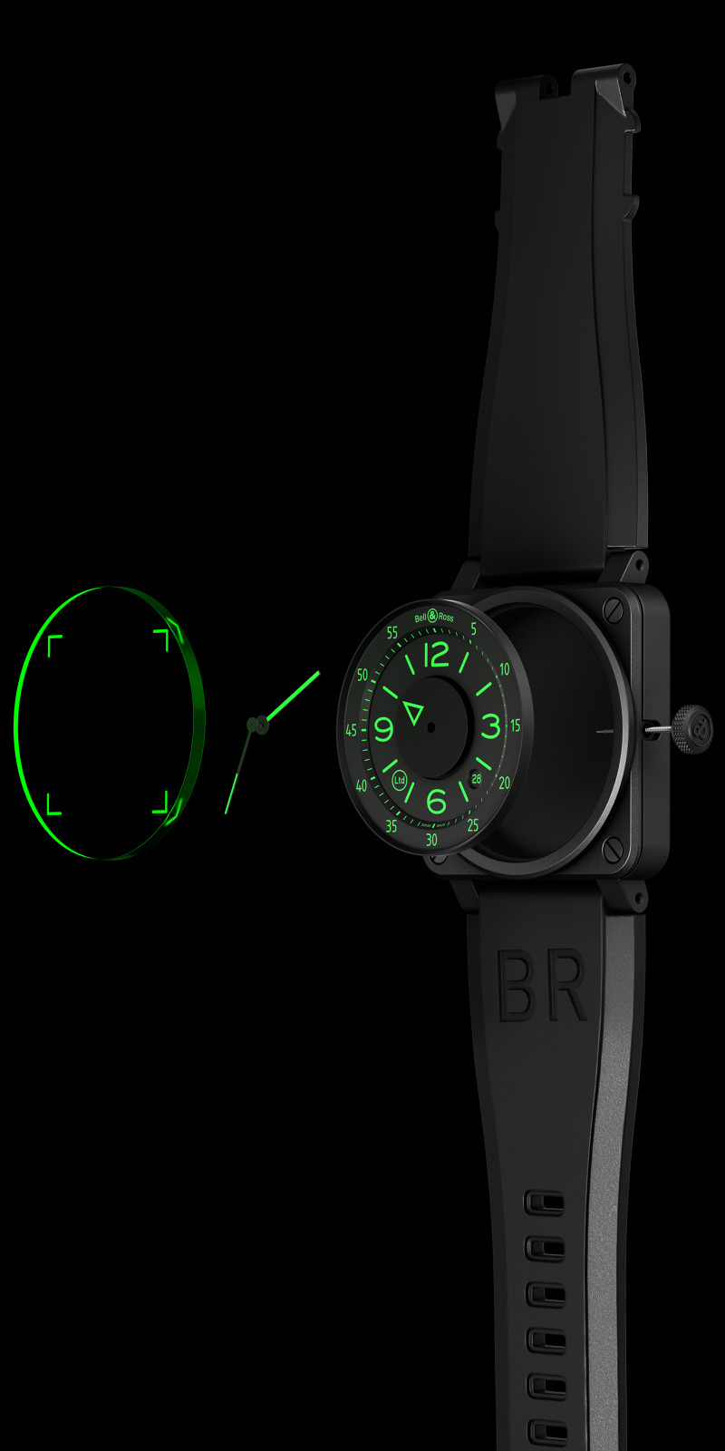 Furthermore, the BR03-92 HUD fits perfectly into the family of instrument watches with the objective of optimum readability under any circumstances. To provide an intense green light, the Hours numerals, indices, triangle as well as the minute-circle and hands are coated with green Super‑LumiNova® C3 treatment. The ladder is also applied on the 4 brackets.