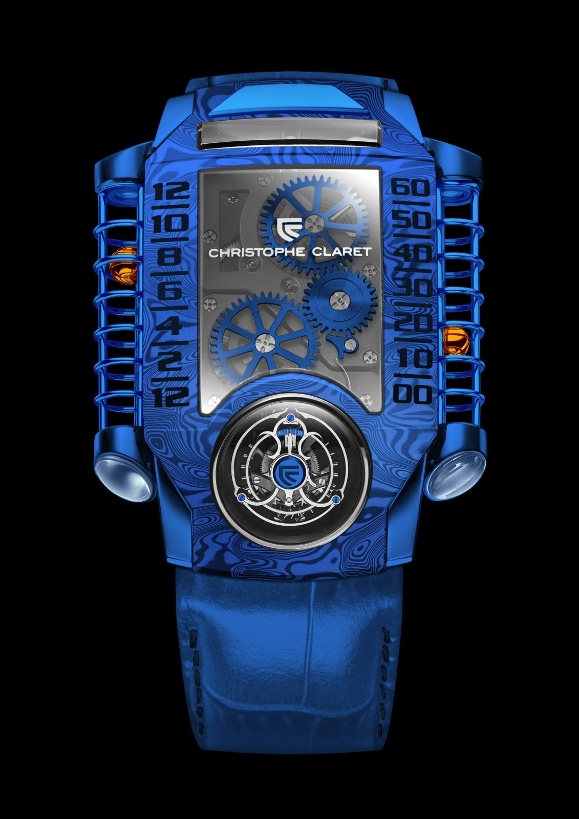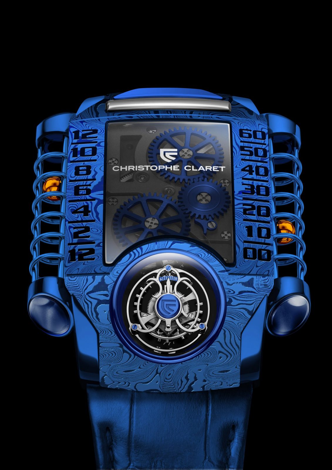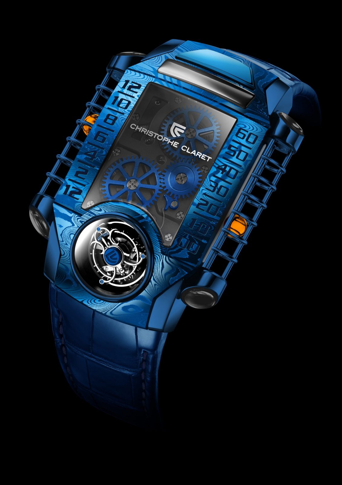 Four years after unveiling the X-TREM-1 timepiece, the watchmaker from Le Locle reveals two new versions in blue damascened steel, issued in 8-piece limited edition – the Christophe Claret X-TREM-1 Blue Damascus. X-TREM-1, the first of a generation of exceptional timepieces, represents a major technical and aesthetic accomplishment: a flying tourbillon inclined at a 30° angle, mounted on a three-dimensional curvex titanium mainplate, equipped with a retrograde hours and minutes display system that is radically different from existing watchmaking conventions. Two tiny hollowed steel spheres, isolated within sapphire tubes on the left and right sides of the caseband, magically move with no mechanical connection thanks to magnetic fields.