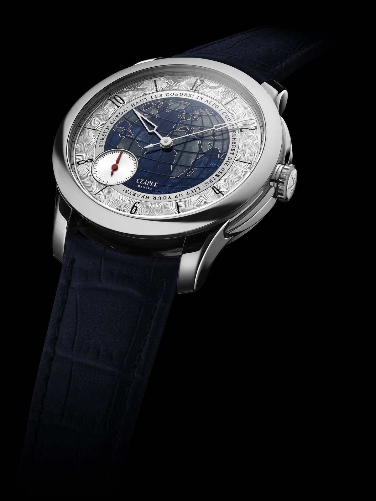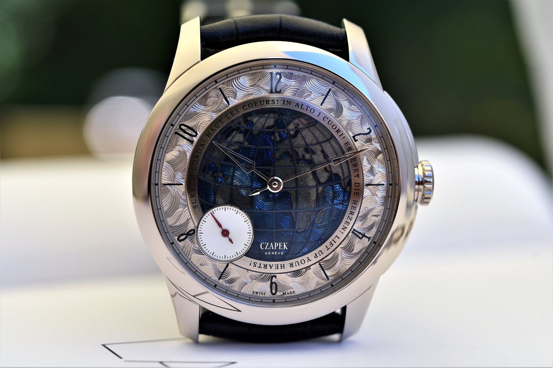 Although looking like a world timer, the watch is in fact powered by the Czapek manually wound proprietary SXH calibre, which features: hours, minutes and small seconds functions, along with an impressive 7-day power reserve.