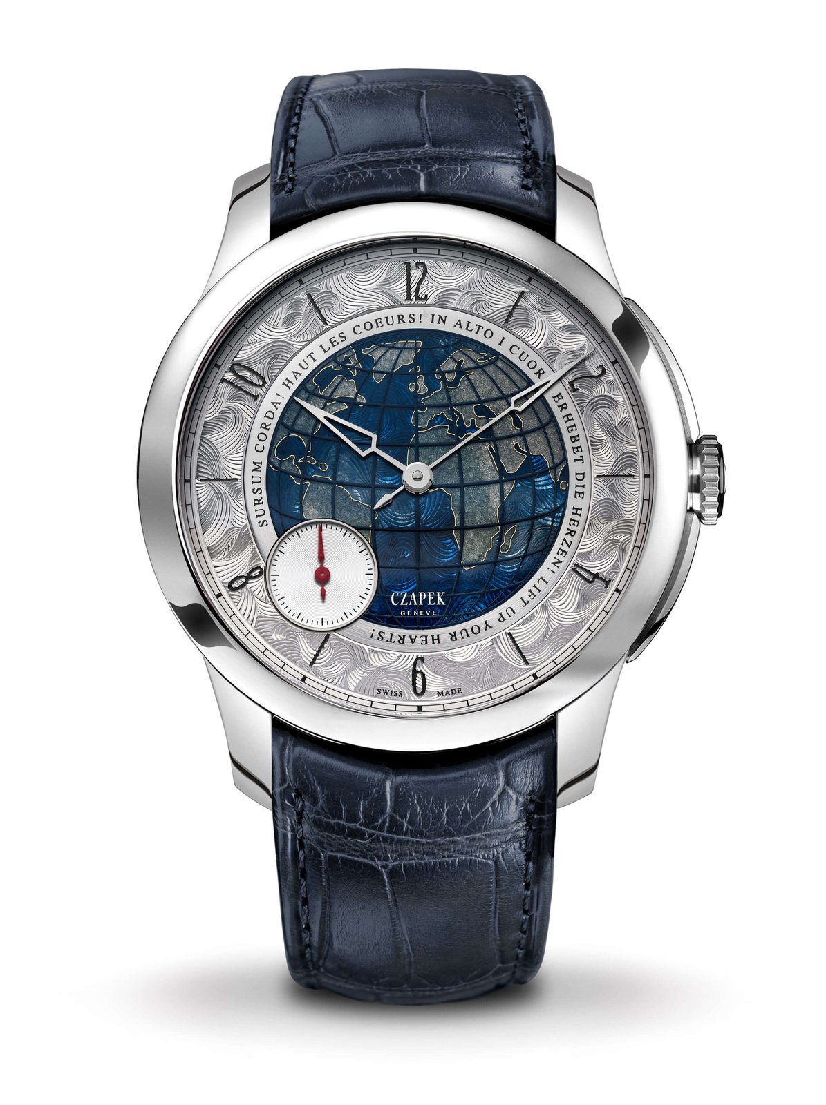 The timepiece is based on the Quai des Bergues calibre and gold case – the company’s first collection. The Sursum Corda dial features the best of metiers d’art: a world map in cloisonné enamel enclosed within a brushed white gold ring, and an outer hour ring with beautiful hand engraved waves. Laser blasting, cutting and soft sandblasting are employed to create a velvet effect. The base plate of the dial was cast by Precinox in La-Chaux-de-Fonds, and is made from a special white gold alloy in order to facilitate all these techniques. The cloisonné world map is made by Donze Cadrans. The continents are displayed in a blue/grey finish and softly blasted to feature the terrain. Each continent is then contained within thin (0.1 mm) walls of white gold, barriers against the five seas which are finished in turquoise. The ring encompassing the world bears the Latin inscription “Sursum Corda” – along with its English translation “Lift Up your Hearts”. Additionally, the motto is also shown in the three main Swiss languages, French, German and Italian. Finally, hand-engraving of the outer ring was executed by master engraver Michele Rothen, following a design by Adrian Buchmann. The hand-engraving of the dial took more than 40 hours to complete. Other dial features – such as the small seconds sub-dial, inscriptions ring and hour ring, were manufactured by Metalem.