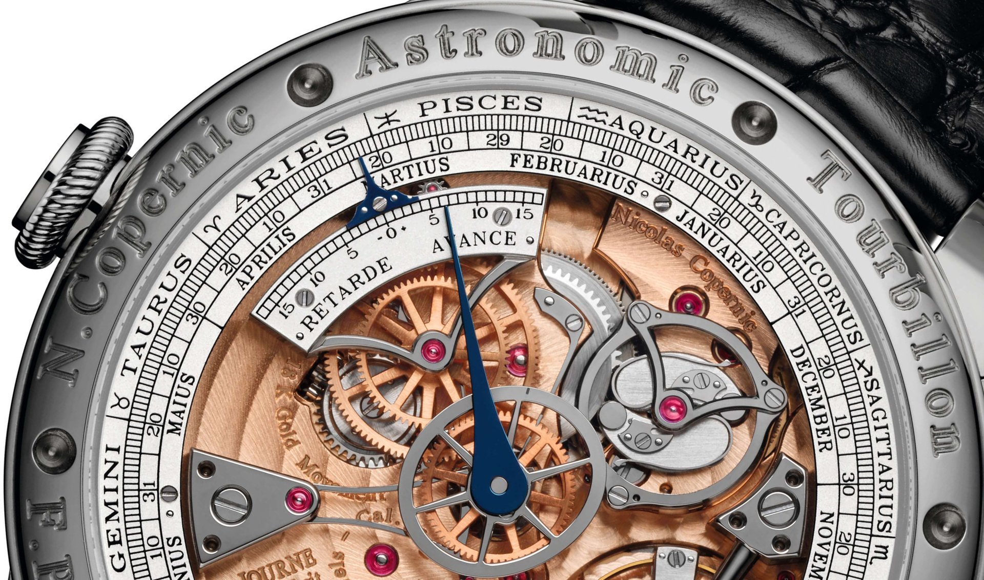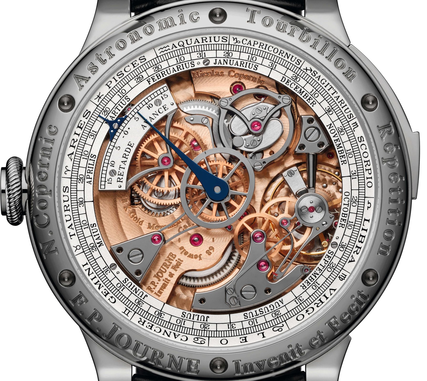 Nevertheless, the 18 carat rose Gold movement of the Astronomic Souveraine is totally novel. And it is, of course, very finely decorated. For example, the white Gold dial, whose sub-dials are embellished with clou de Paris decoration, and the moon phases, with a hyper-realistic moon that was traced from a NASA photograph. At 3, there is the mean time (or civil time) dial, with a blue hand indicating a second time zone. At 9, there is the sidereal time dial, which allows the observation of the stars. Next to it, the mean time seconds are shown on a disc. Between the two are the central minutes and the power reserve indication, which remains optimal up to 40 h. Above all this is a blue aperture showing the sunrise and sunset. Here, metal shutters lengthen or shorten the days. On the reverse there is the equation of time and a full annual calendar encircled by the signs of the zodiac. It is on this side that the dance of the tourbillon may be admired.