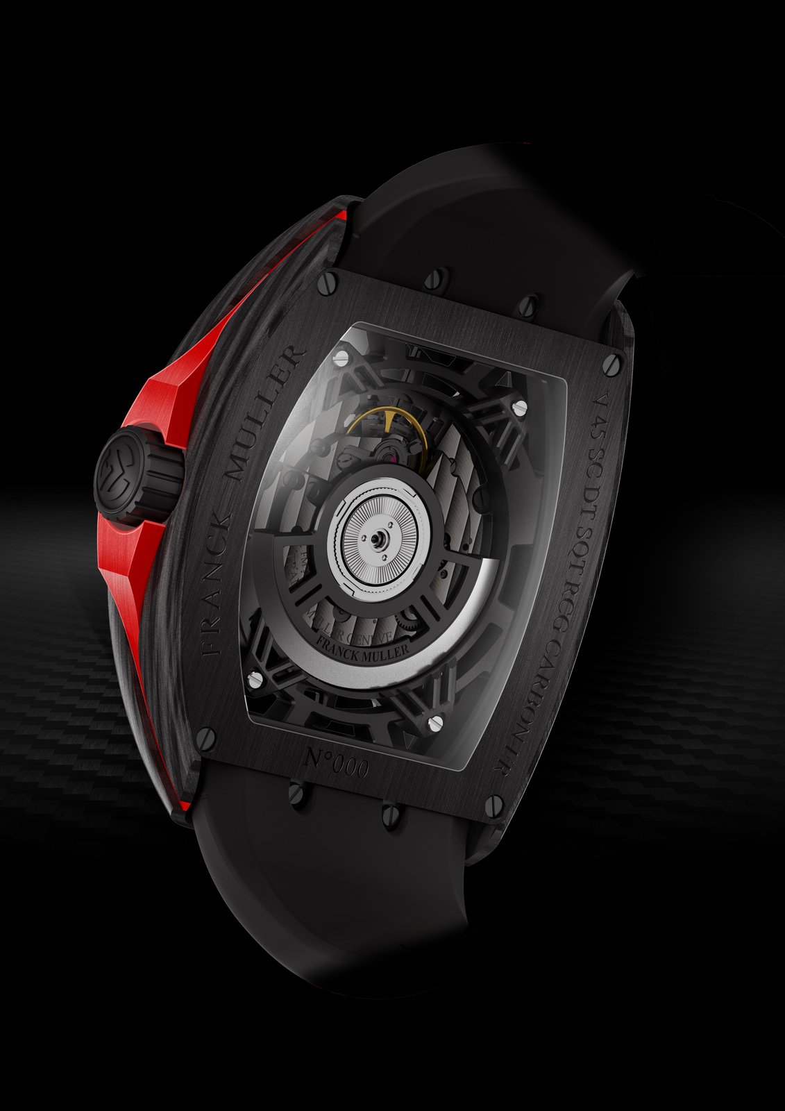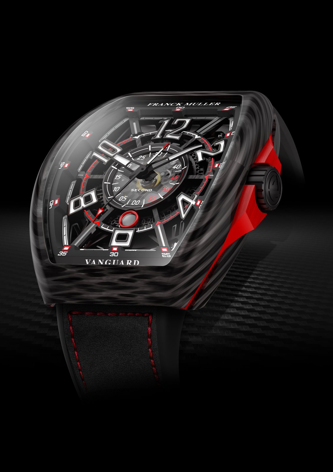 As cars tuned for races, the engineers and designers of Franck Muller have reshaped the entire movement to enhance its weight and display properties. Designed with features that recall the motorsport engines, the automatic movement and the frame structure of the Vanguard Racing Skeleton have been significantly lightened. In this dynamic, technical materials such as carbon fiber, titanium and aluminum have been chosen.