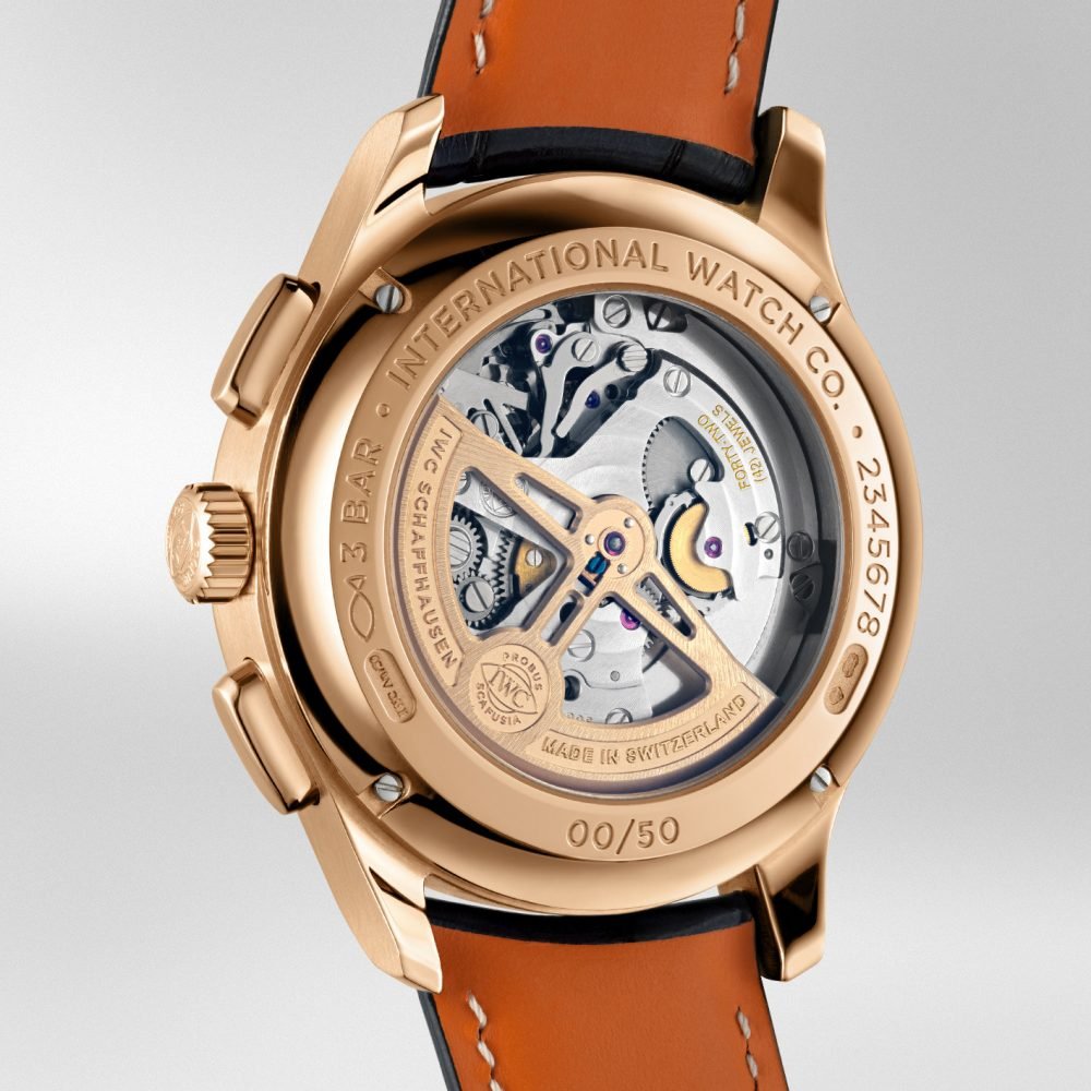The IWC-manufactured 89900 calibre is self-winding and builds up a power reserve of 68 hours. The chronograph displays stopped hours and minutes in a single totaliser at 12 o’clock. Thanks to its hacking tourbillon, the watch can be stopped completely, allowing the time to be set with down-to-the-second accuracy. The pallet lever and escape wheel are treated with Diamond Shell® technology, giving it an extremely hard surface that reduces friction and improves the flow of energy in the movement.