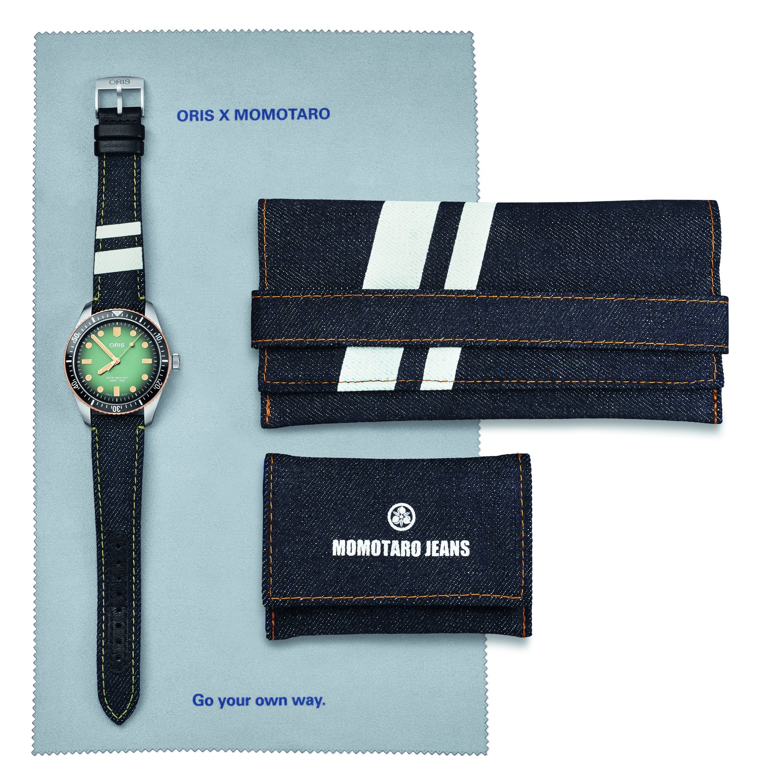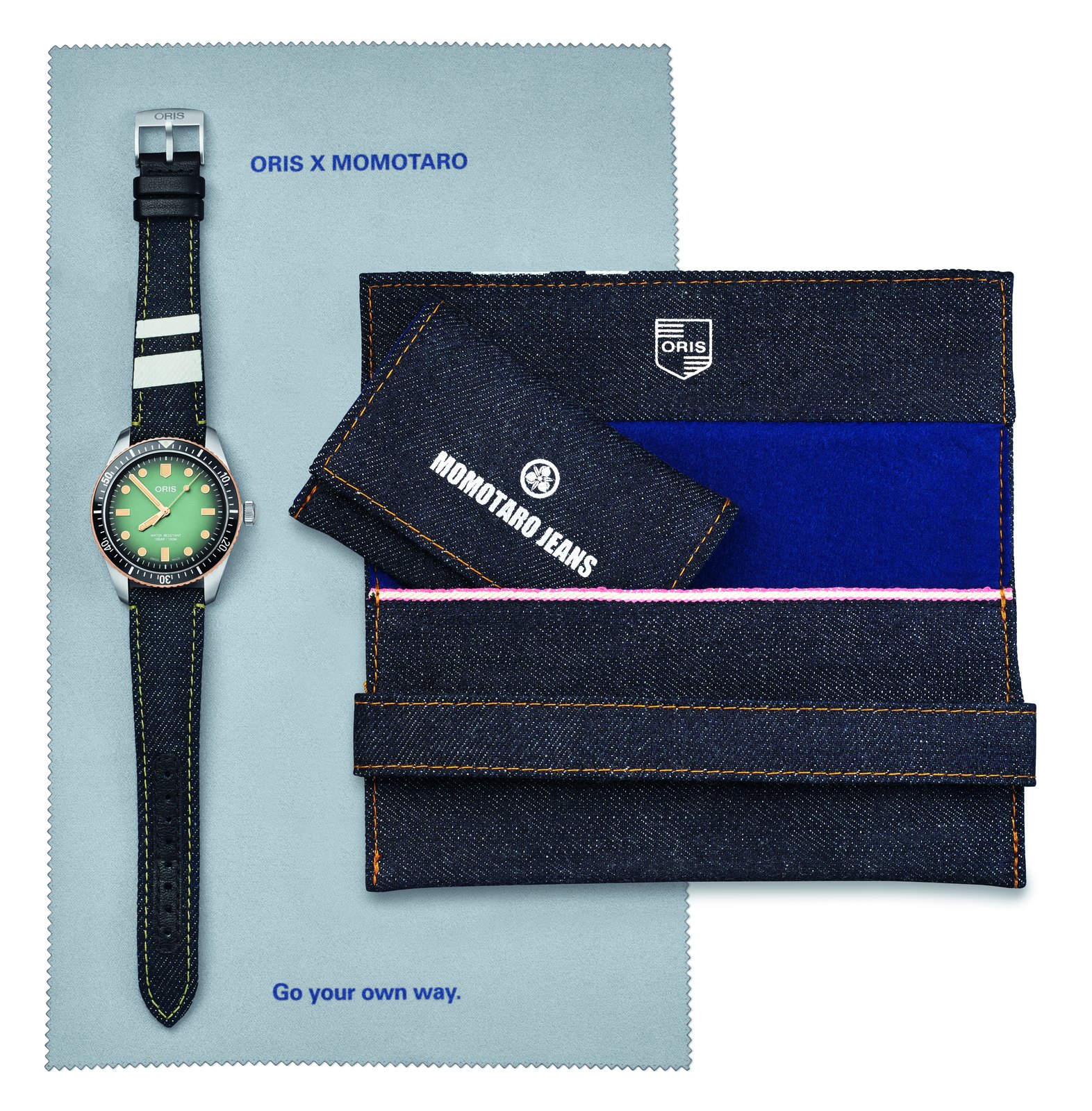 We felt it was a chance for both of us to explore new ideas and new territory. This is the first time we’ve worked with a Swiss watch company, and I don’t think Oris has partnered with a Japanese textile company before either. Oris is the perfect match for us, because like Momotaro, it’s independent, it makes bold and brave choices, and it’s obsessive about quality. This isn’t just a product collaboration – our spirit, culture and craftsmanship really synchronised. And we also love Oris watches and the Oris story. Go your own way!