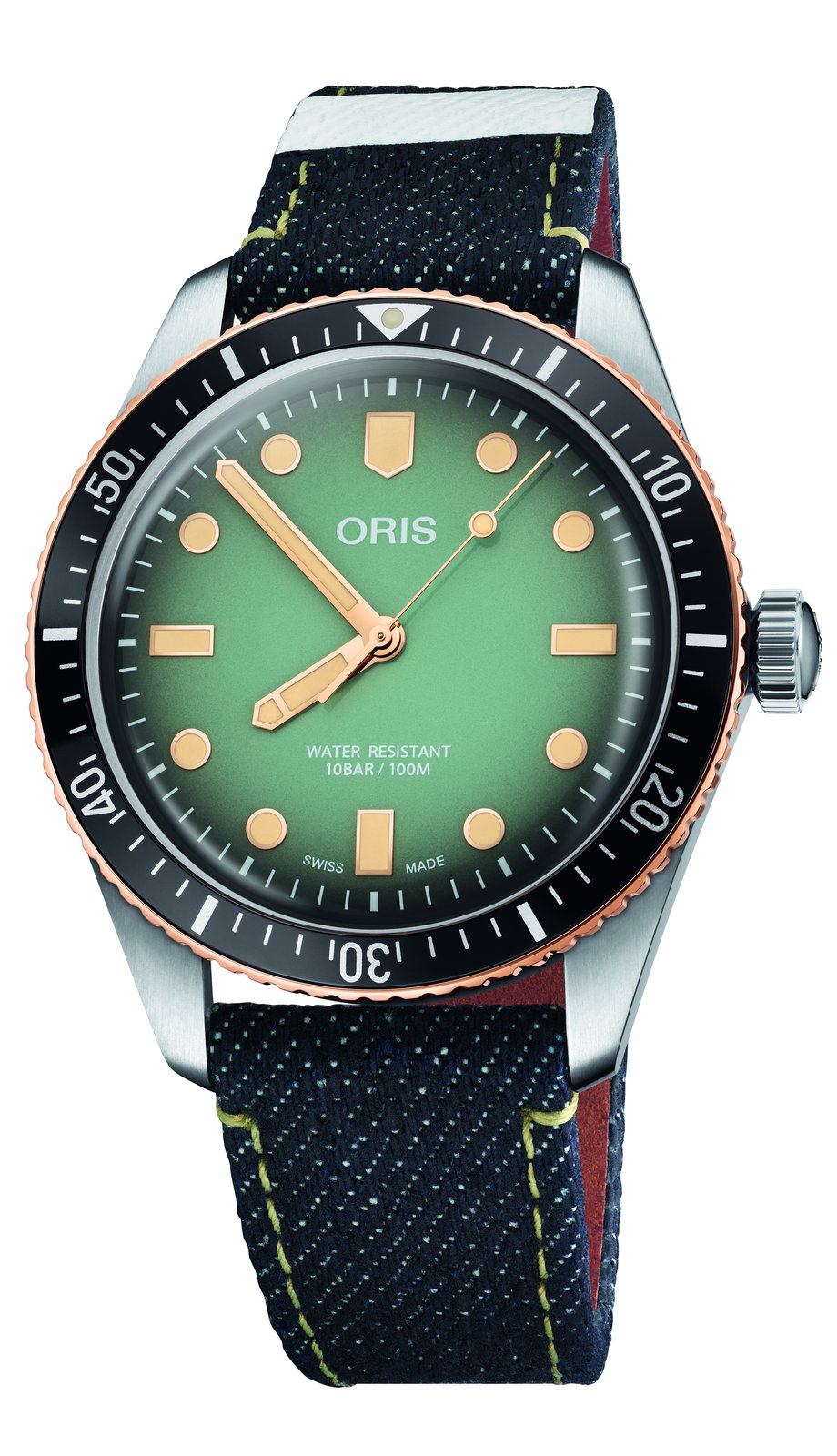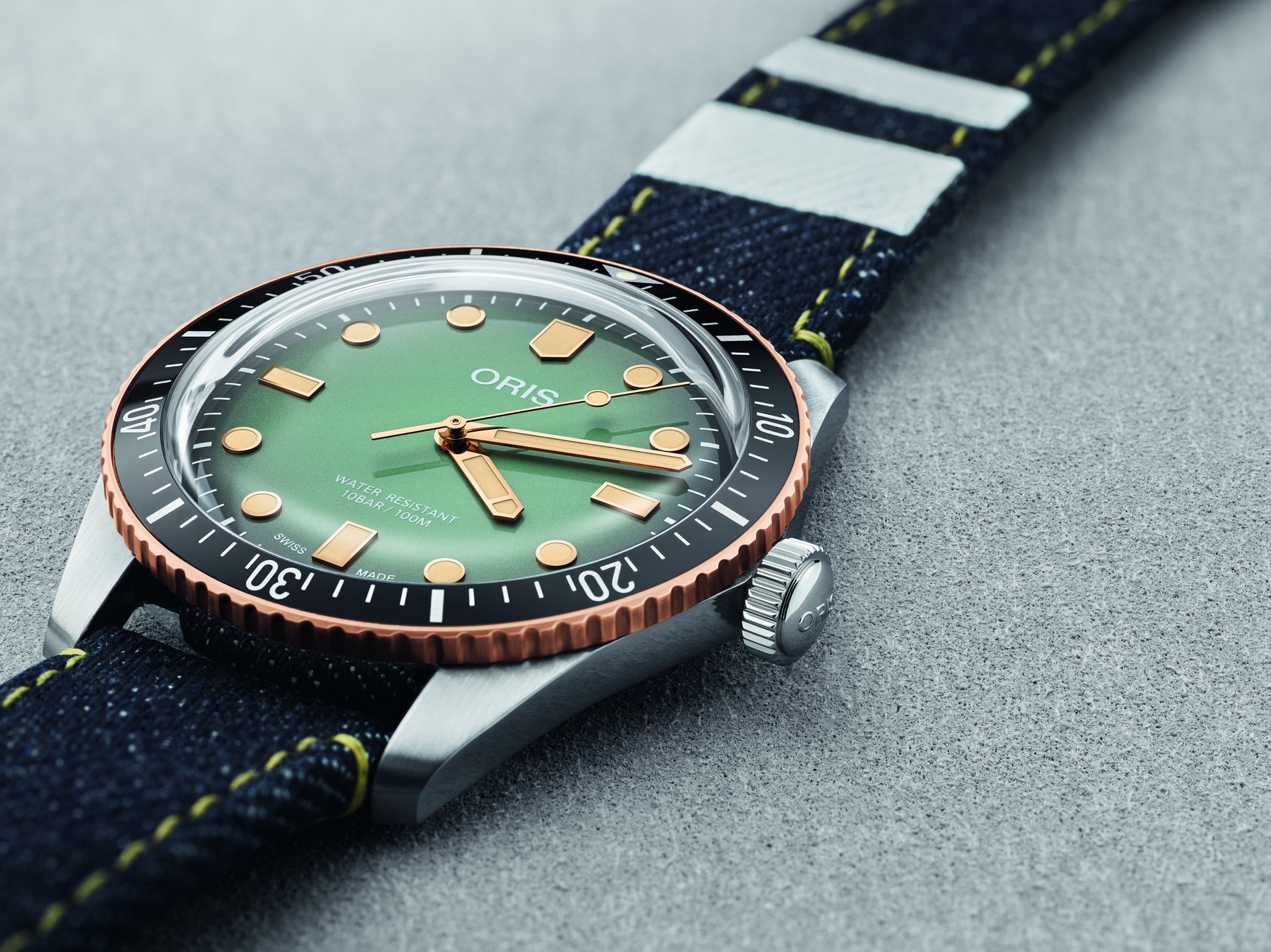 The new watch is a steel and bronze version of the iconic Oris Divers Sixty-Five, and comes on an indigo Momotaro denim strap with two white ‘battle stripes’, the denim manufacturer’s famous signature.