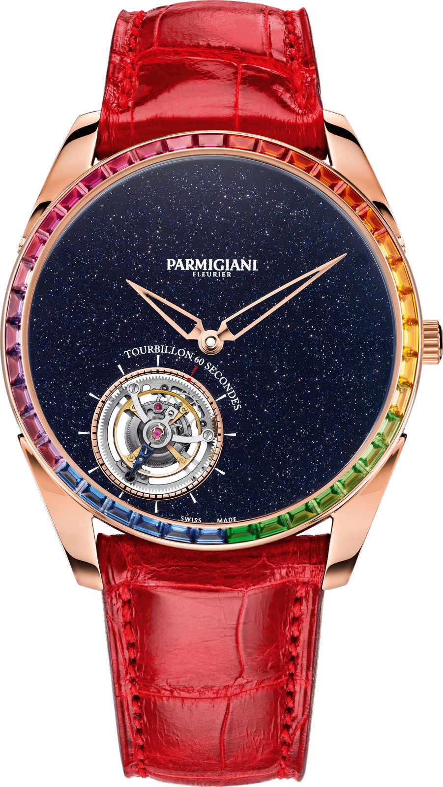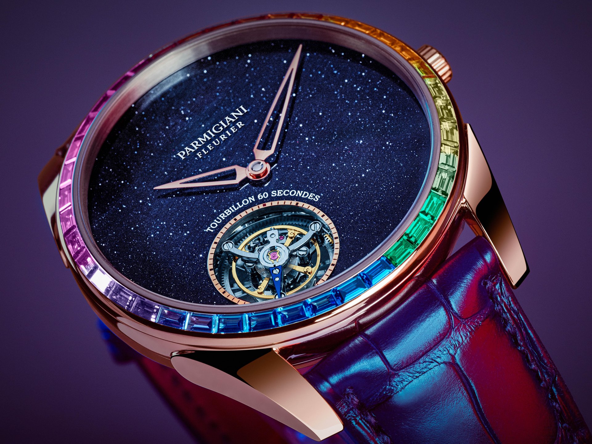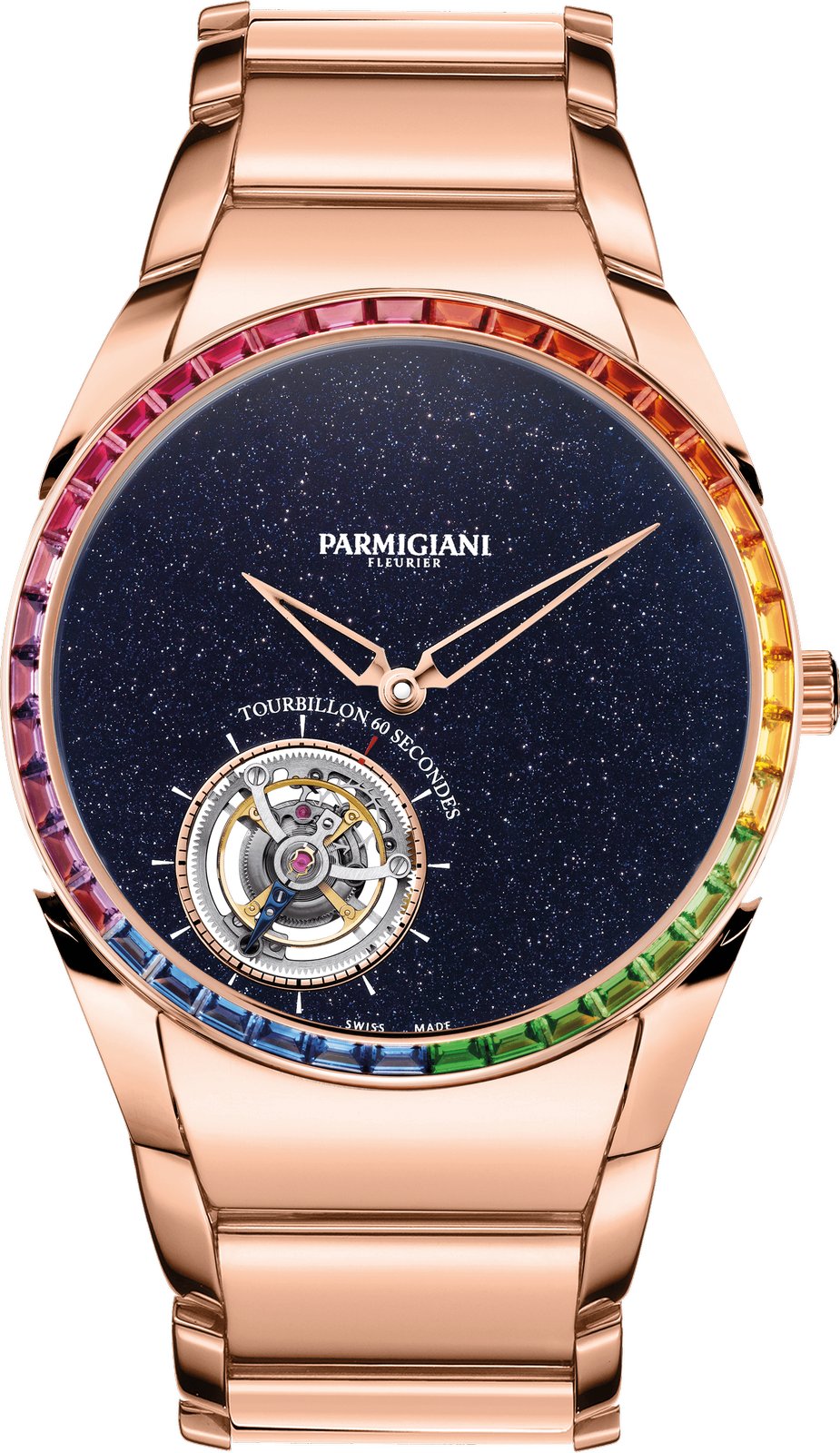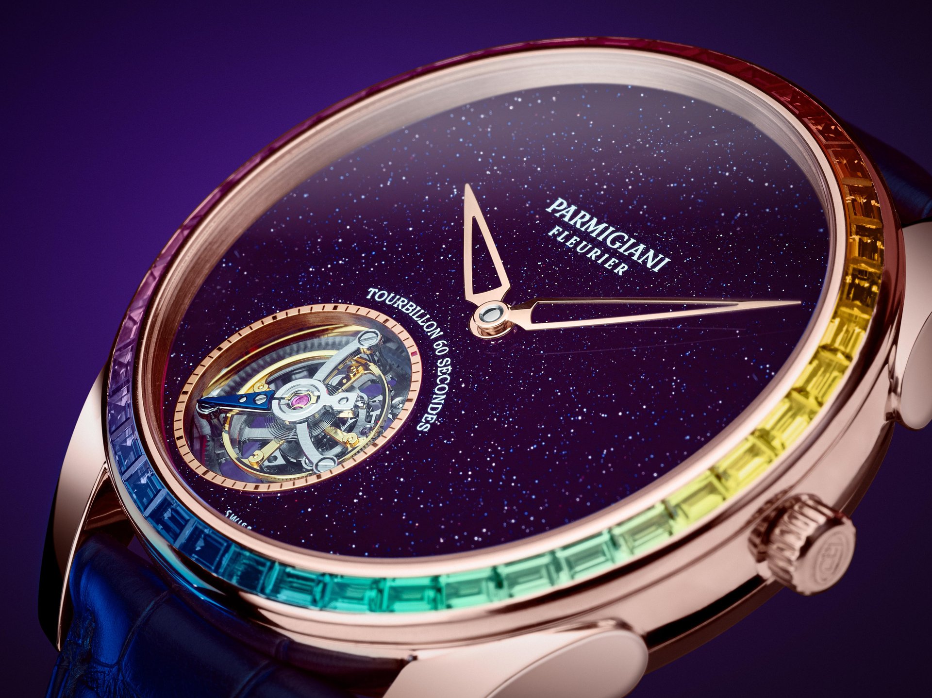 Its flying tourbillon is reminiscent of a spiral galaxy and dances amid celestial beings on an aventurine sky, carefully placed at seven o’clock, a nod to Michel Parmigiani’s birth on December 2, 1950 at 7:08 am. The development of an ultra-thin tourbillon movement is a challenge for any watchmaker. Parmigiani Fleurier found a solution by integrating a platinum micro-rotor into the plate of the movement, resulting in a caliber only 3.4 mm thick. In addition, it is hand-finished with the most admirable decorations in the brand’s manufacture.