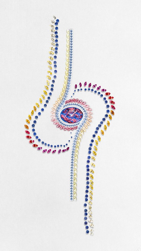 Finding the perfect colour gemstones for this timepiece was also one of the most challenging operations. It involved sampling large quantities of gemstones to ensure the perfect colour match, a task made even more complex given the large progressive size of the stones and the high gem quality standards of the Maison. To magnify the brilliance of the stones, Piaget’s gem-setters have expertly set the gemstones by hand, using the Serti Descendu technique.