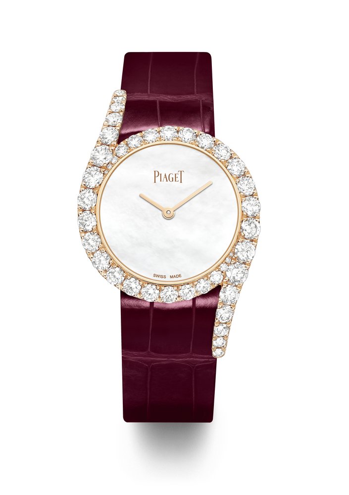 A new rose gold version, (Ref. G0A45161) also using the Serti Descendu technique to set the 57 diamonds (approx. 4.80 cts), is available with a burgundy-coloured strap and a delicate mother-of-pearl dial of exceptional quality. It is extremely white in colour, with beautiful reflections, which attests of its high quality.