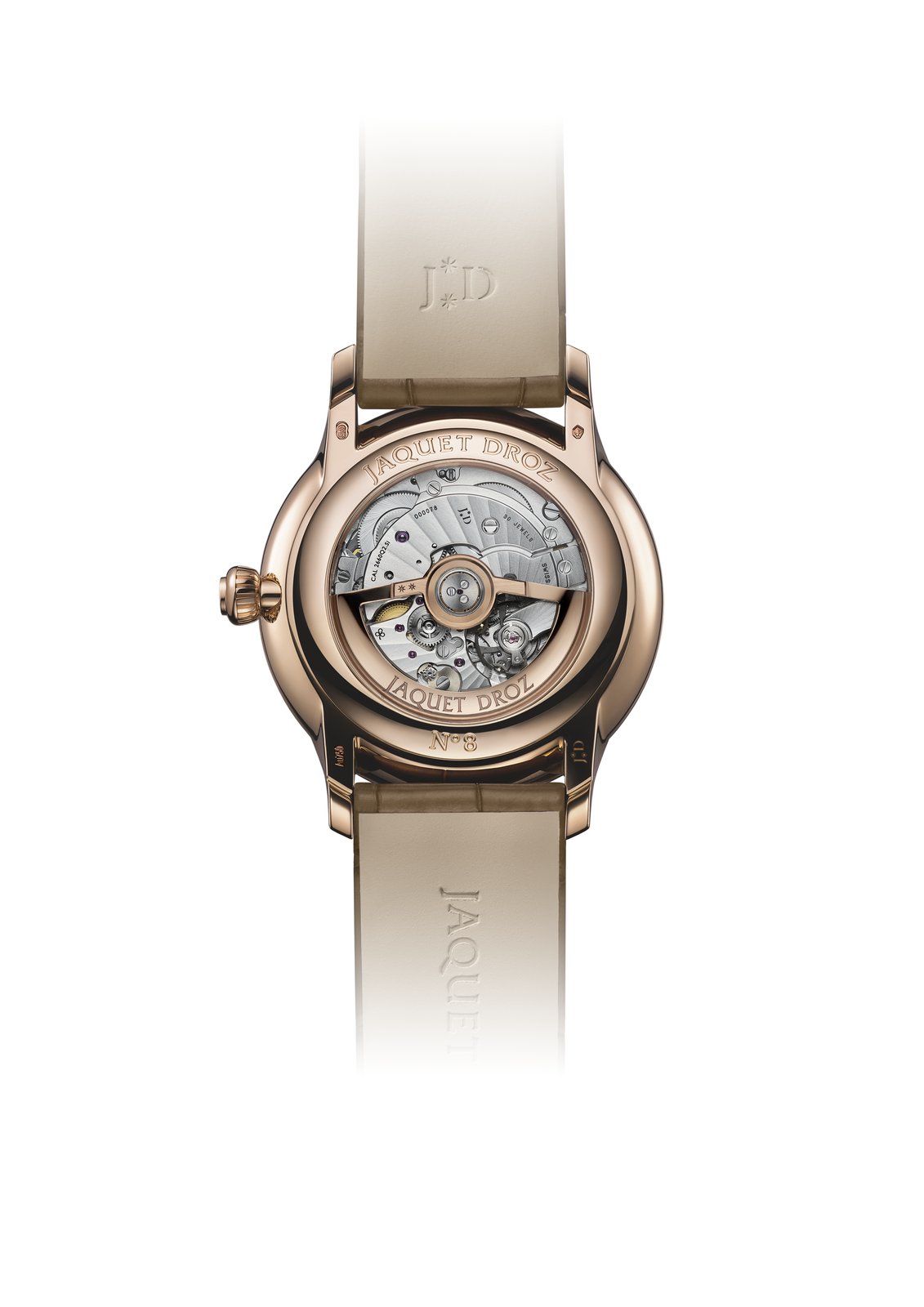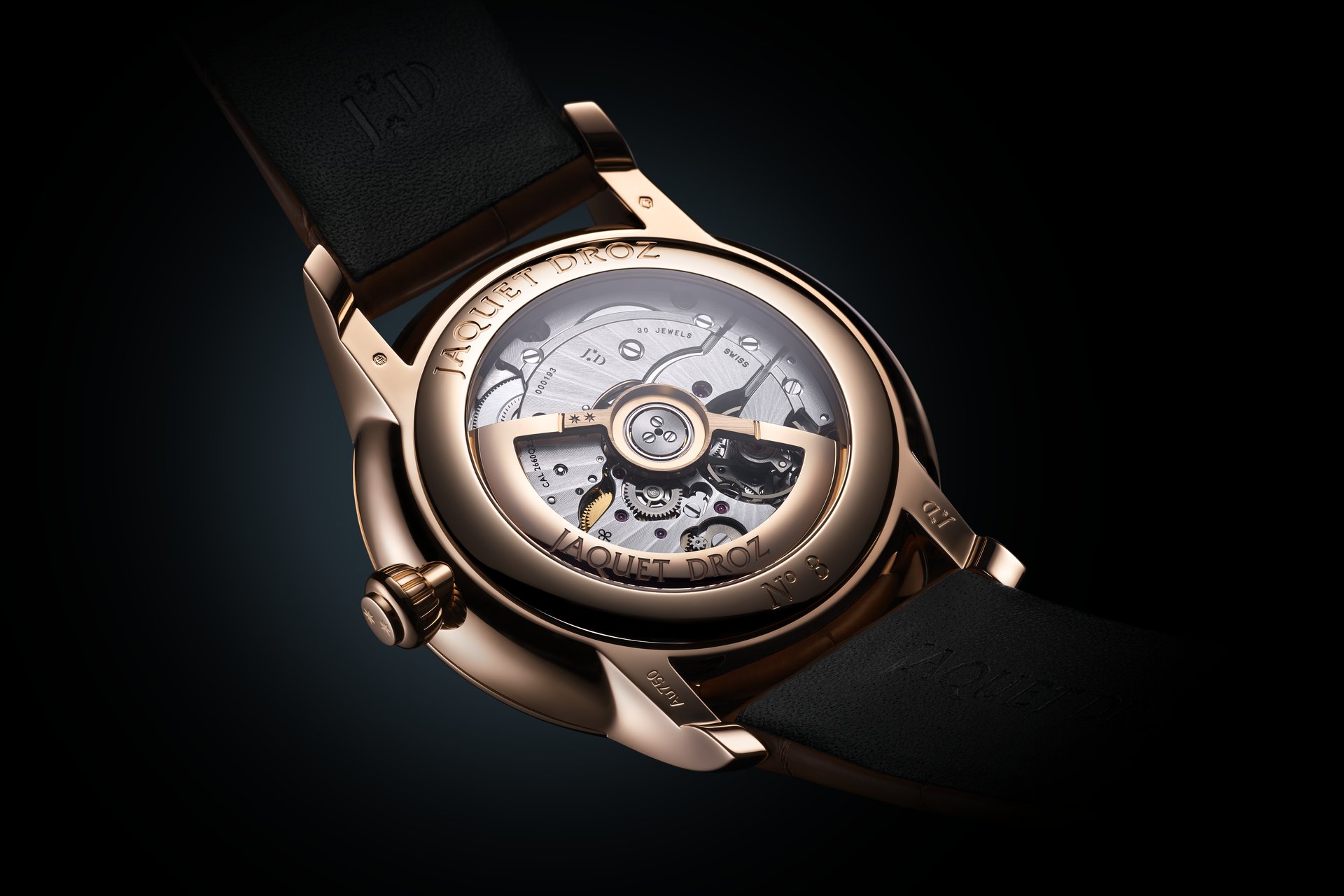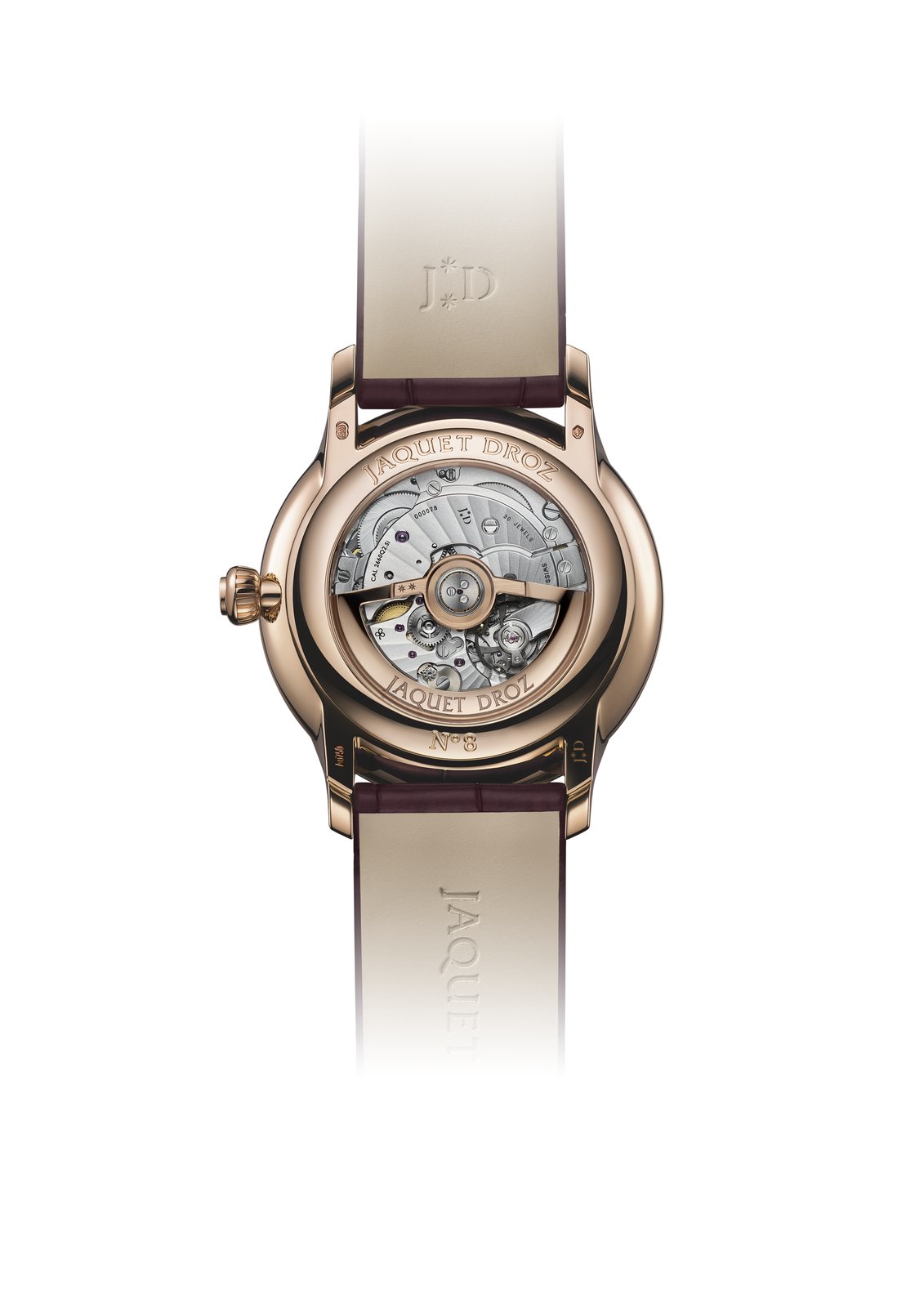 - Jaquet Droz 2660Q2, self-winding mechanical movement, silicon balance spring and pallet horns, double barrel, 18-karat red gold oscillating weight