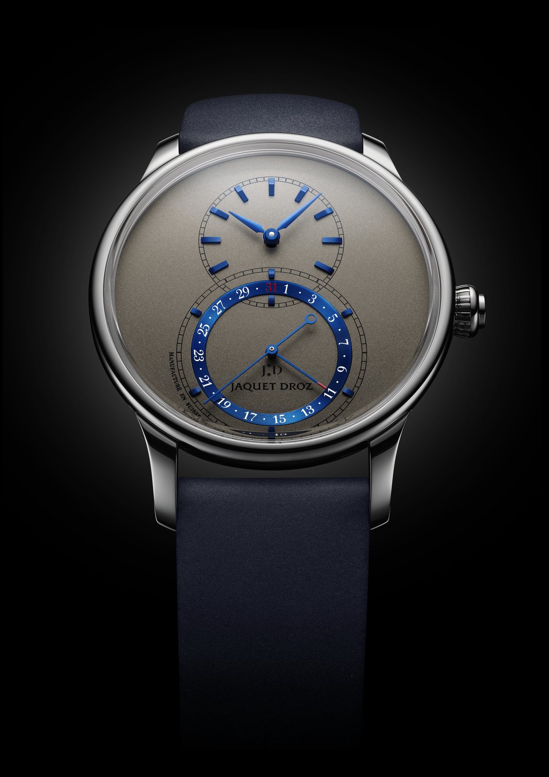 New finishes were also specially developed for this collection. There is a wide range of Grande Seconde Quantième 41 mm watches with Grand Feu enamel dials, a long-practiced art Jaquet Droz has mastered and one of its most recognizable signatures. The dials now come in ivory tones as well as and deep blue, burgundy and anthracite. Each shade was specially crafted for this latest collection, the result extensive research on enamel powders and hand-firing techniques to produce the exact color variations desired. The date is displayed at 6 o’clock with an 18-carat red gold applique. In addition to these four colors, there is also a matte black dial, a titanium gray sandblasted version and a last one in sandblasted silver. No fewer than seven models in all are being unveiled at once, forming an entire collection of Grande Seconde Quantième 41 mm timepieces.