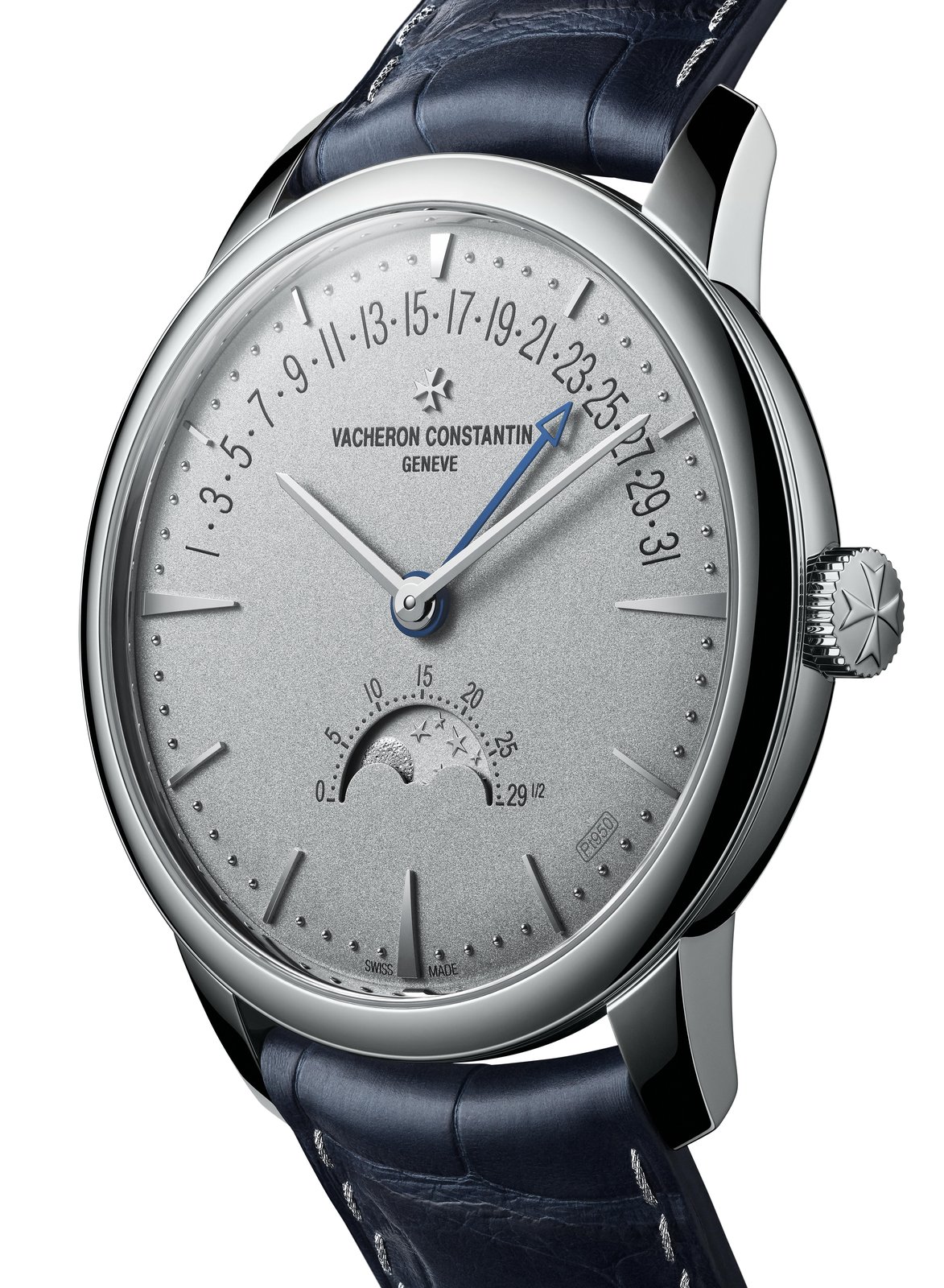 The secret signature on sand-blasted dial of the Patrimony moon phase retrograde date watch is the inscription “Pt 950” between 4 and 5 o’clock. The moon-phase disc, which can be admired through an aperture at 6 o’clock, is also in platinum with a polished surface on the stars and a grained texture for the moon circles imitating the visible irregularities of the lunar surface. The dial is slightly convex around its circumference and punctuated by applied 18-carat white gold hour-markers, appearing at intervals around a likewise white gold “pearl” minute-track. The baton-type hands are made of the same metal, blued for the date pointer for enhanced readability.