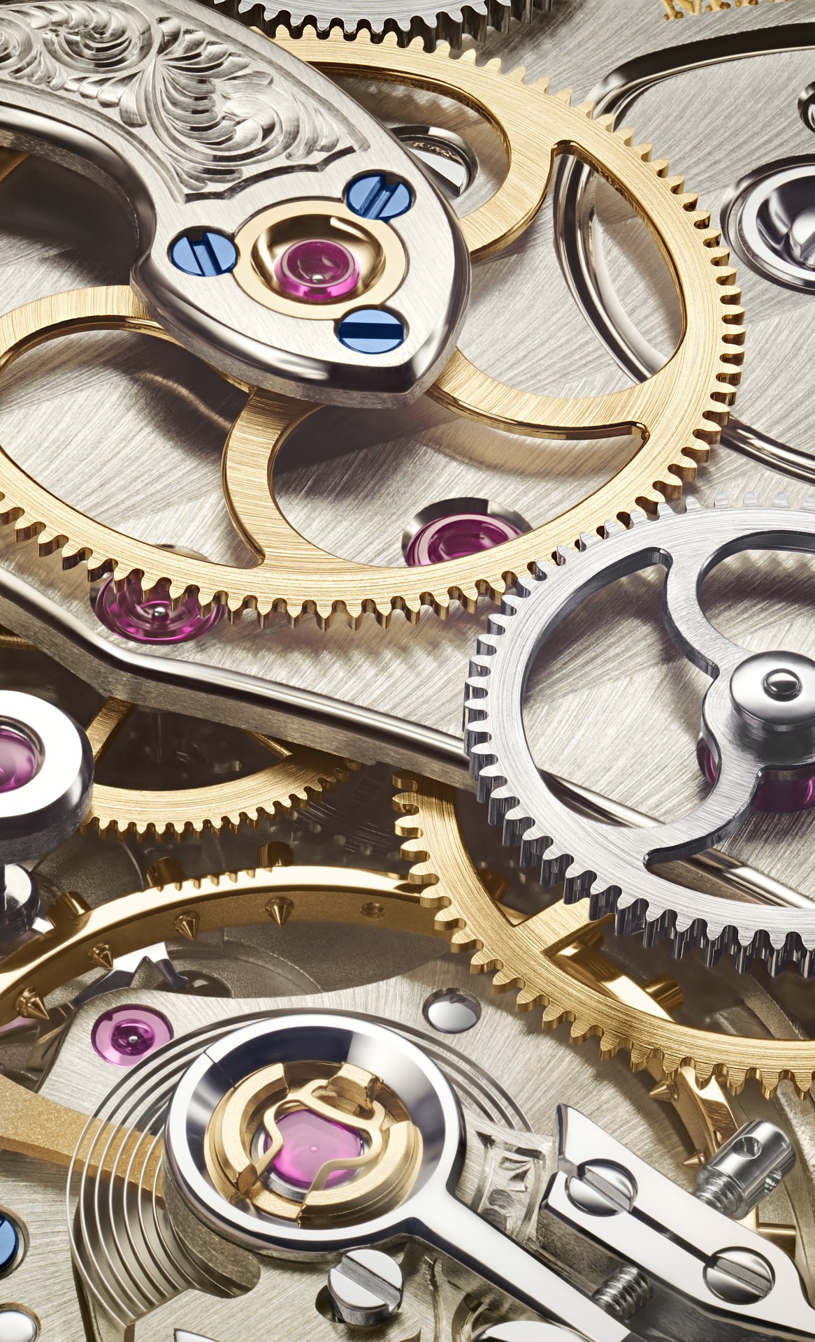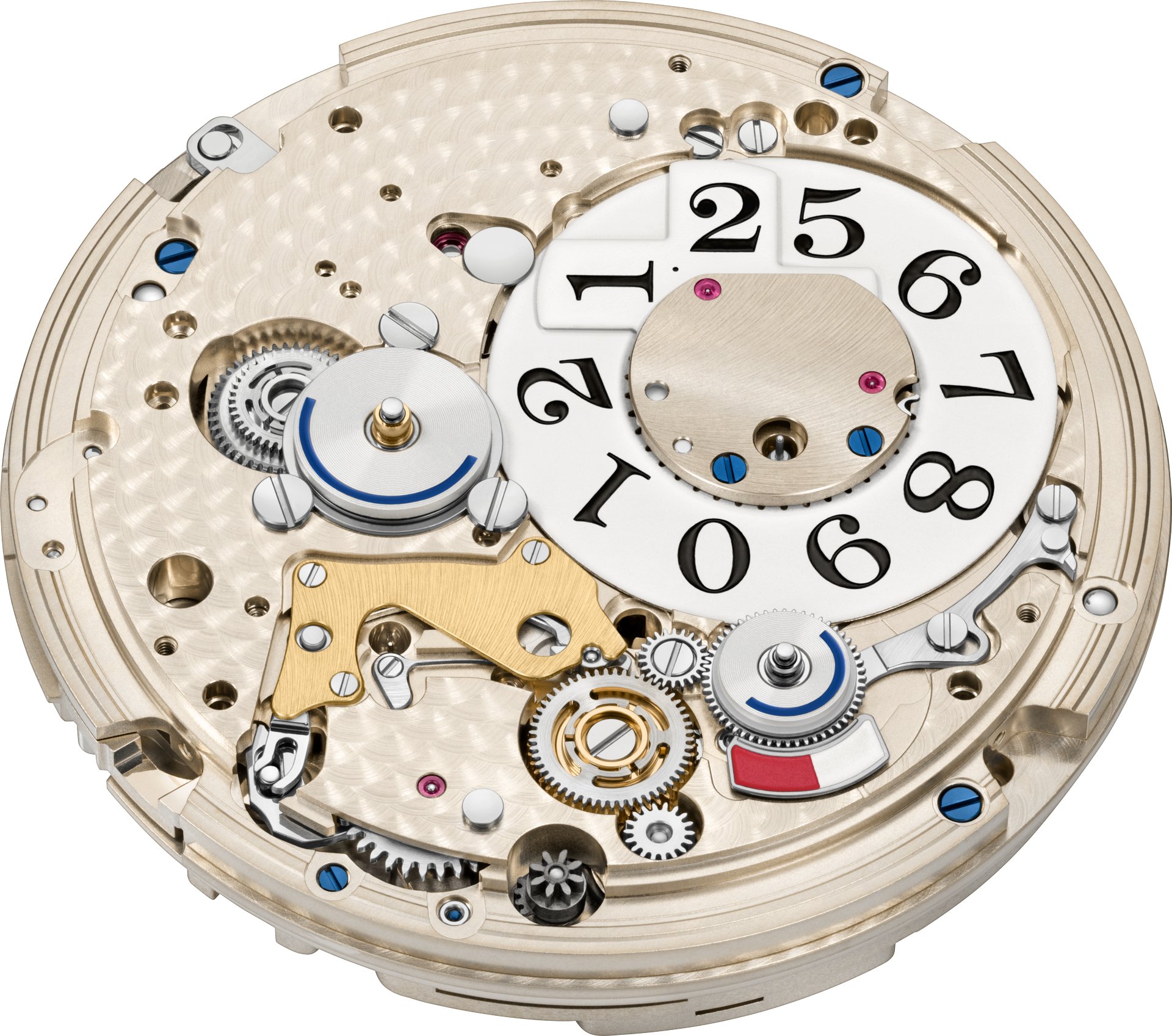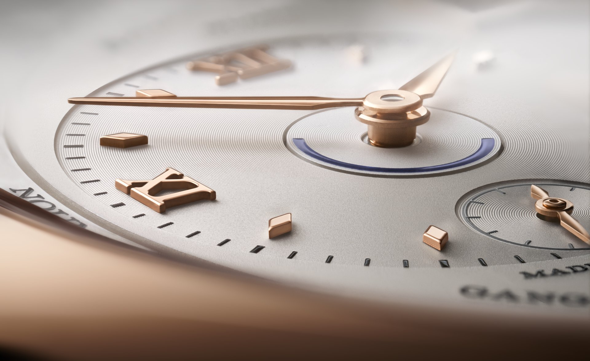 A feature retained from the predecessor model is the convenient adjustment of the second time zone based on a switchable city ring with 24 time zones. They were defined in 1884 and are represented by 24 reference locations. When the corrector button at 8 o’clock is pressed, the city ring jumps from west to east by one time zone. At the same time, the hour hand in the small subsidiary dial advances by one hour and now indicates the zone time of the city beneath the golden arrow applique that stands for that particular time zone. The hands on the large numerals circle can be set to display the time at home or the time in another freely selectable time zone. To simplify the distinction, zone time is indicated with printed Arabic numerals while home time is displayed with gold Roman numeral appliques.