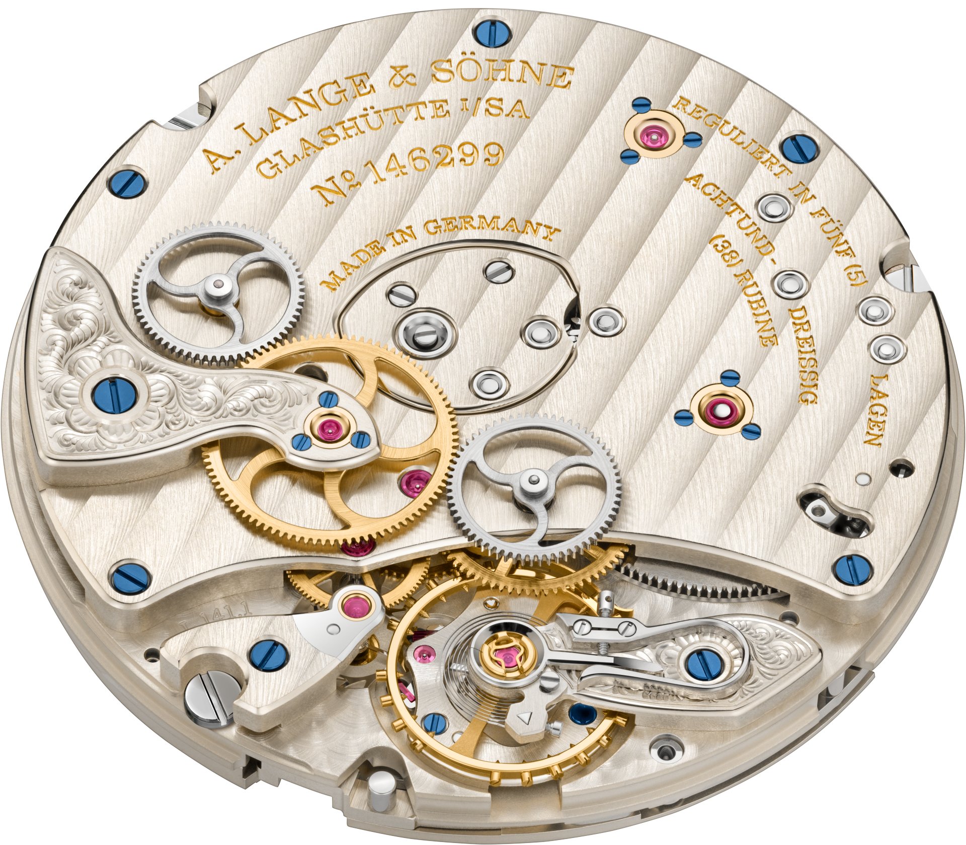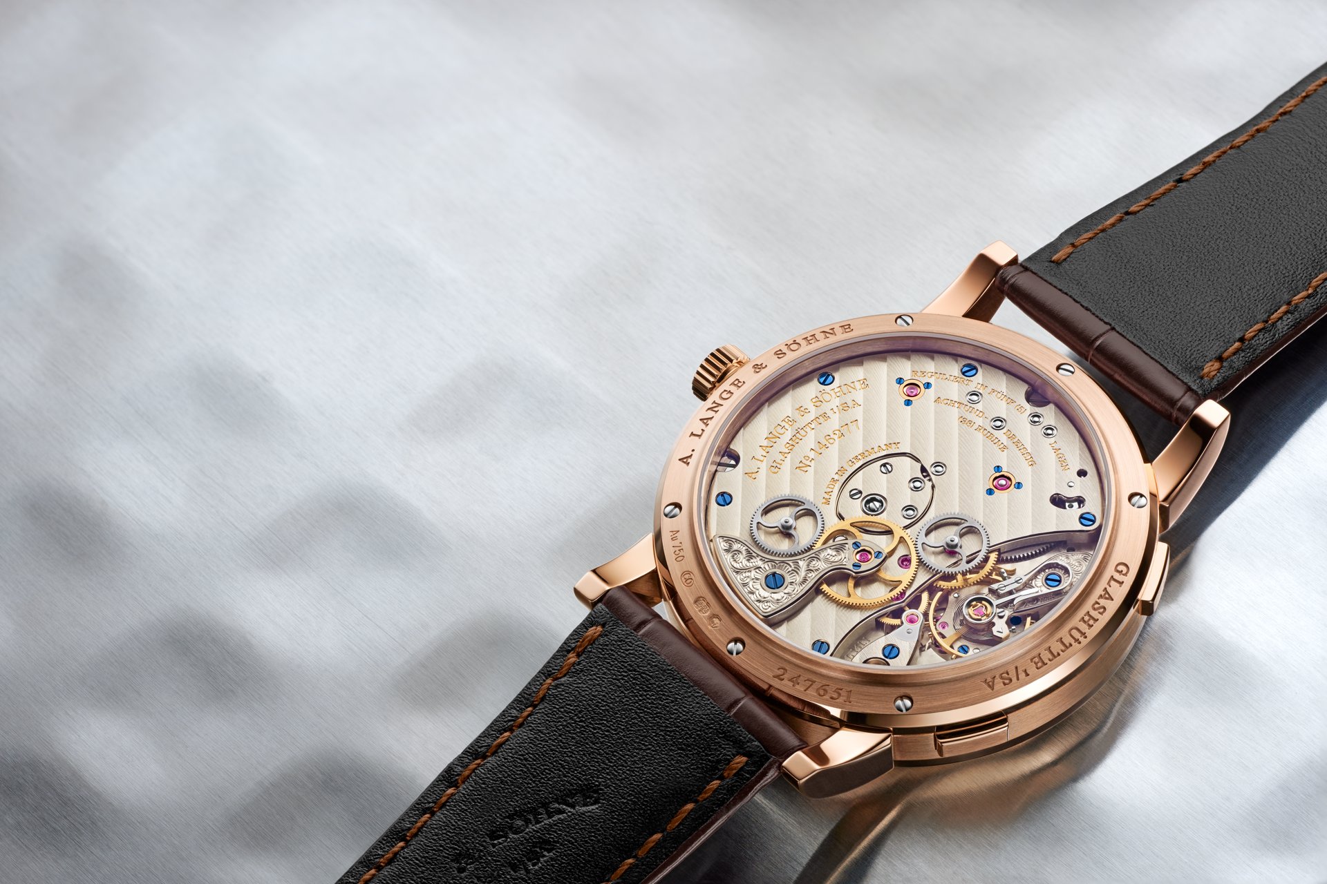 Lange-style quality hallmarks such as the three-quarter plate made of untreated German silver, screwed gold chatons, blued screws, an elaborate whiplash precision index adjuster as well as hand-engraved balance and intermediate-wheel cocks are visible through the sapphire-crystal caseback. The artisanal decoration of the movement, which is assembled twice, reflects A. Lange & Söhne’s high standards in every detail.