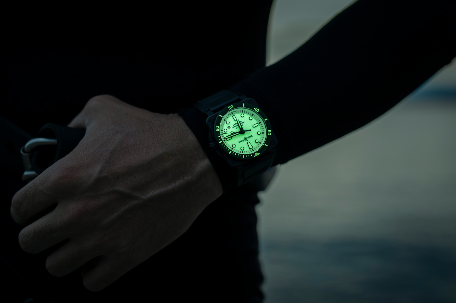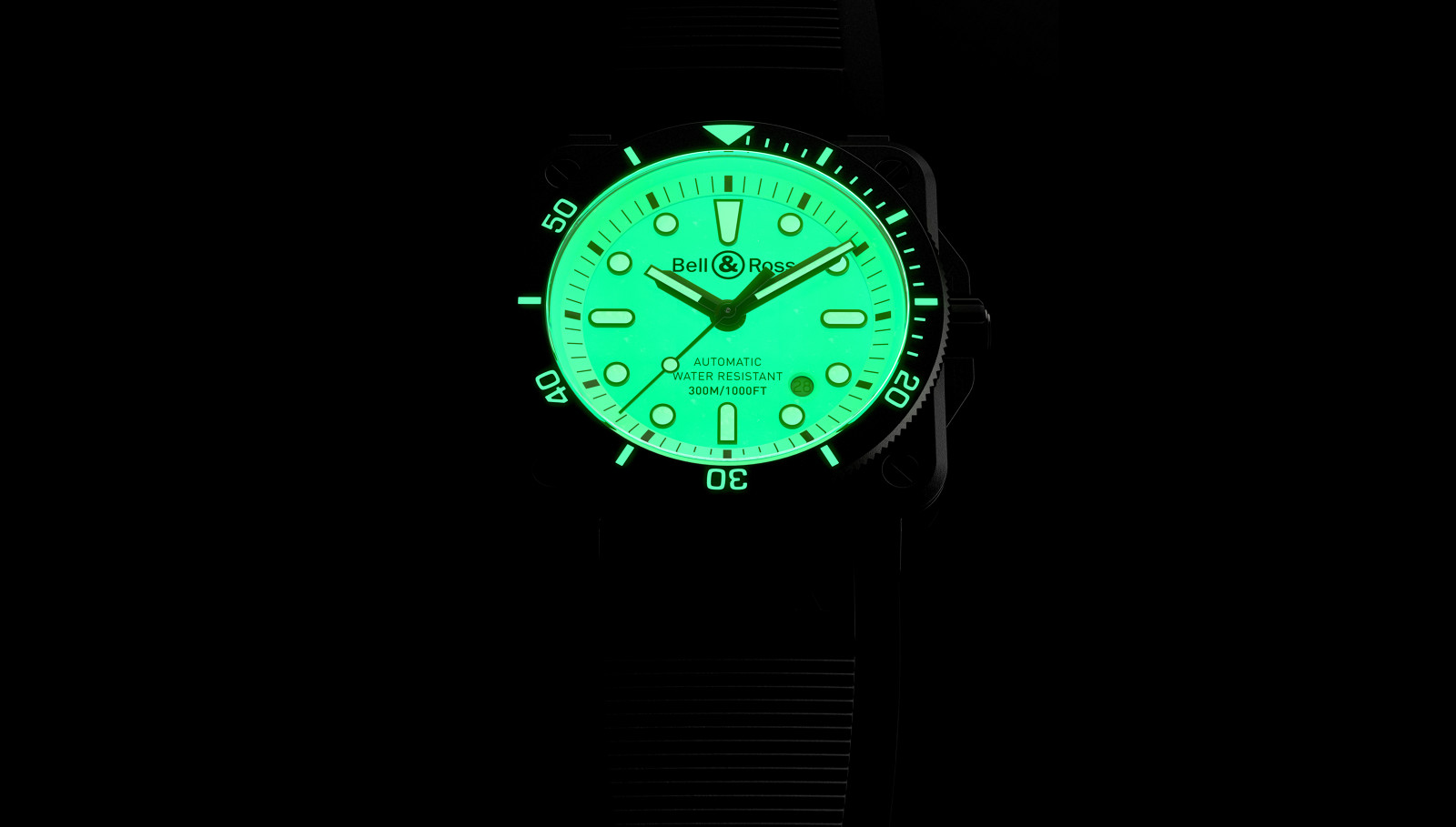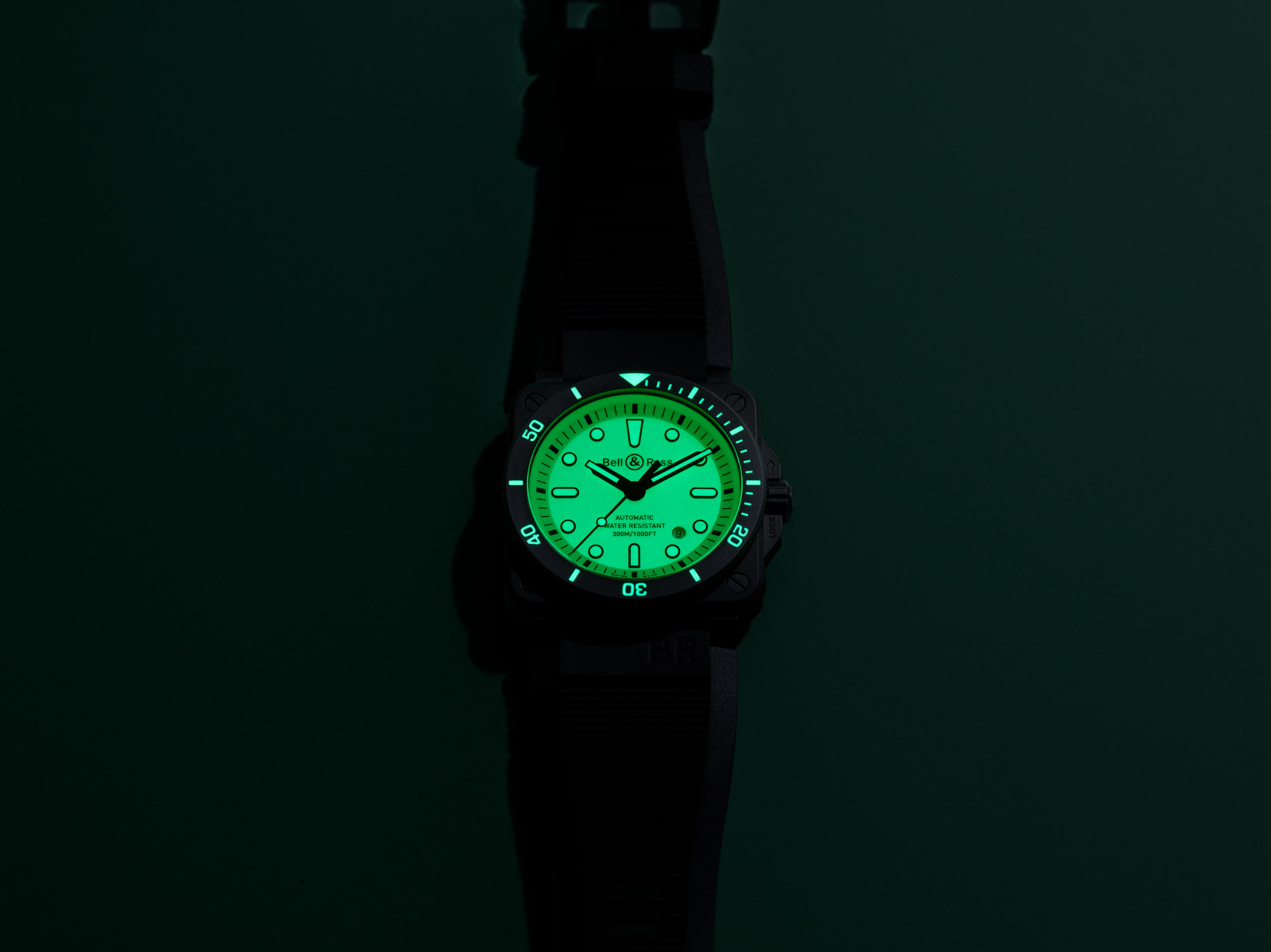 Only watches that meet the requirements defined by international standard ISO 6425 can be labeled as diving watches. These official regulations set out very specific criteria and list a great number of fundamental technical characteristics. Those include water-resistance to a minimum depth of 100 meters; the presence of a unidirectional rotating bezel with a graduated minutes scale, an operation indicator and luminescent markers; legibility in the dark; anti-shock and anti-magnetic protection.Bell & Ross BR 03-92 DIVER FULL LUM