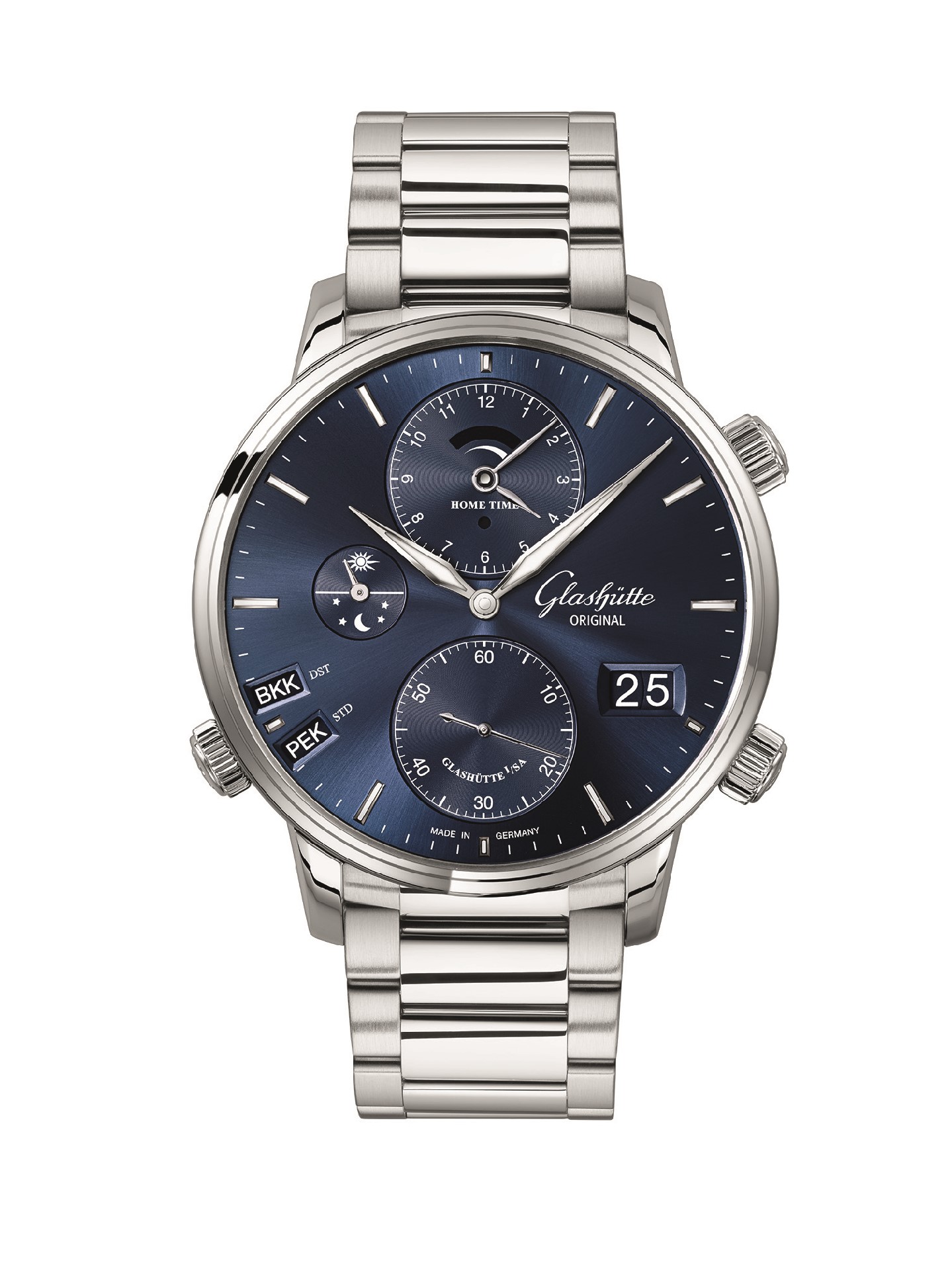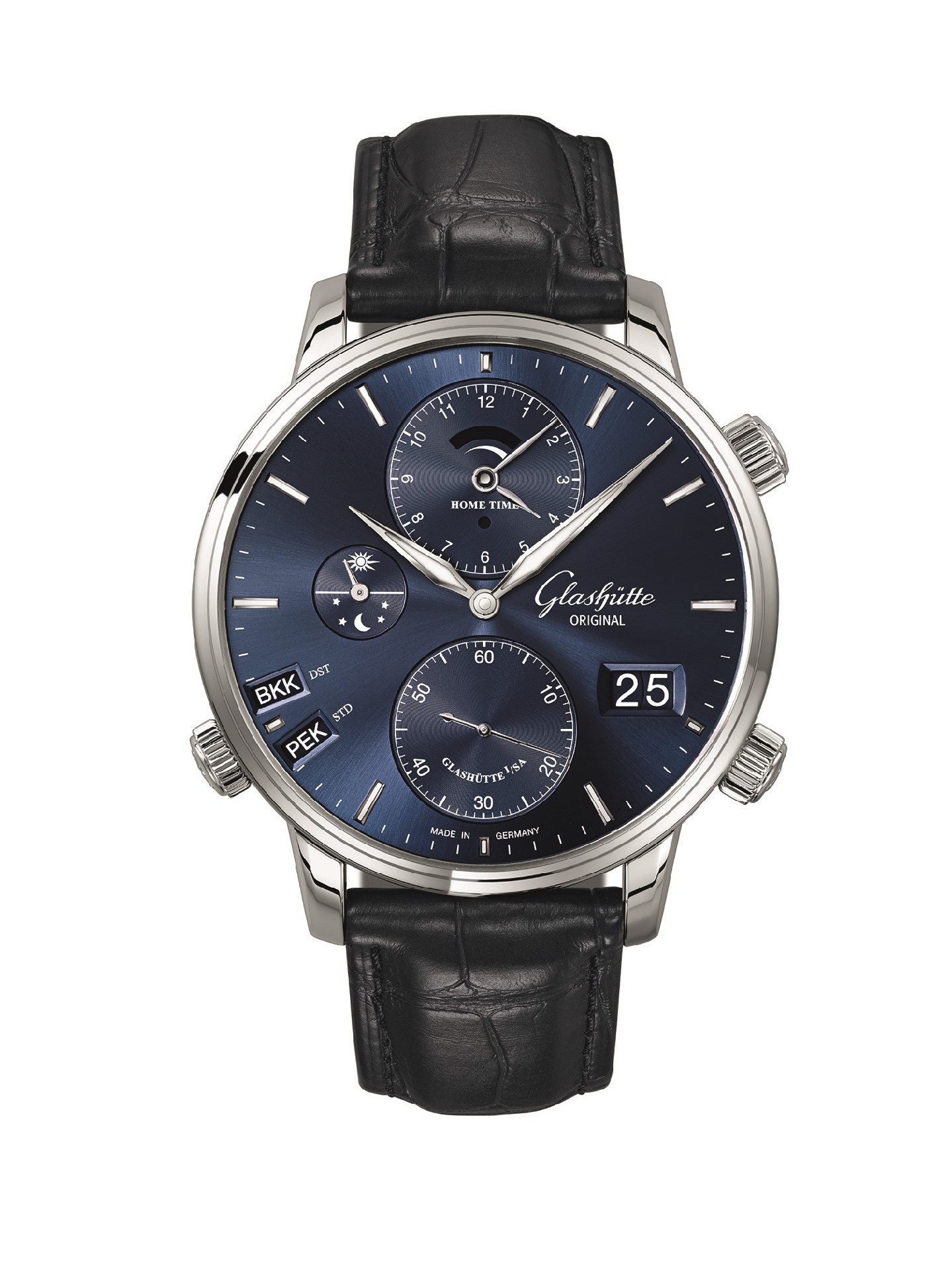 Elegance, in its most essential form in the style of Glashütte Original, cuts a fine figure with the new form of the hands and appliques against the blue background. The dial is framed by an alternately polished/ satin-brushed, 44-millimetre stainless steel case. A blue Louisiana alligator leather strap with pin buckle or fold fastener ensures the new “Cosmopolite” makes an impeccable appearance on the wearer’s wrist. The new timepiece is also available with a stainless steel bracelet with an 8-step fine adjustment mechanism.
