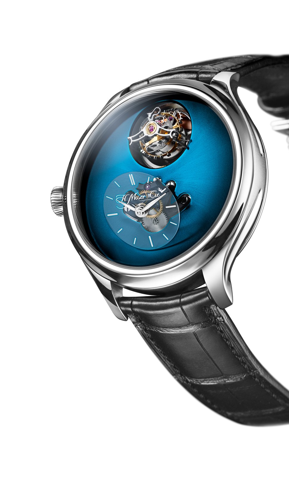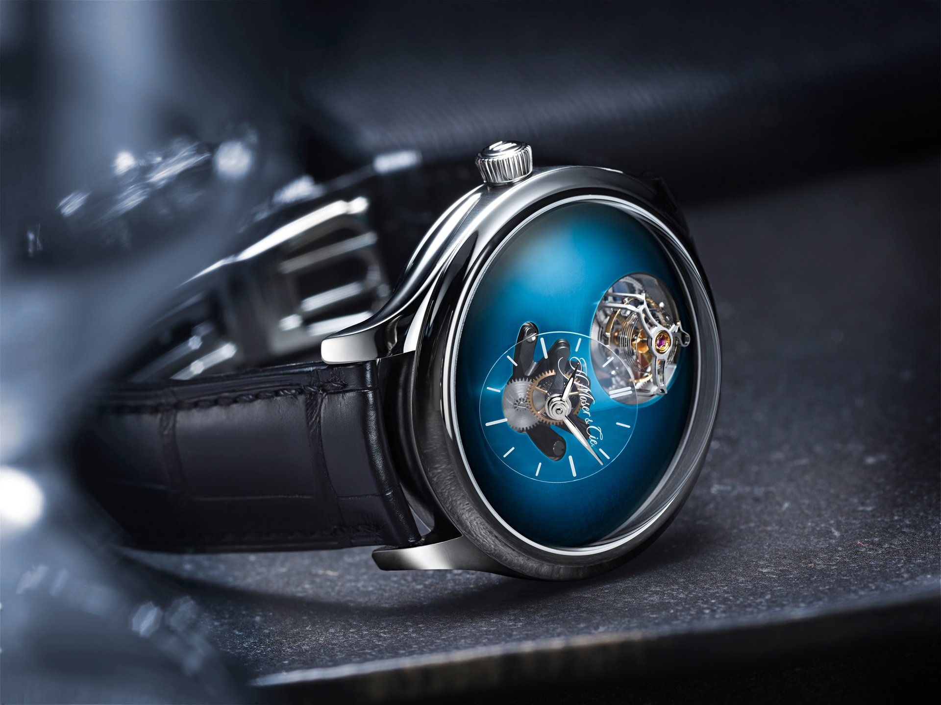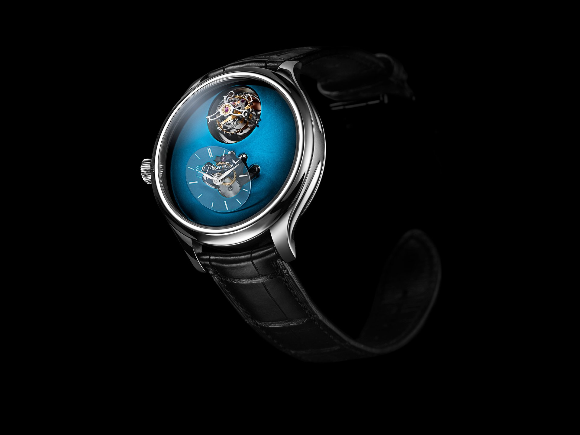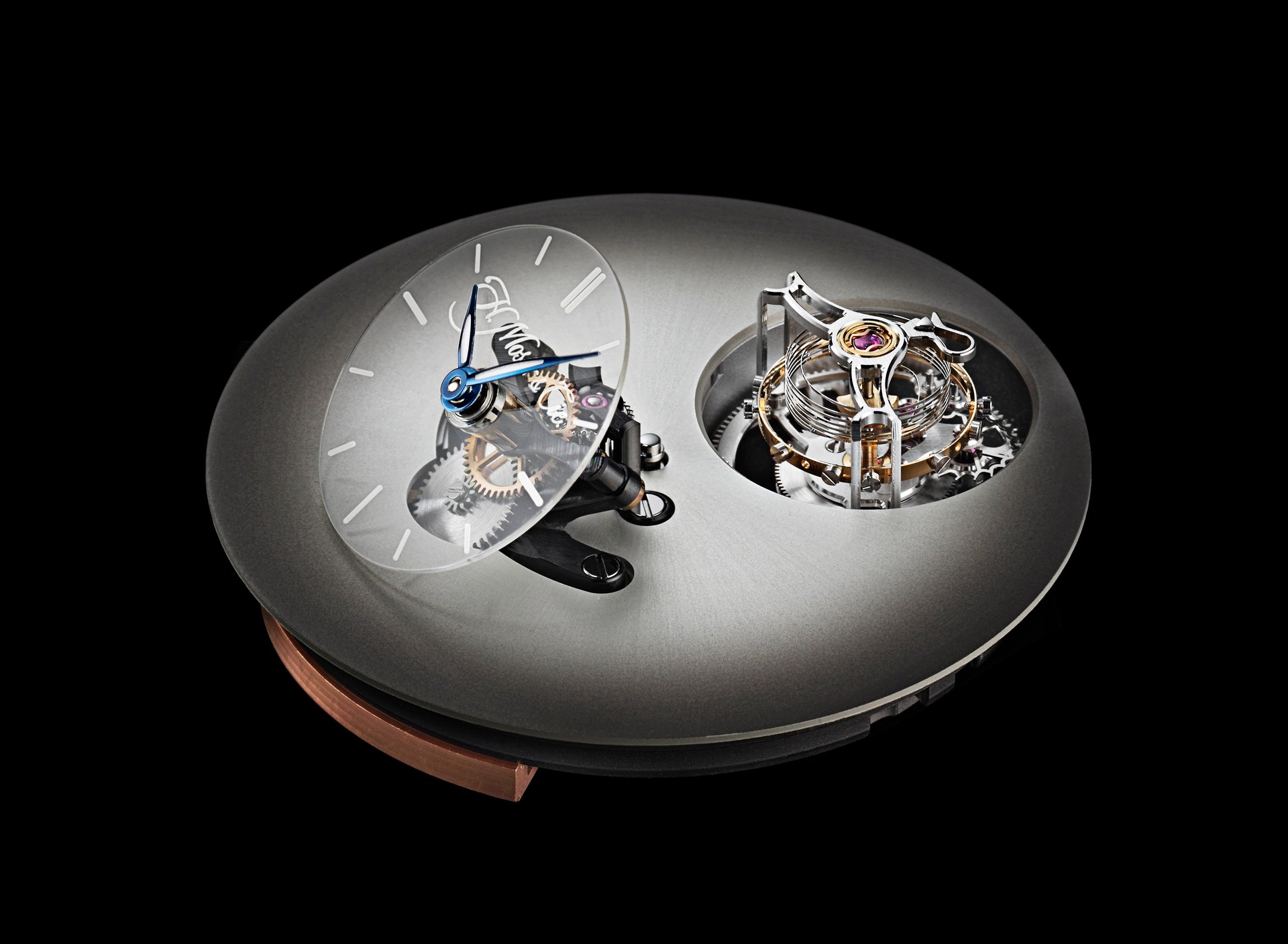 As Edouard Meylan explains: „We have Moserized the MB&F universe by developing a sapphire subdial, which melts into the background so as to highlight the beauty of our fumé dials. And to preserve the purity and elegance of this true work of horological art, we have inscribed our logo like a watermark on the sapphire subdial, thereby underlining the personal character and intimate relationship binding it to its owner“.Endeavour Cylindrical Tourbillon H. Moser × MB&F