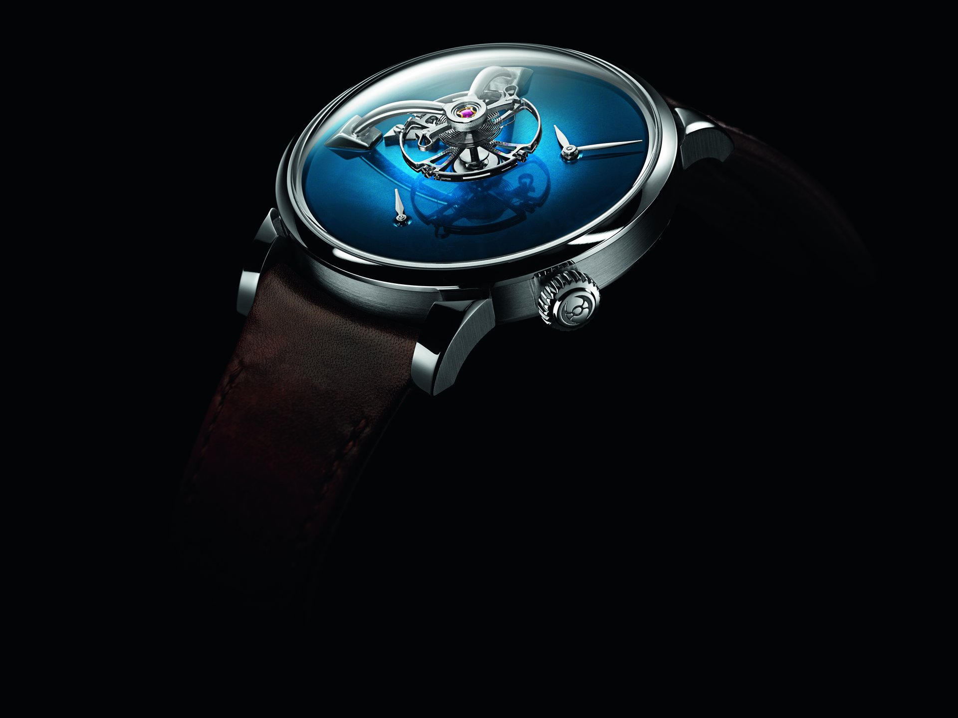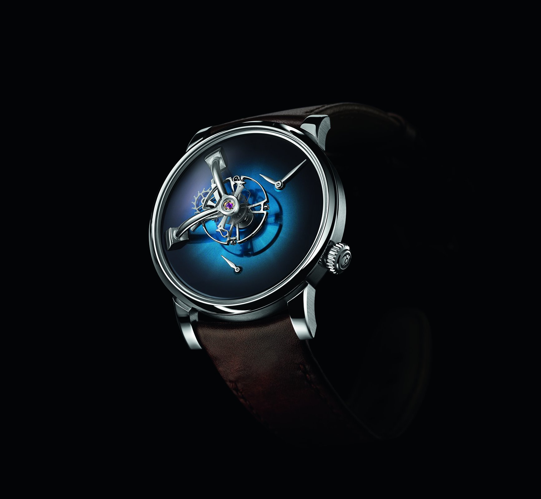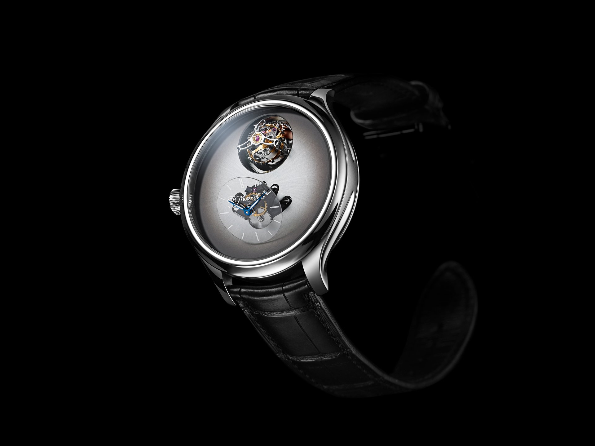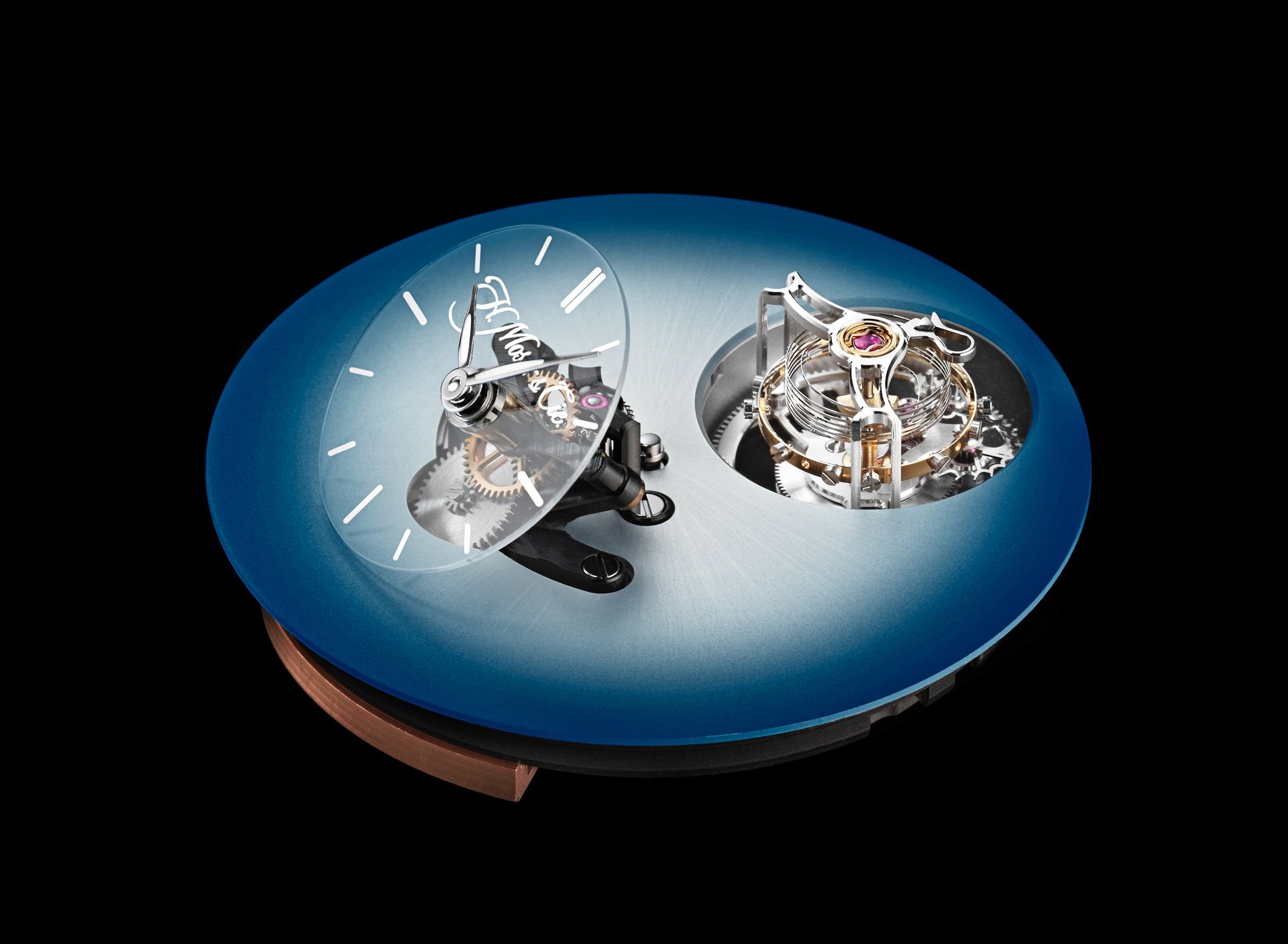 As Edouard Meylan explains: „We have Moserized the MB&F universe by developing a sapphire subdial, which melts into the background so as to highlight the beauty of our fumé dials. And to preserve the purity and elegance of this true work of horological art, we have inscribed our logo like a watermark on the sapphire subdial, thereby underlining the personal character and intimate relationship binding it to its owner“.Endeavour Cylindrical Tourbillon H. Moser × MB&F