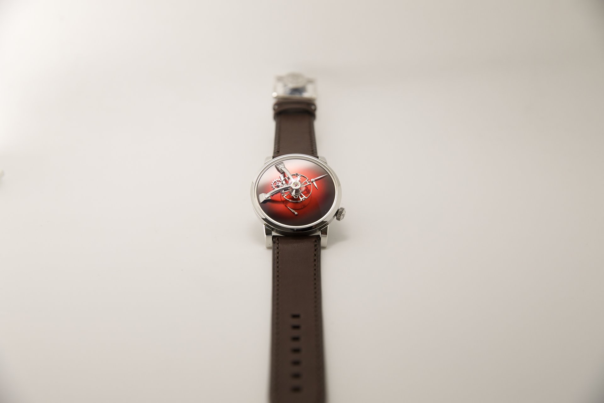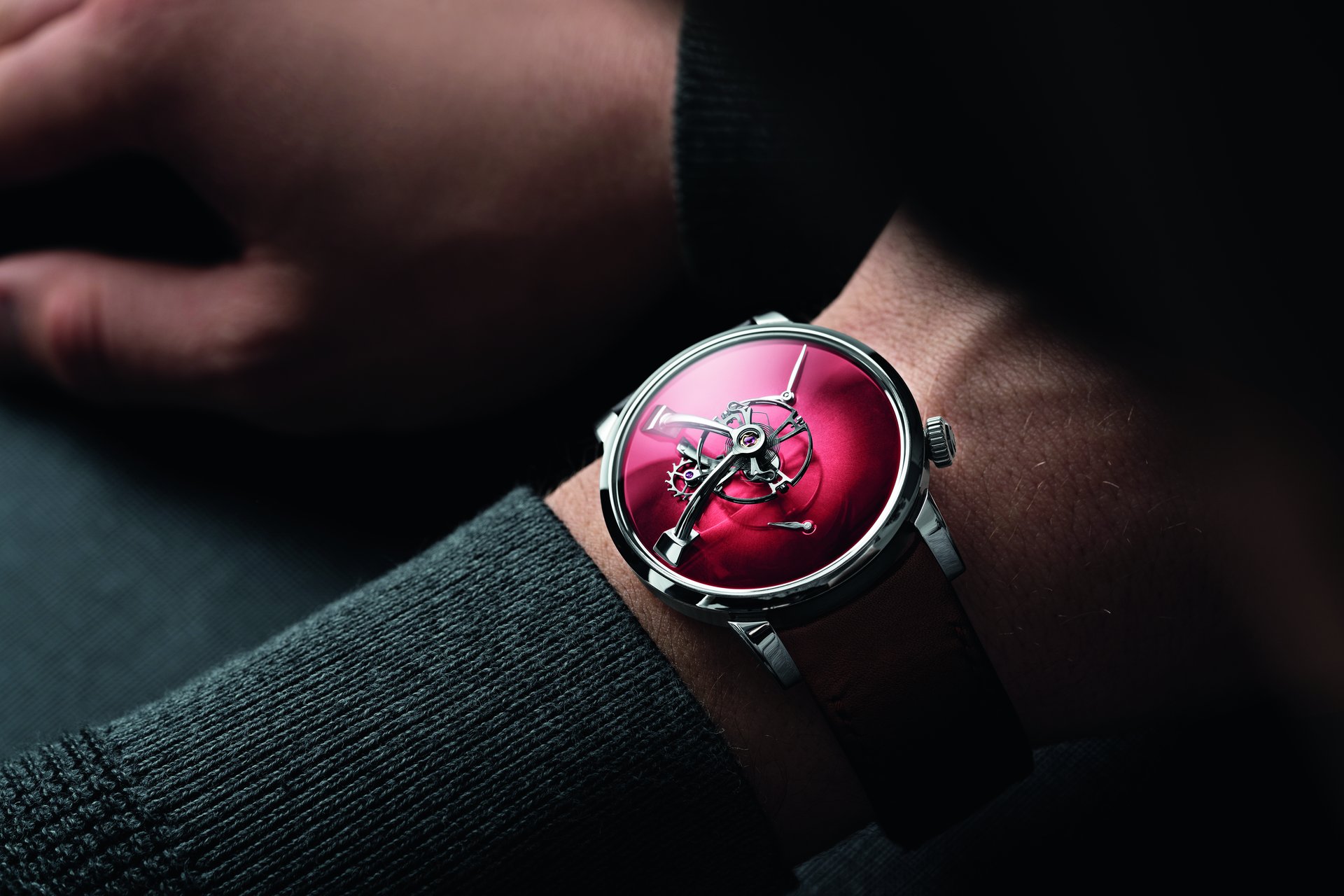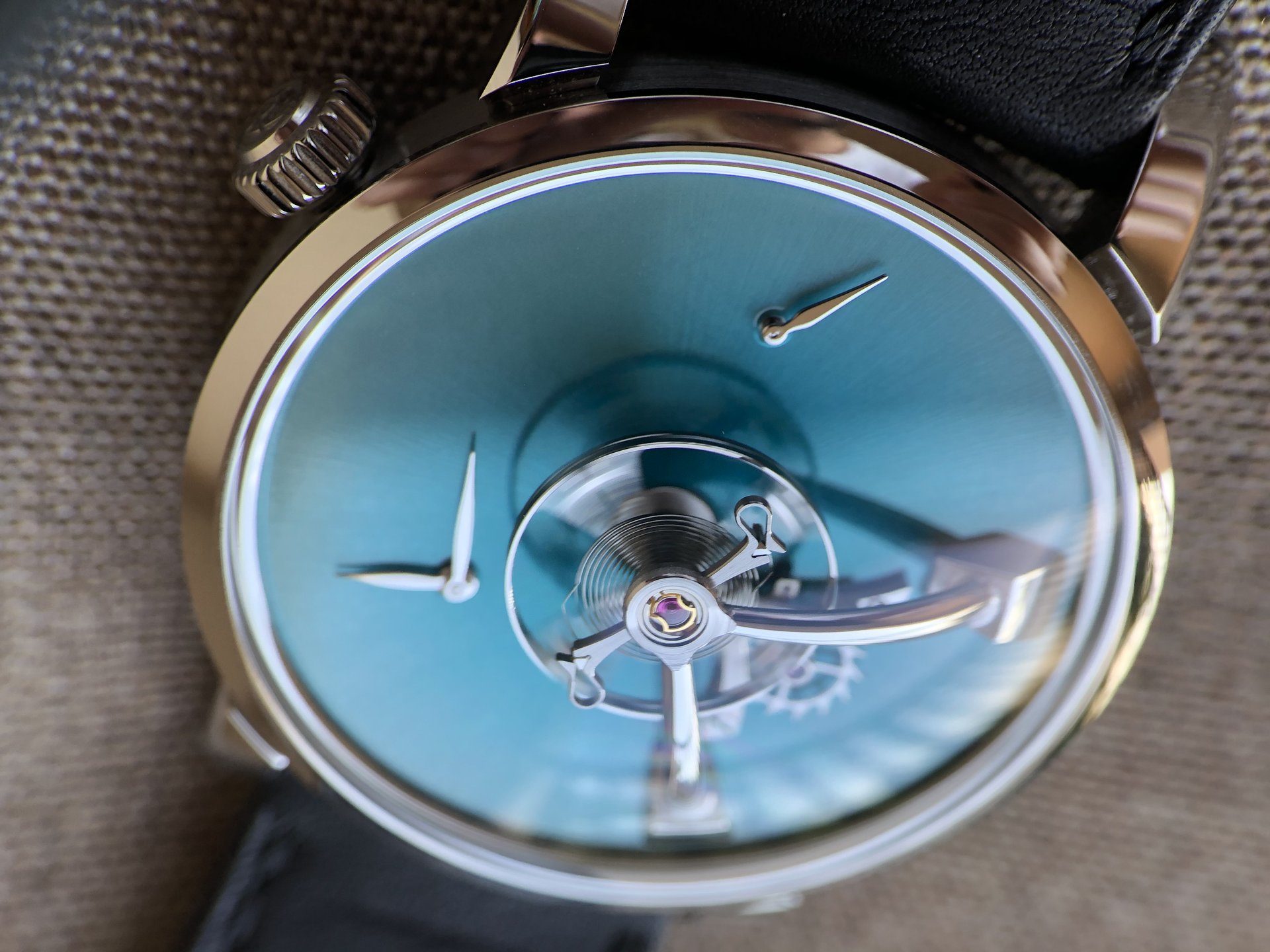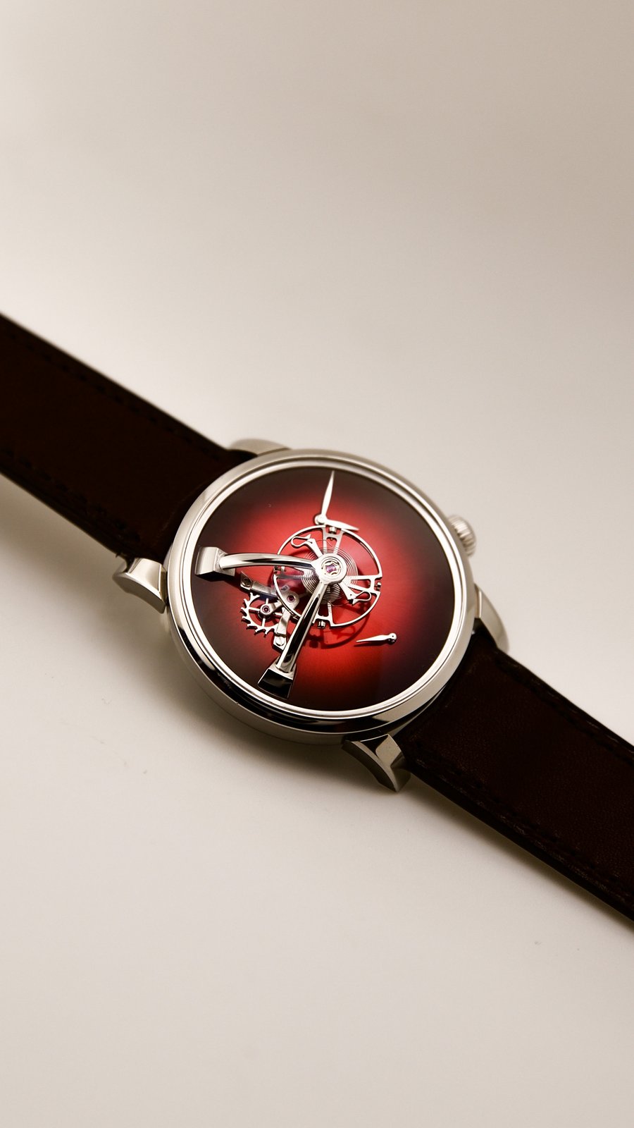 As Edouard Meylan explains: „We have Moserized the MB&F universe by developing a sapphire subdial, which melts into the background so as to highlight the beauty of our fumé dials. And to preserve the purity and elegance of this true work of horological art, we have inscribed our logo like a watermark on the sapphire subdial, thereby underlining the personal character and intimate relationship binding it to its owner“.Endeavour Cylindrical Tourbillon H. Moser × MB&F