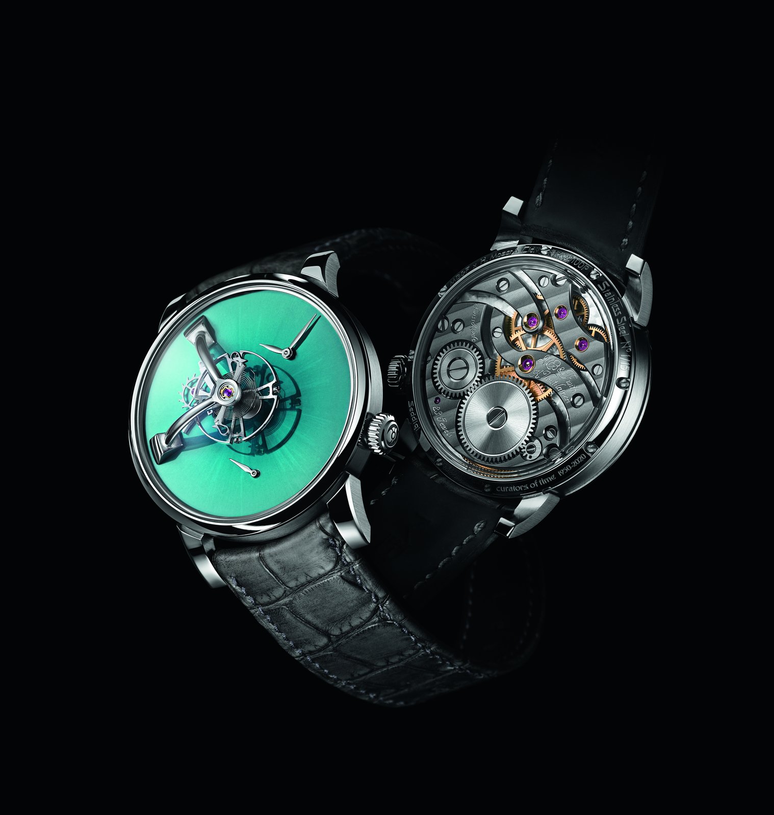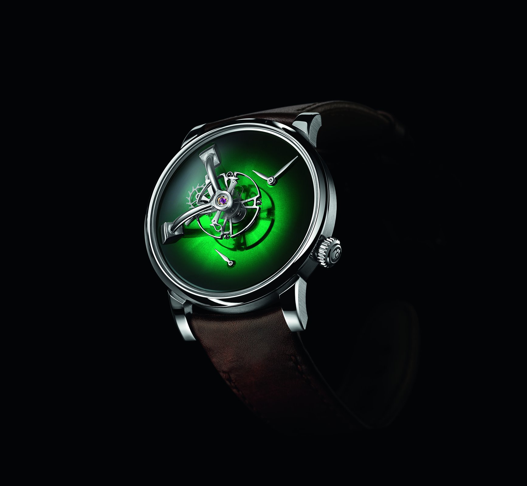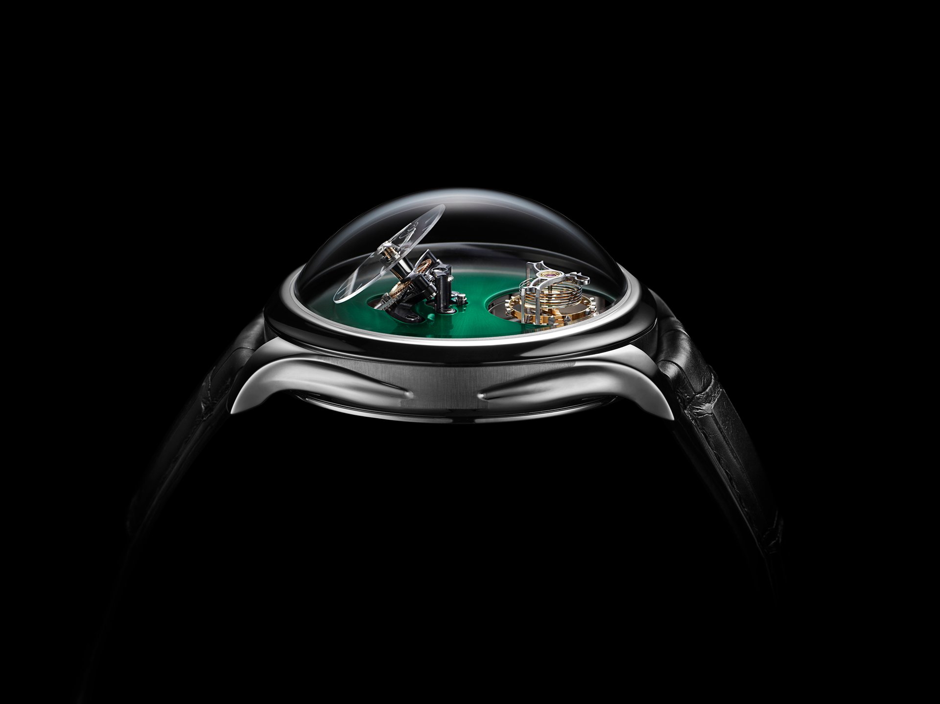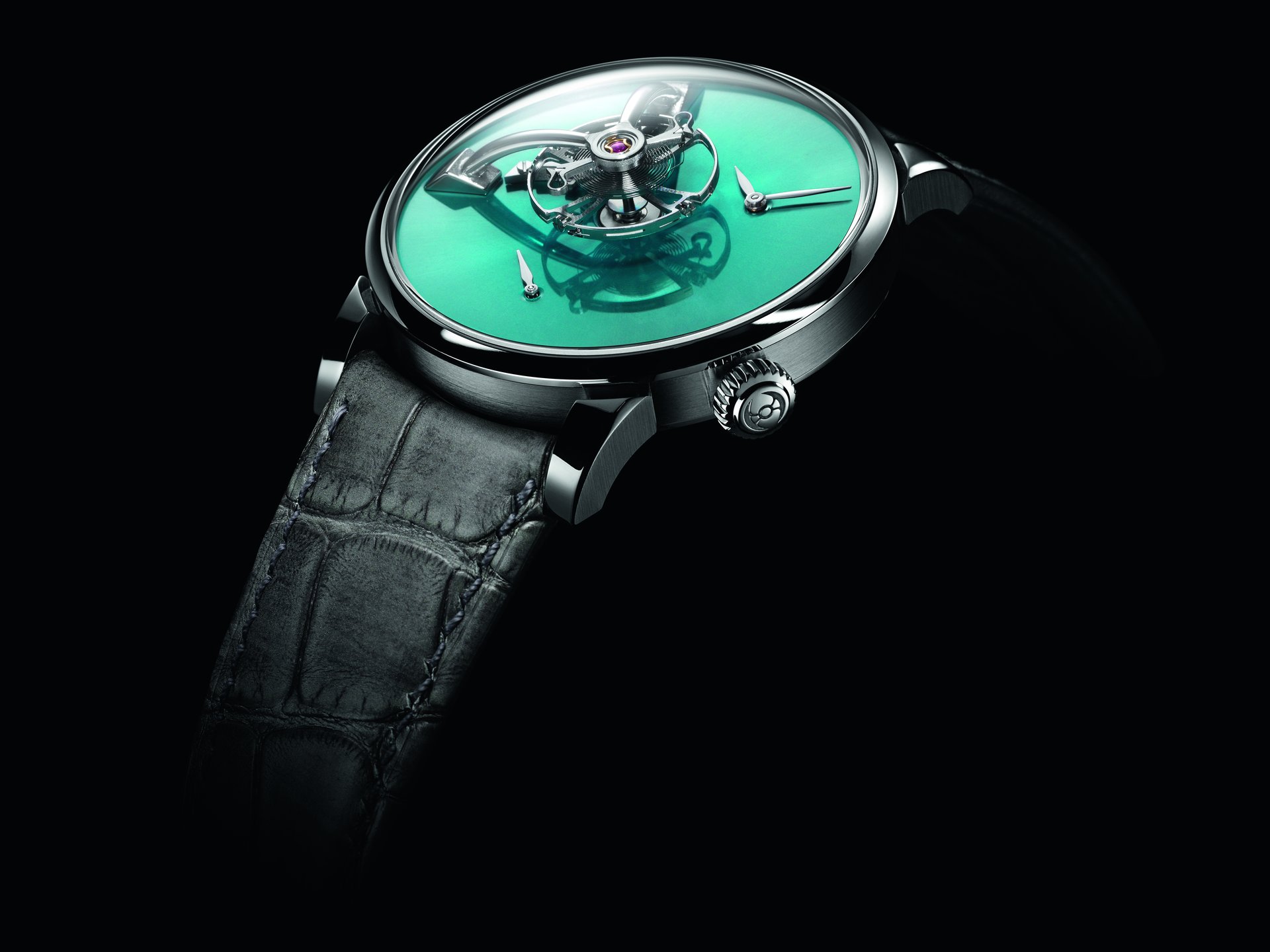 • Steel model, Cosmic Green fumé dial, black alligator leather strap, limited edition of 15 pieces