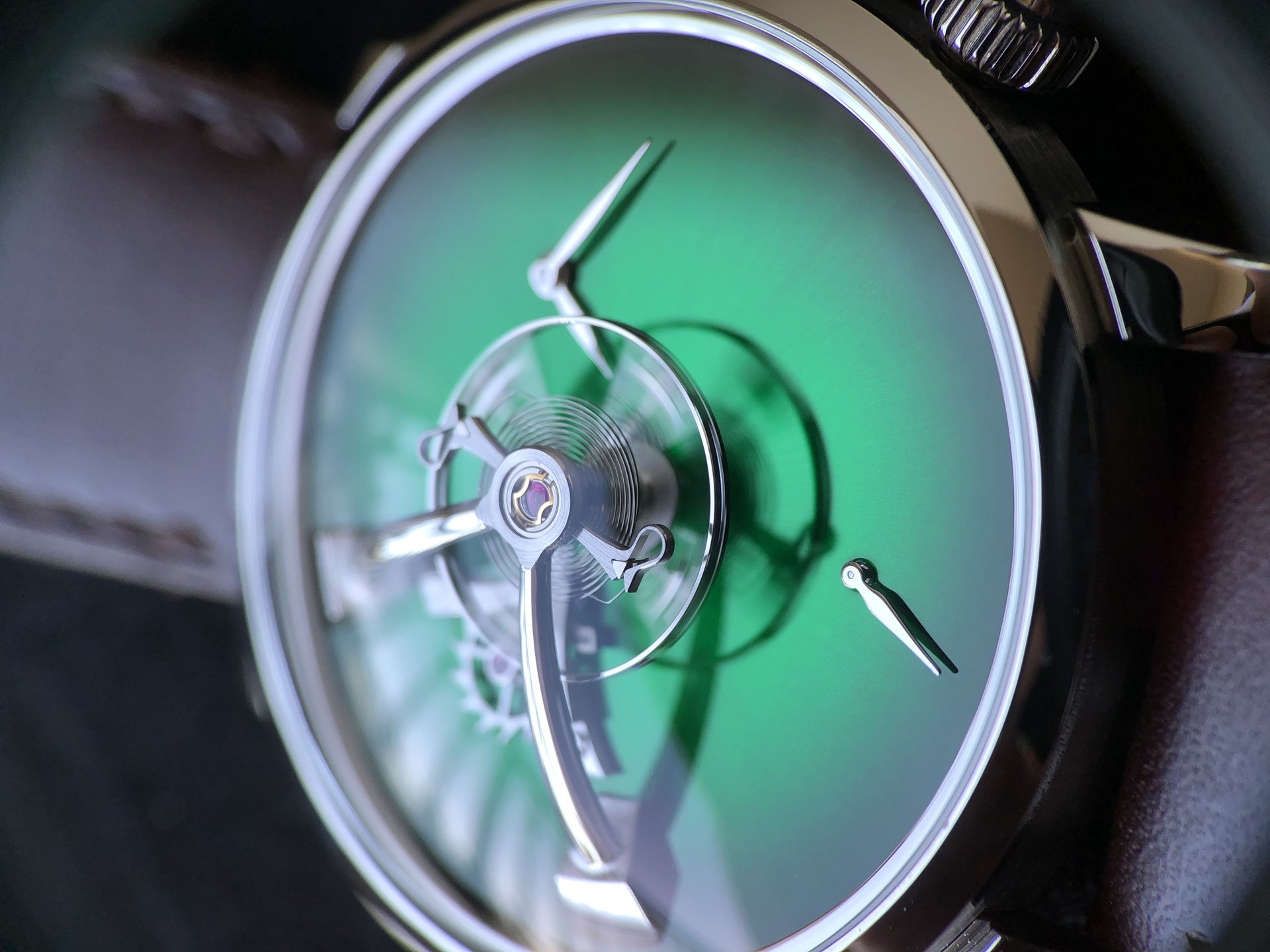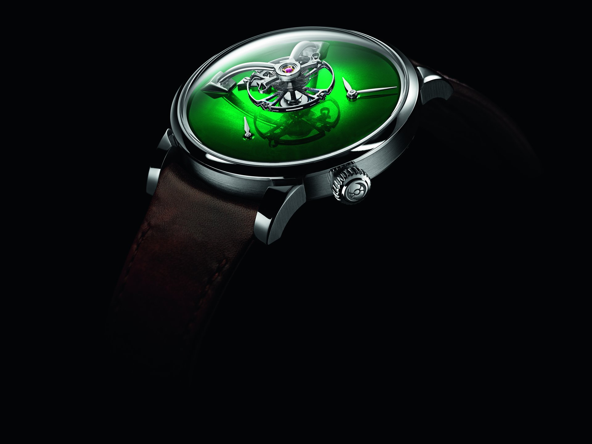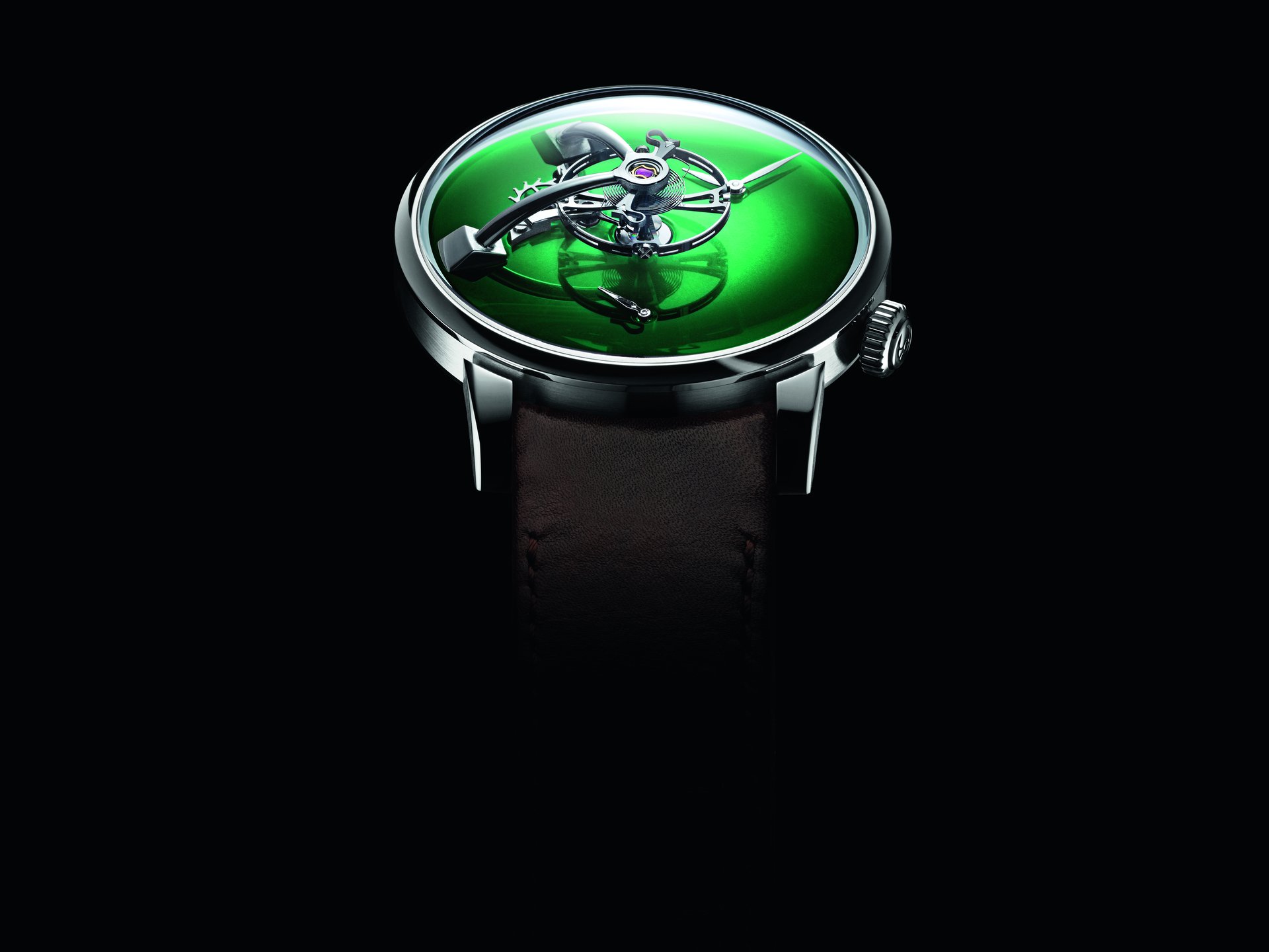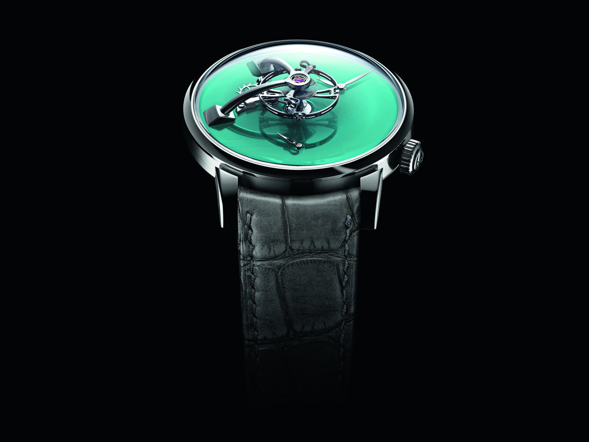 • Steel model, Cosmic Green fumé dial, black alligator leather strap, limited edition of 15 pieces