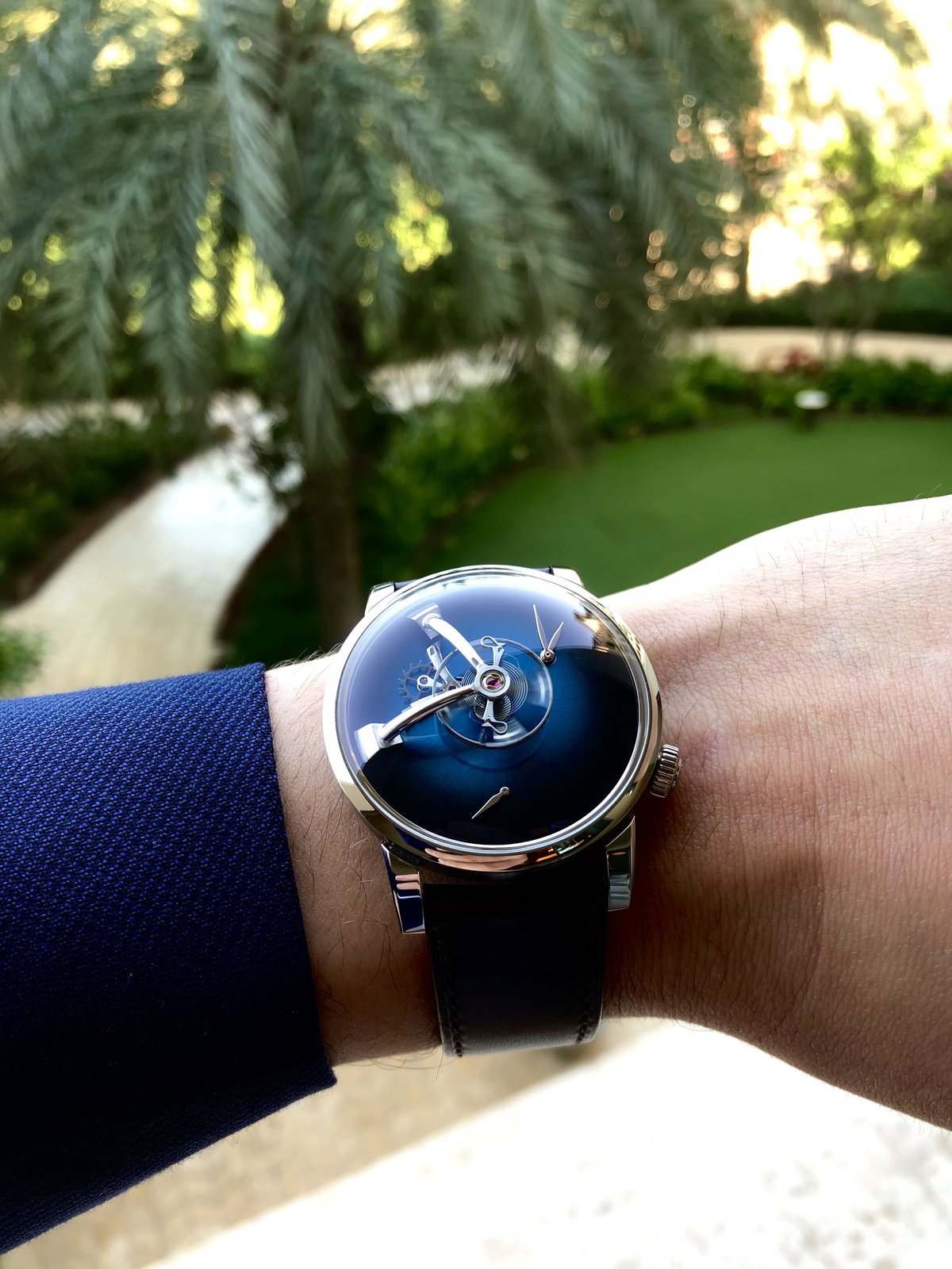 It is therefore not surprising that MB&F asked Edouard Meylan to take part as a „friend“ to help create a Performance Arts piece. The latest aspect of this collaboration lies in its being a two-way street. Maximilian Büsser says: „When I called Edouard to tell him that I wanted to collaborate on a creation, I mentioned that I really liked the double balance-spring, the Moser fumé dials and the Concept watch series. Edouard immediately told me that he would let me borrow these features, but on condition that he could also reinterpret one of my machines. After an initial moment of surprise, I gave it some thought. Being 50% Indian and 50% Swiss, I am firmly convinced that mixing DNA creates interesting results, so why not try the experiment in watchmaking? I therefore agreed and suggested the FlyingT model, which is particularly dear to my heart.