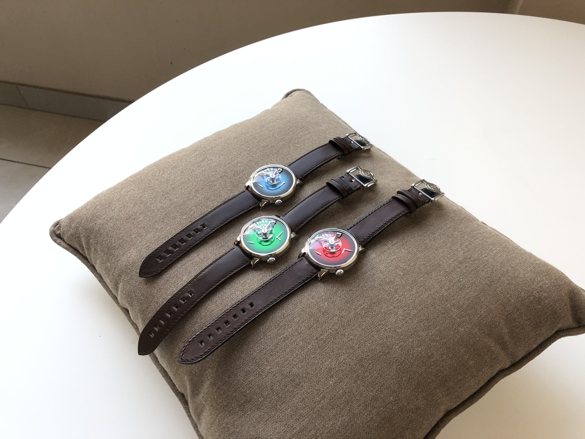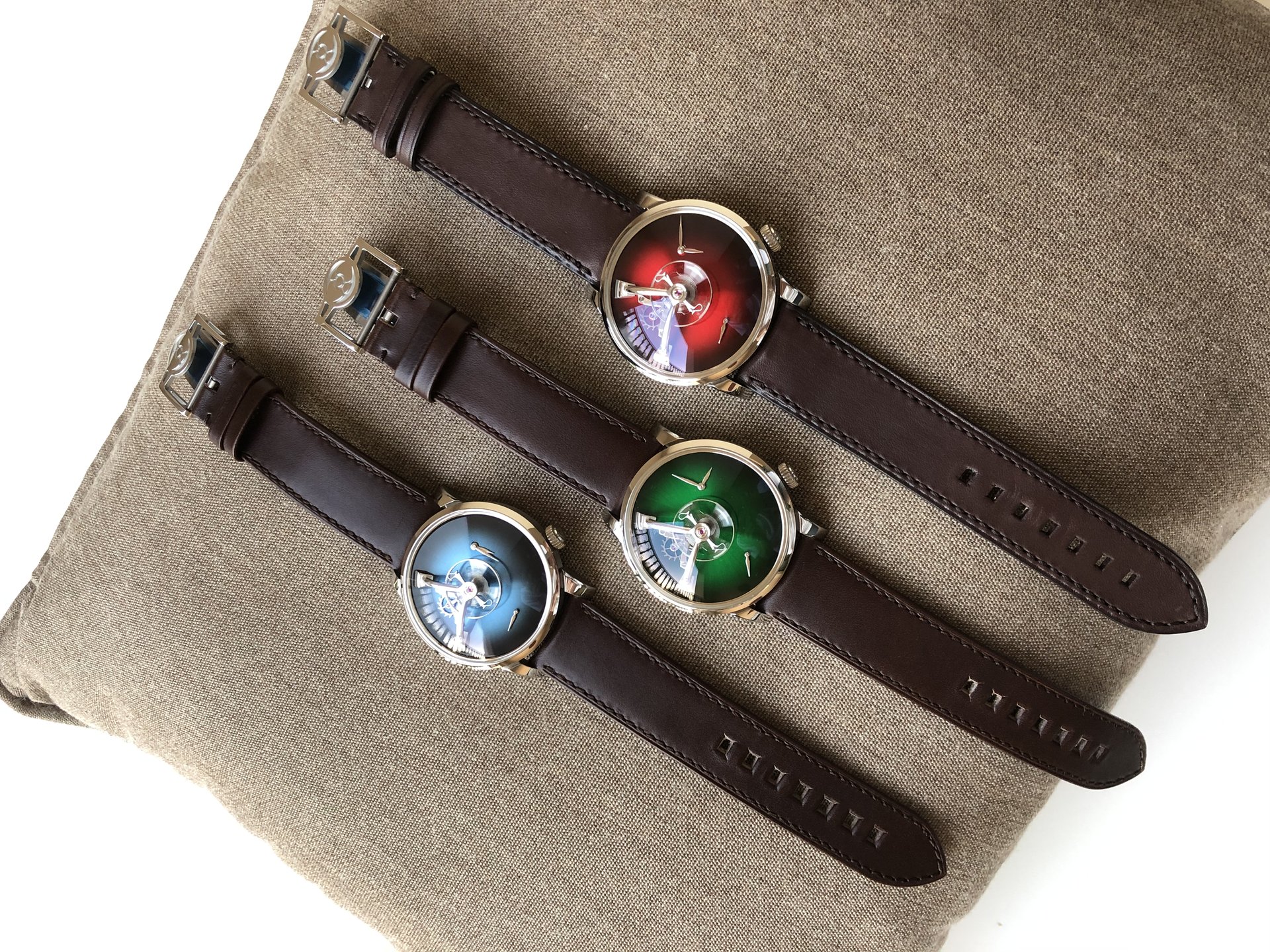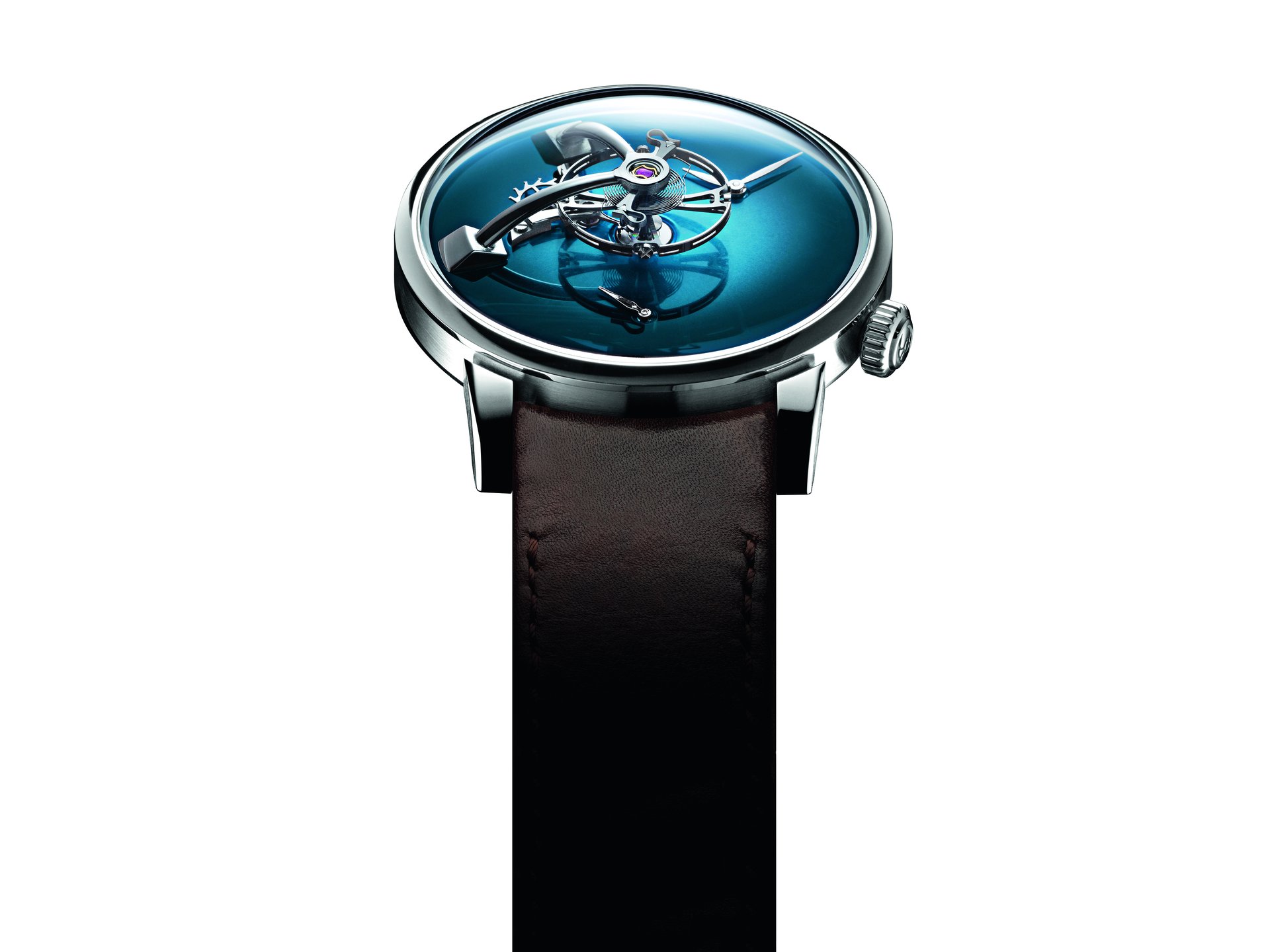 Available in five different versions, the Endeavour Cylindrical Tourbillon H. Moser × MB&F model comes in a steel case topped by Funky Blue, Cosmic Green, Burgundy, Off-White or Ice Blue dials, all of the fumé variety.