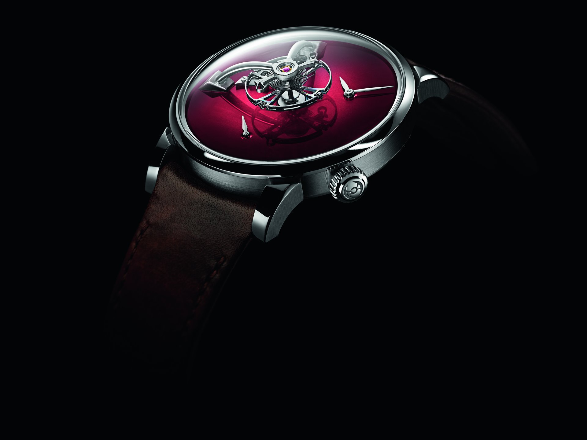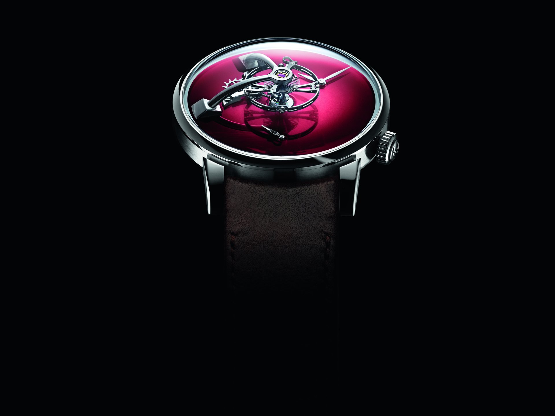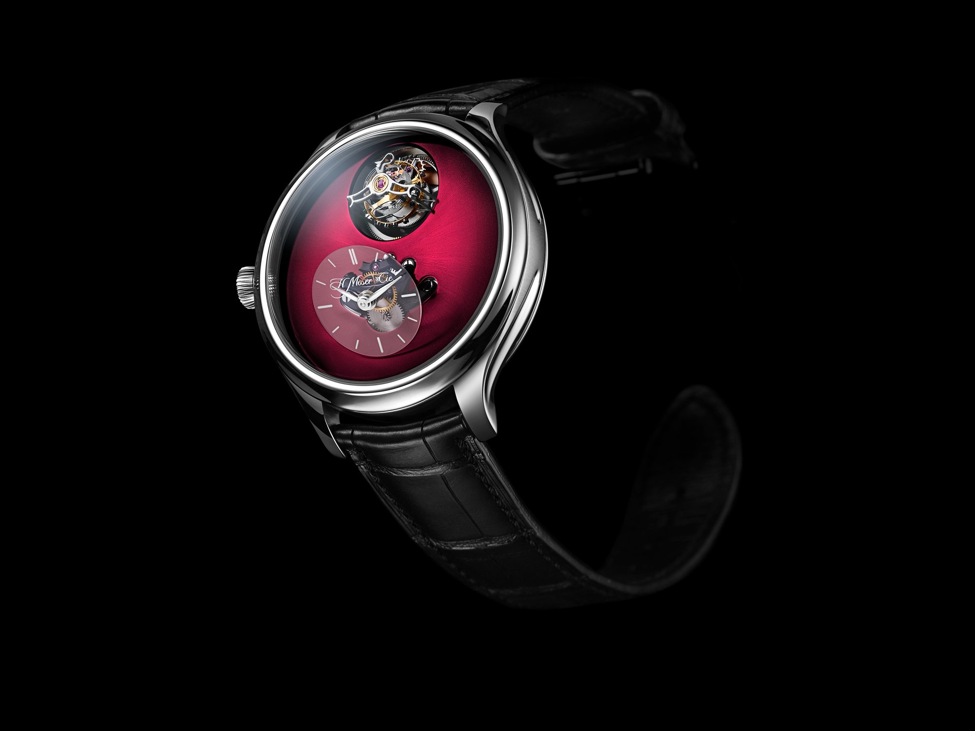 • Steel model, Burgundy fumé dial, black alligator leather strap, limited edition of 15 pieces