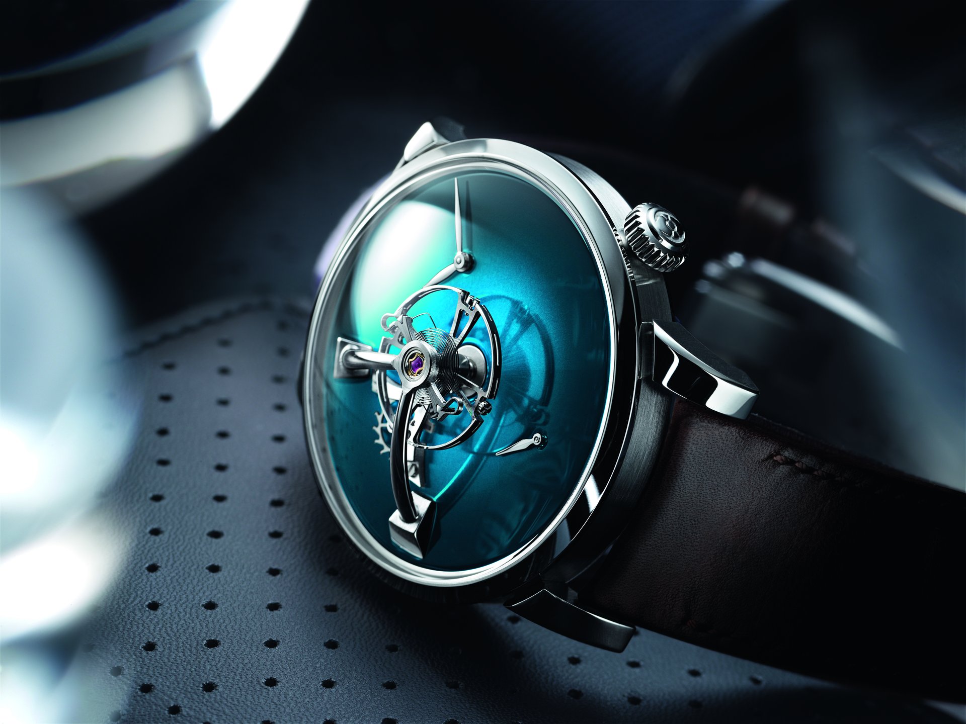 • One-minute flying tourbillon at 12 o’clock with skeletonised bridges