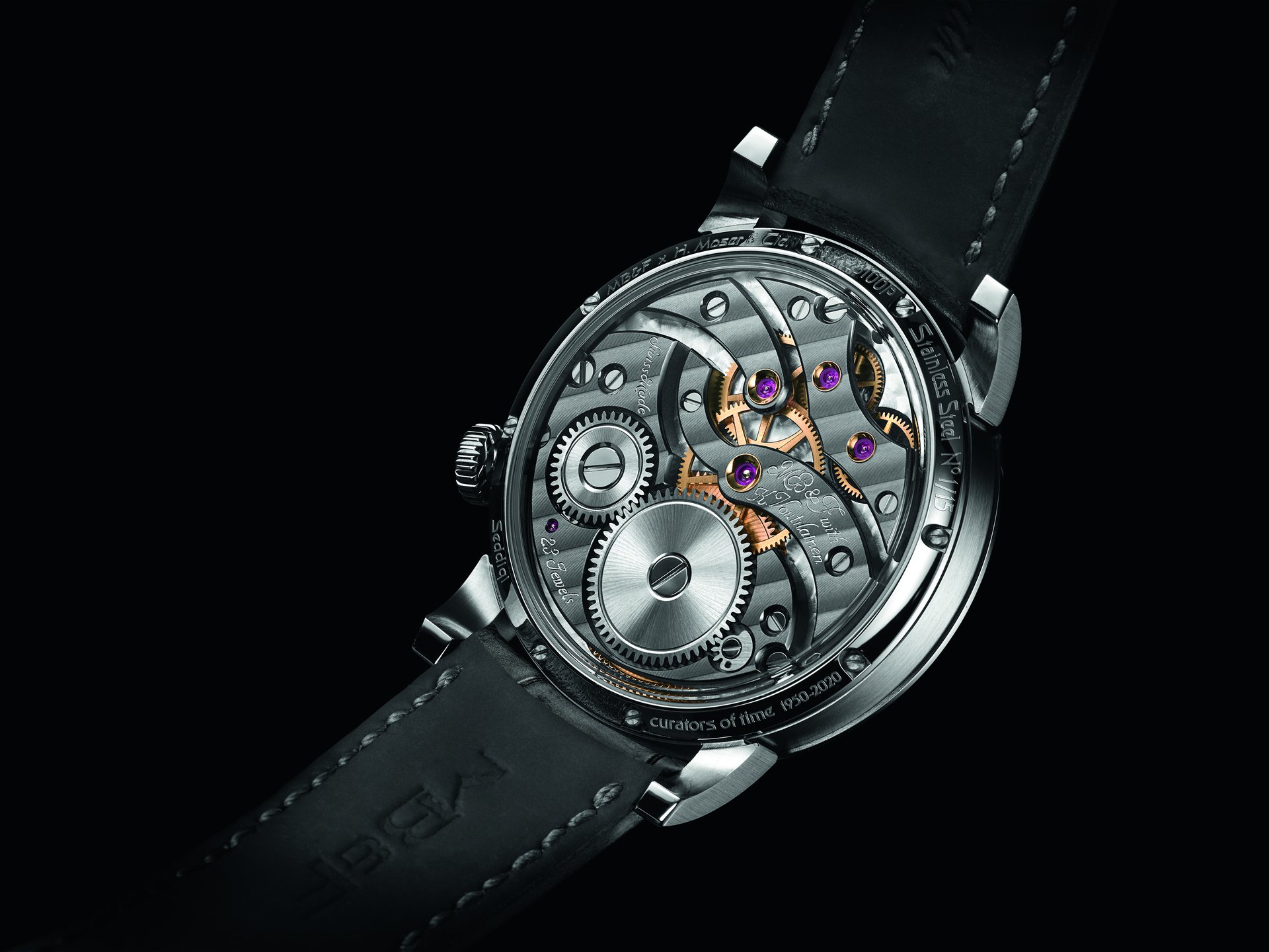 • Fine finishing: superlative 19th century-style hand finishing throughout; internal bevel angles highlighting hand craft; polished bevels; Geneva waves; hand-made engravings, NAC black bridges