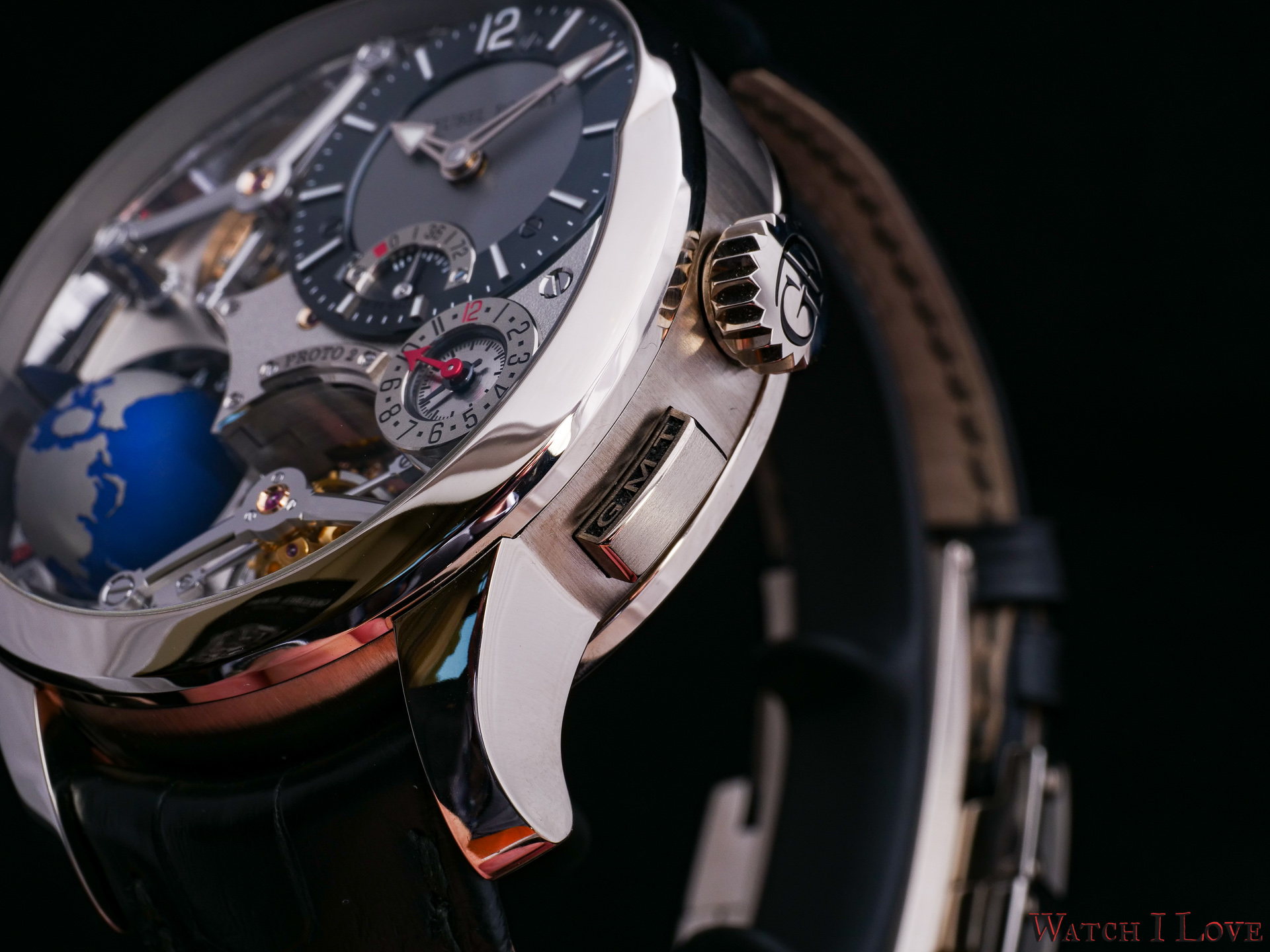 The right side of the case features the crown in the traditional position, the GMT pusher at approx. 4 o’clock and the second protuberance fitting the actual time-telling dial.
