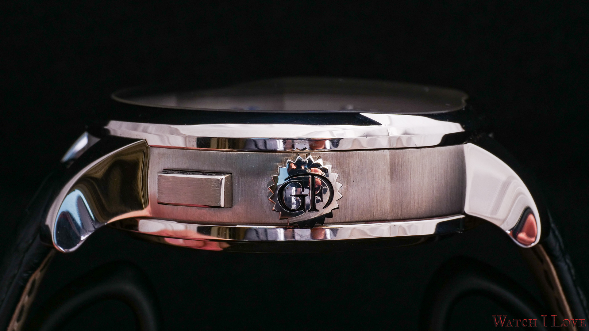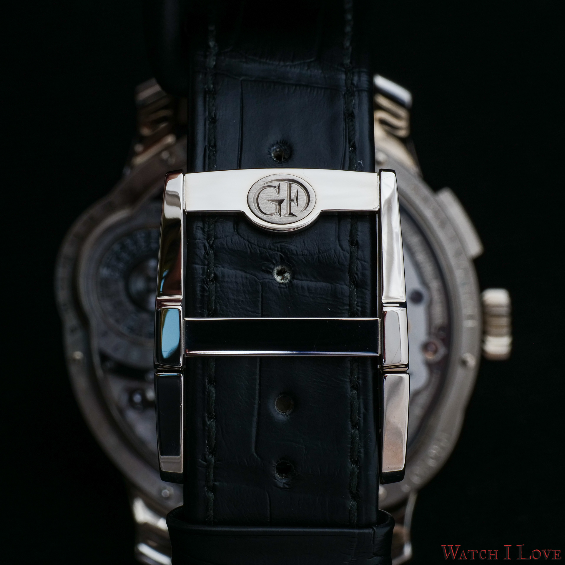 The watch is fitted a hand-sewn alligator strap and white gold folding clasp decorated with a hand-engraved with the GF logo medalion.