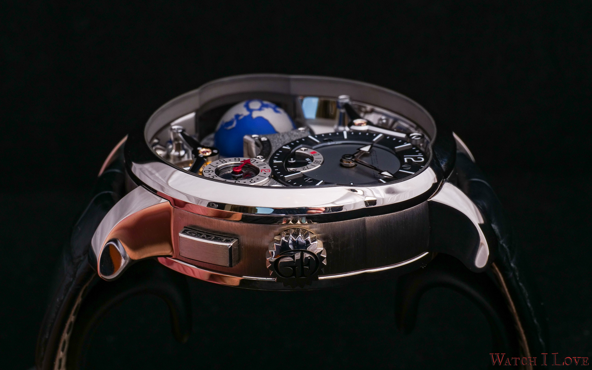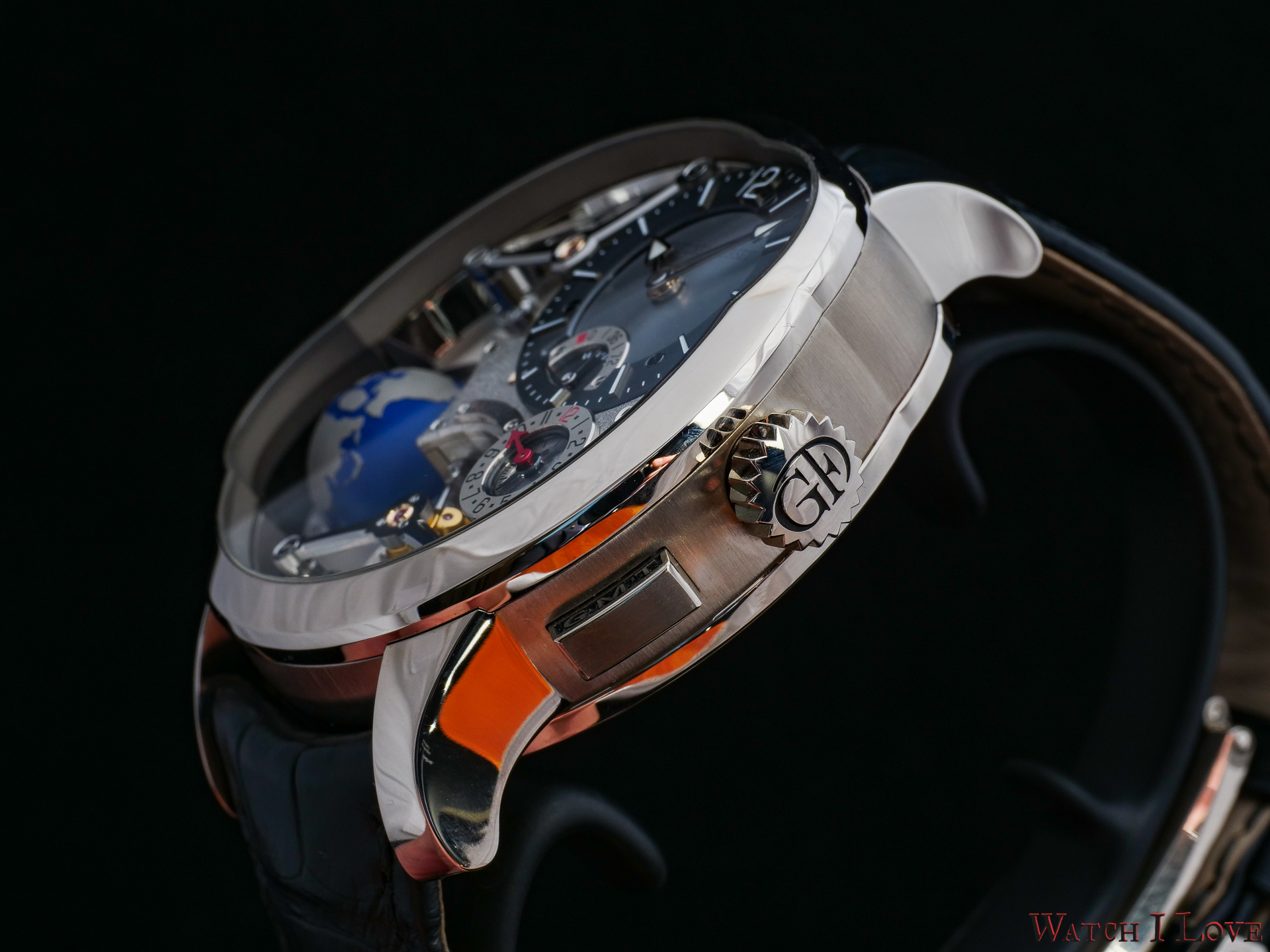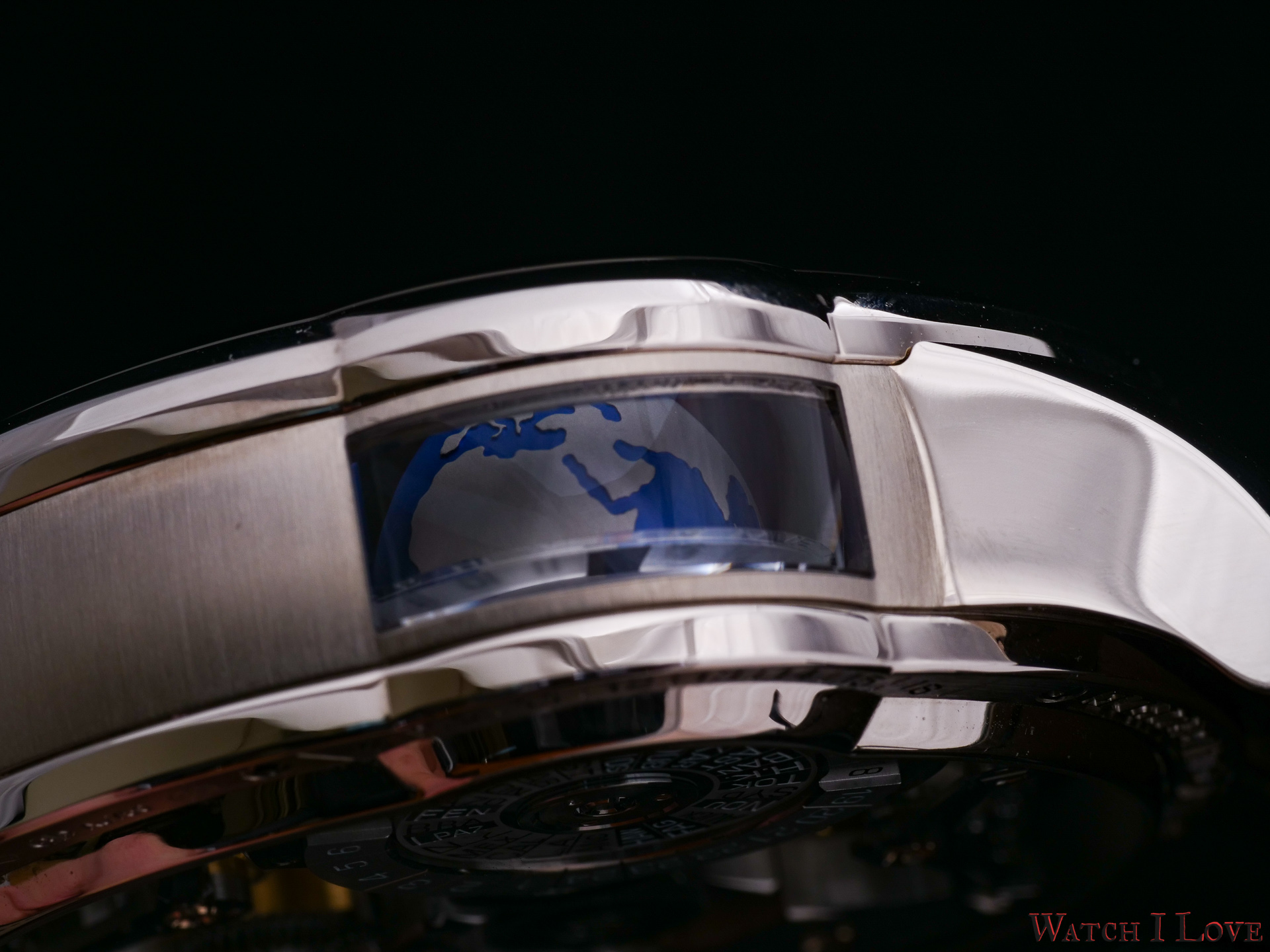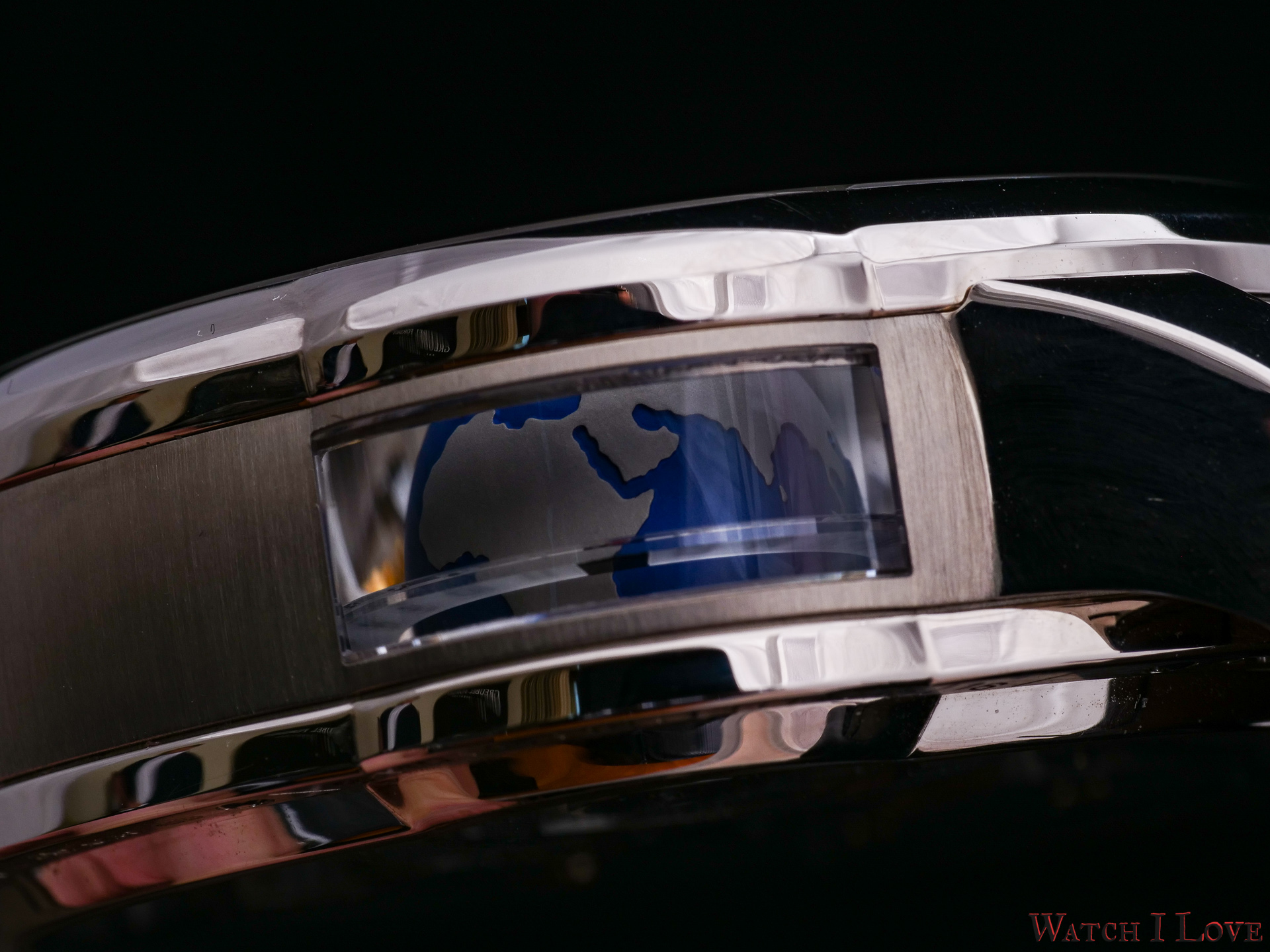 The slightly curved caseband suffered a vertical brushing, while the rest of the case’s elements are mirror polished. Between 8 and 9 o’clock we find the first protuberance. Behind a curved crystal is visible the GMT sapphire disk and the Earth.