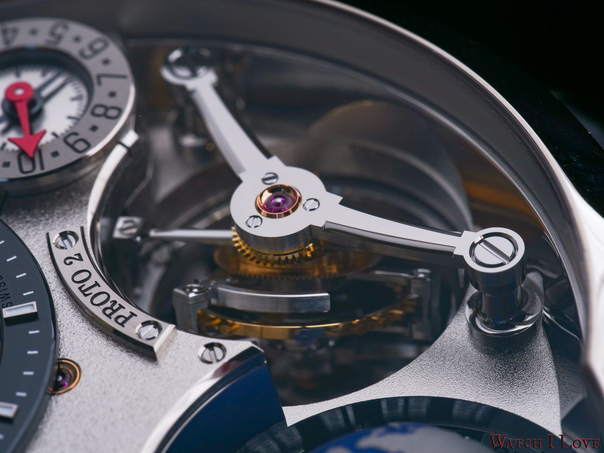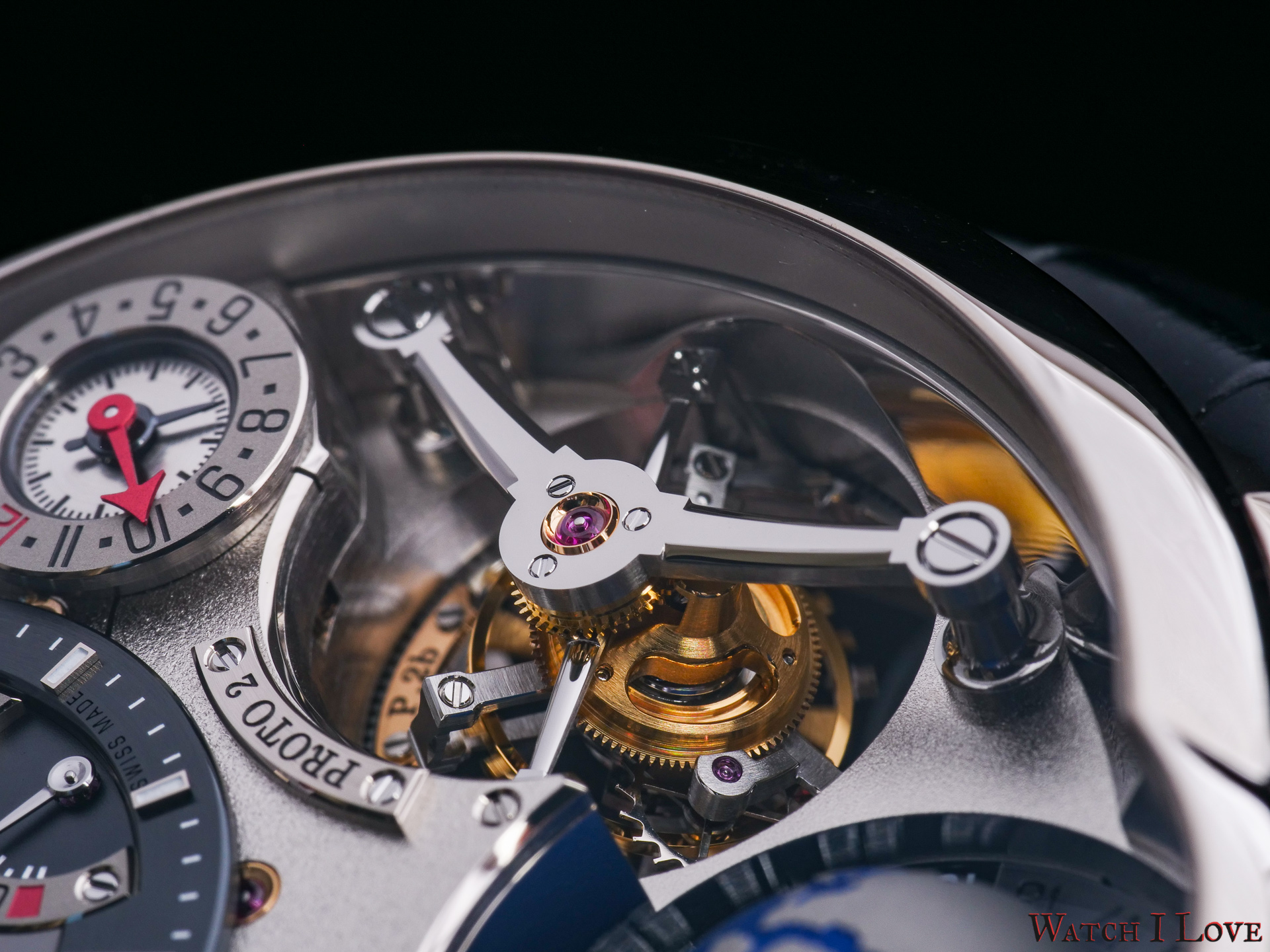 The four tourbillons, organised in two pairs are placed on a 30° angle on the sides of the GMT blue planet. The mirrored cages have different rotations speeds. The first cage is rotating in one minute. The second upright cage performs a full rotation in four minutes.