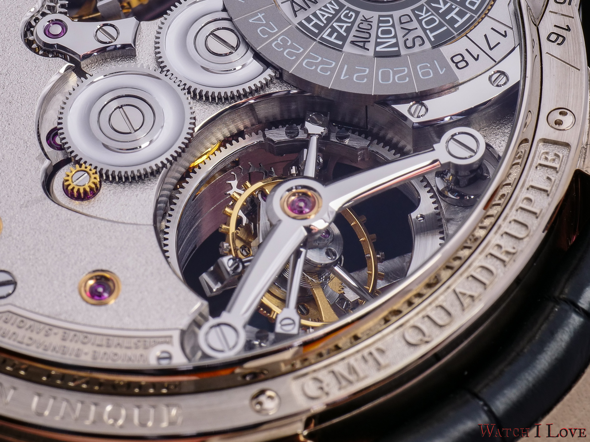 So you take the already technically exceptional Quadruple Tourbillon and the gorgeous GMT and put them together. The result is a spectacle reserved for a few. The breathtaking show is split partly to theatrical construction, partly to the finishes. The brand “throw” of finishes makes watchmaking looks easy. We all know (or we must) that is not that easy. The amount of work involved is partly unpaid.
