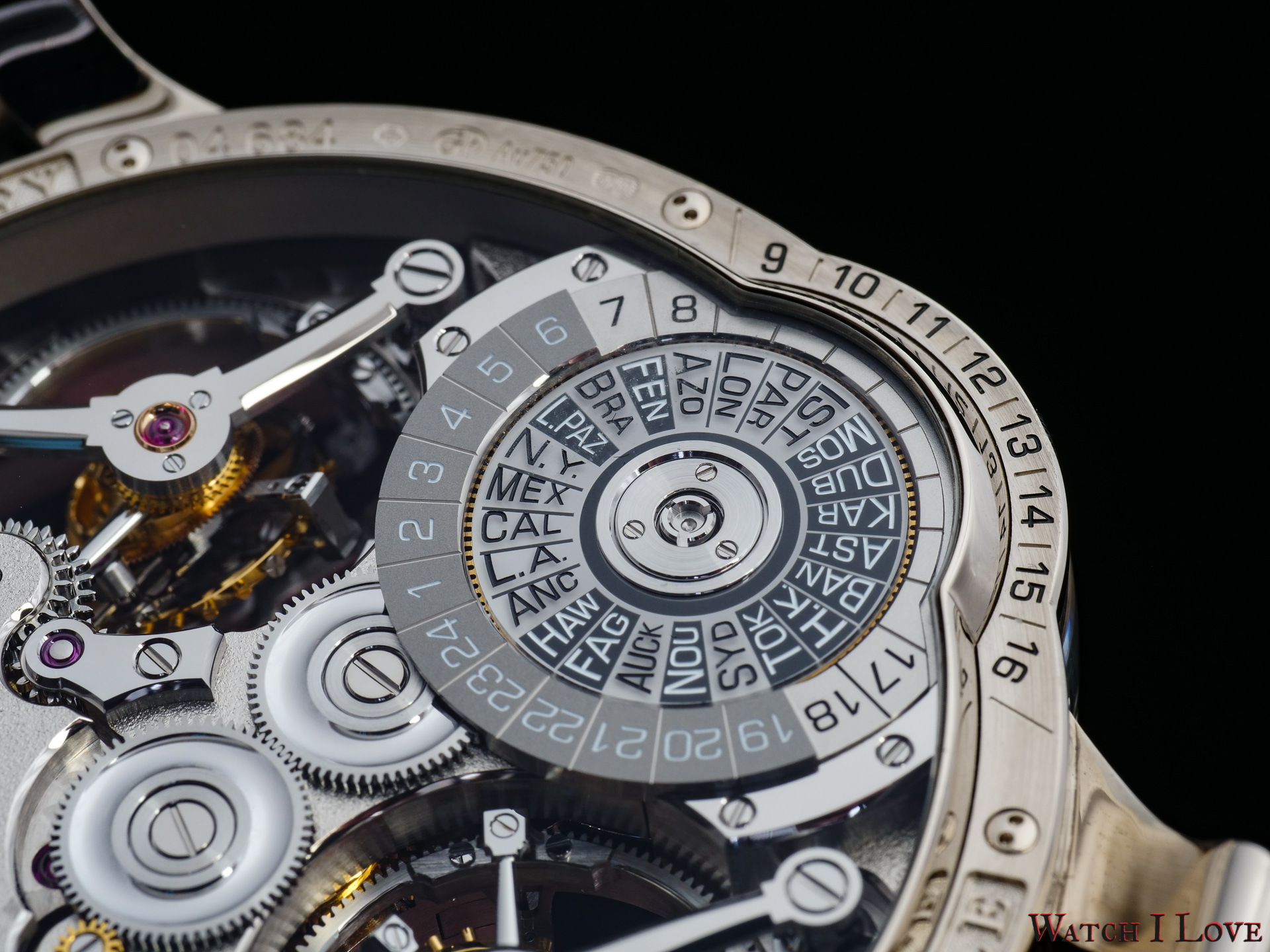 On the backside, there is a second dial displaying the universal time with a fixed 24 hours scale (again with day/night indication) and a disk bearing 24 cities observing summer time (Daylight Saving Time) appearing in a light colour.